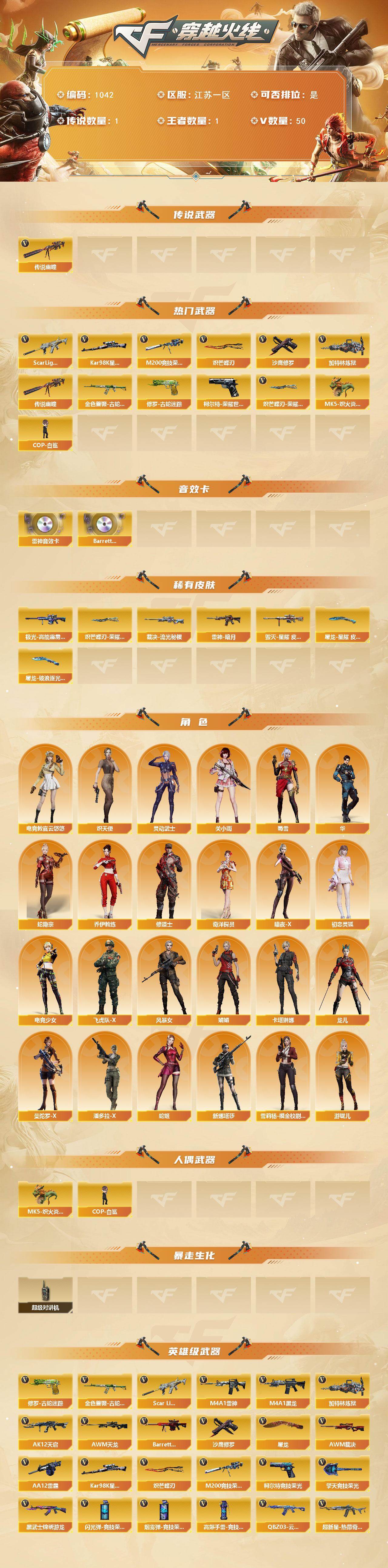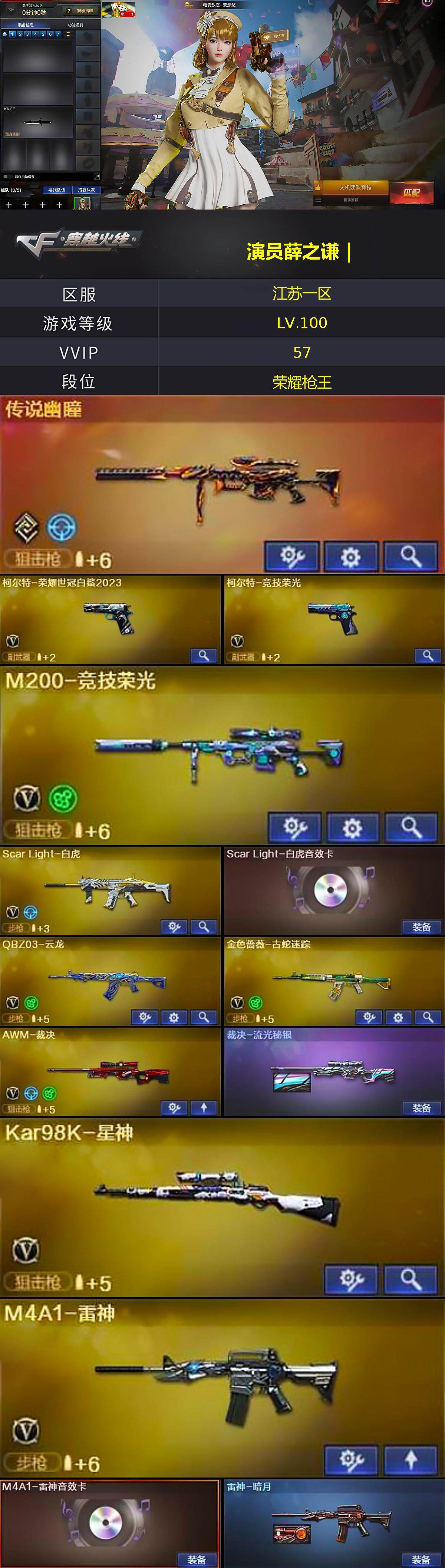 [14721816]江苏一区-50V-1王者-0炫金 【传说武器】:传说幽瞳 【热门武器】:传说幽瞳,Scar Light-白虎,柯尔特-荣耀世冠白鲨2023,金色蔷薇-古蛇迷踪,修罗-古蛇迷踪,M200-竞技荣光,Kar98K-星神,加特林-炼狱,MK5-炽火炎龙,COP-白鲨,沙鹰-修罗*2,炽芒蝶刃,炽芒蝶刃-荣耀世冠白鲨2023 皮肤 【音效卡】:M4A1-雷神音效卡,Barrett-碧霄极光音效卡 【皮
