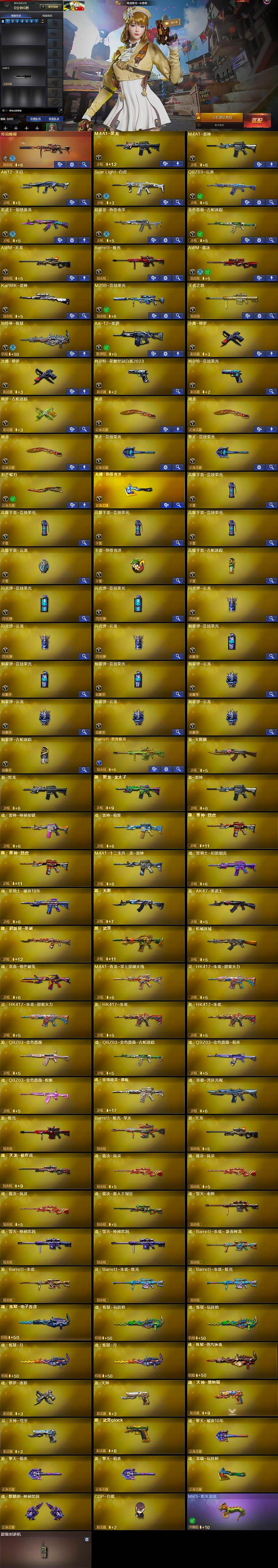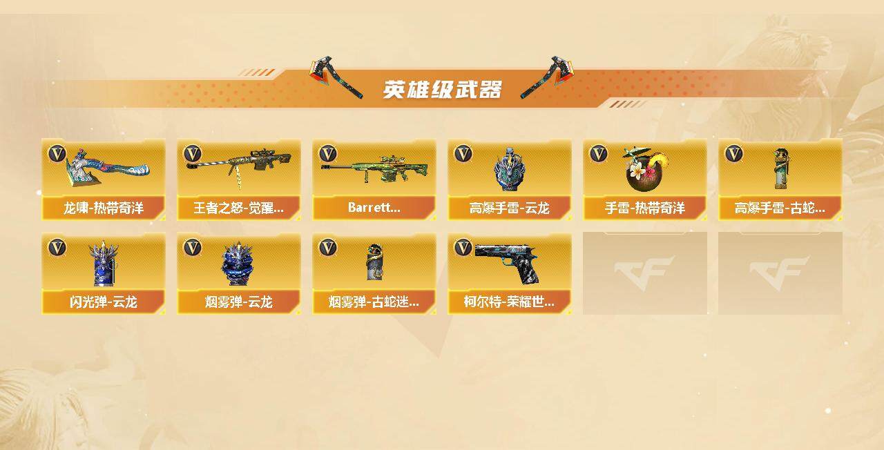 【热门武器】:传说幽瞳,Scar Light-白虎,柯尔特-荣耀世冠白鲨2023,金色蔷薇-古蛇迷踪,修罗-古蛇迷踪,M200-竞技荣光,Kar98K-星神,加特林-炼狱,MK5-炽火炎龙,COP-白鲨,沙鹰-修罗*2,炽芒蝶刃,炽芒蝶刃-荣耀世冠白鲨2023 皮肤