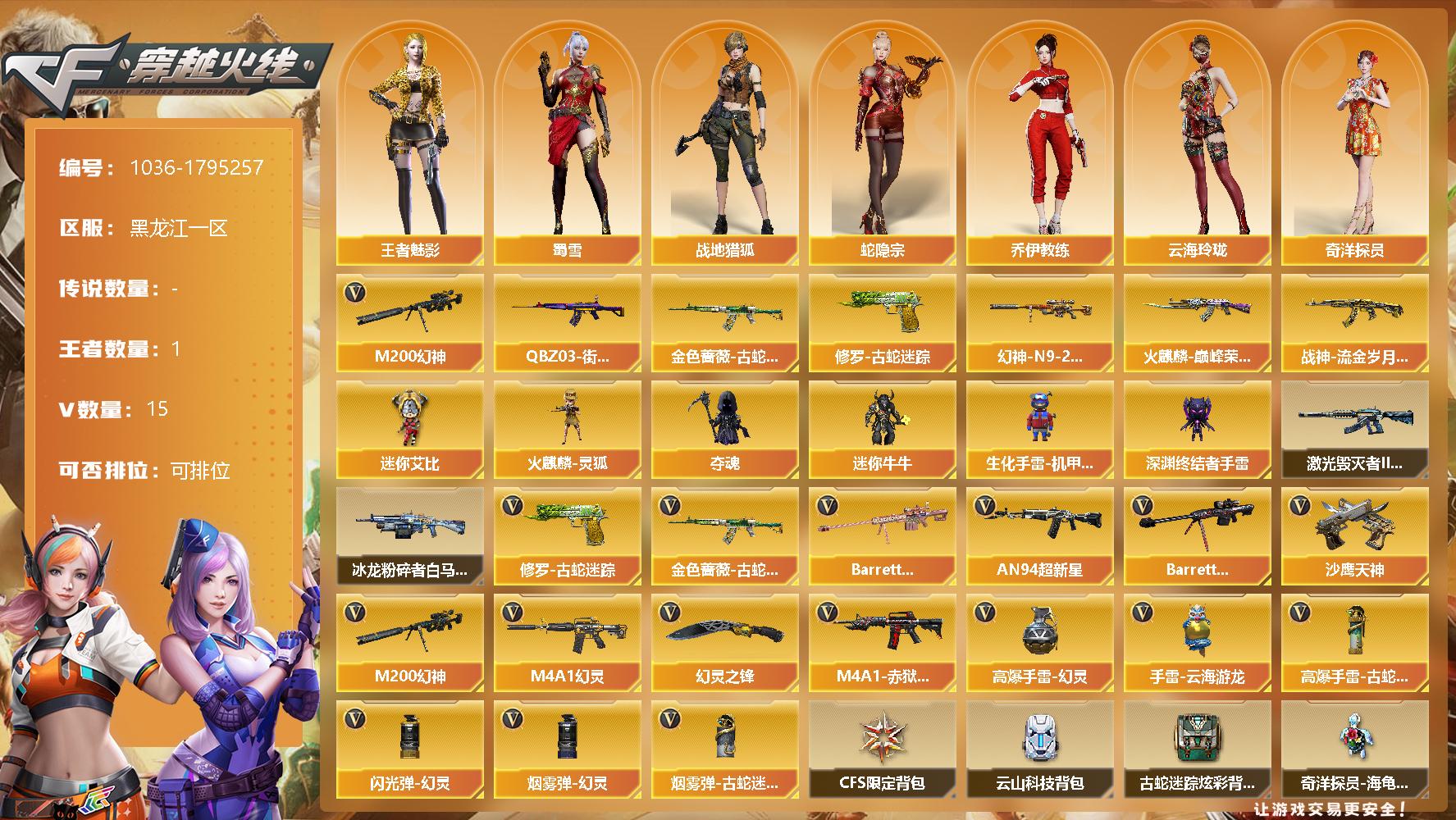 [14722470]黑龙江区-15V-1王者-0炫金 【热门武器】:M200-幻神,金色蔷薇-古蛇迷踪,修罗-古蛇迷踪,QBZ03-街机 【皮肤】:M200-幻神-N9-2022MVP,火麒麟-巅峰荣耀,战神-流金岁月皮肤 【角色】:战地猎狐,王者-魅影,蛇隐宗,奇洋探员,乔伊教练,云海玲珑,电竞少女,风暴女*2,兰妹妹,灵狐-花神,灵狐者-X,灵狐者-七夕宝贝,曼陀罗-礼服,蛇姬,斯沃特-X,蜀雪,兔囡囡 【人