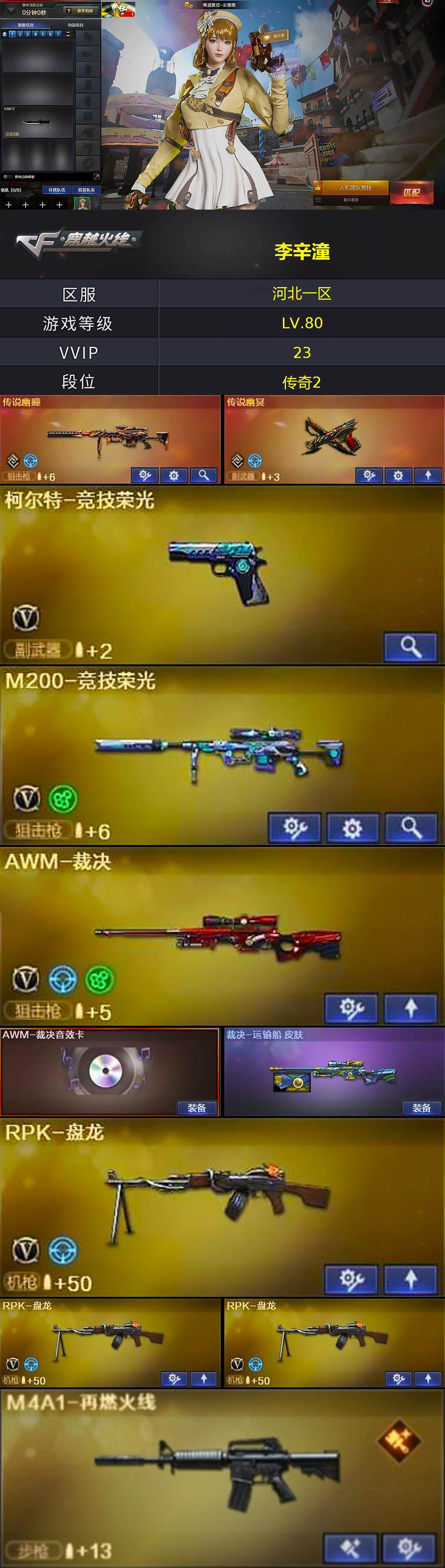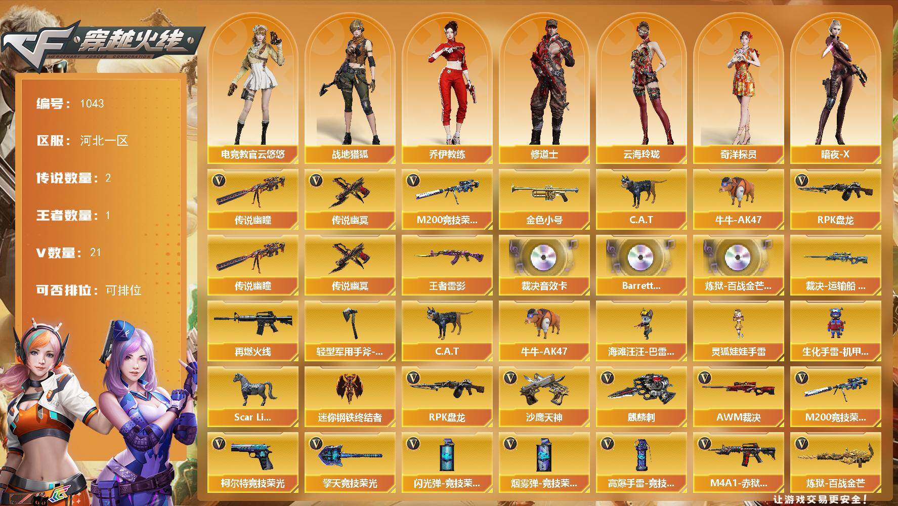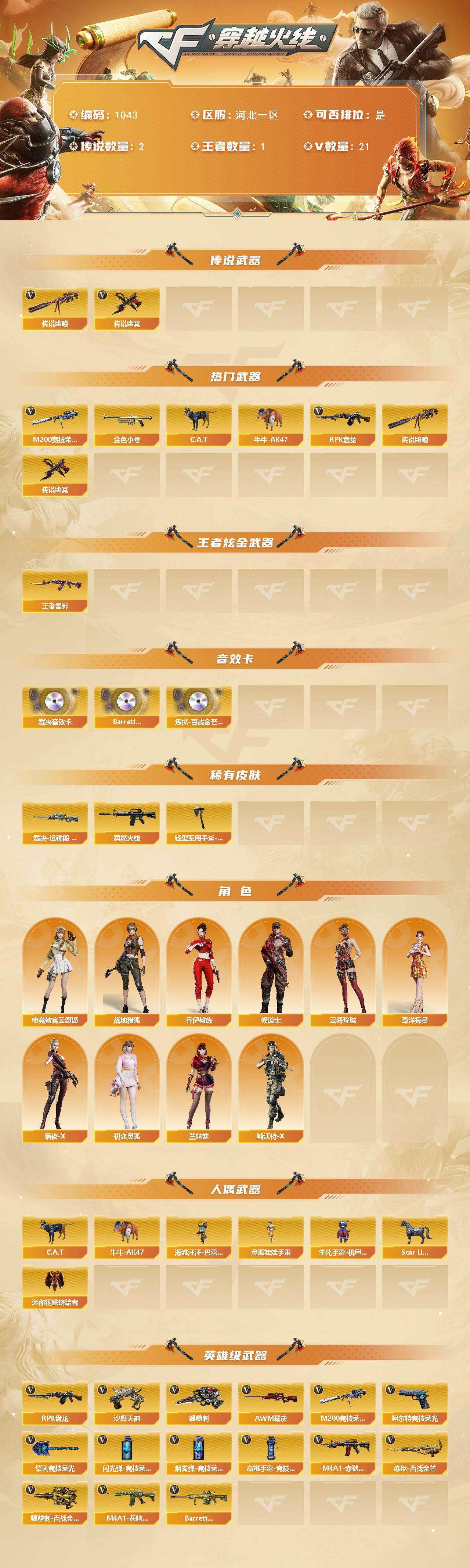 [14723672]河北一区-21V-1王者-0炫金 【传说武器】:传说幽瞳,传说幽冥 【热门武器】:传说幽瞳,传说幽冥,M200-竞技荣光,金色小号,C.A.T,牛牛-AK47,RPK-盘龙*3 【王者炫金武器】:王者雷影 【音效卡】:AWM-裁决音效卡,Barrett-碧霄极光音效卡,炼狱-百战金芒-庆典舞曲音效卡 【皮肤】:裁决-运输船 皮肤,M4A1-再燃火线,轻型军用手斧-再燃火线 【角色】:电竞教官-云悠悠,战地猎狐,奇洋探员,乔伊教练,修道士,云海玲珑,暗夜-X,初恋灵狐,兰妹妹,斯沃特-X 【人偶武器】:迷你钢铁终结者,Scar Light-马枪,海滩汪汪-巴雷特,C.A.T,牛牛-AK47,生化手雷-机甲核心*2,灵狐娃娃手雷 【英雄级武器】:AWM-裁决,M200-竞技荣光,RPK-盘龙*3,炼狱-百战金芒,沙鹰-天神,柯尔特-竞技荣光,麒麟刺,擎天-竞技荣光,麒麟刺-百战金芒,高爆手雷-竞技荣光,闪光弹-竞技荣光,烟雾弹-竞技荣光,M4A1-赤狱骑士,M4A1-苍鸣雷神,Barrett-碧霄极光 【道具】:BS战队炫彩背包,云山科技背包,女皇终结者-背包,炫彩背包-诺拉,炫彩背包,百战金芒炫彩背包,背包-洛丽塔,女皇终结者-魔龙之吻,救世主-黑桃战神,绿色巨人,灵魂忍者,迷雾幽灵,夺命之镰,防化服*3,流光-鎏金之域,流光-再燃火线,枪王排位29赛季金色流光,语音特效-盛典烟火,萌萌小葵表情,炽雪表情,动感闪耀表情,C4-再燃火线,防弹头盔*3,防弹衣*3,C4工具钳*3,手雷包*3 【特殊枪械】:3盘龙