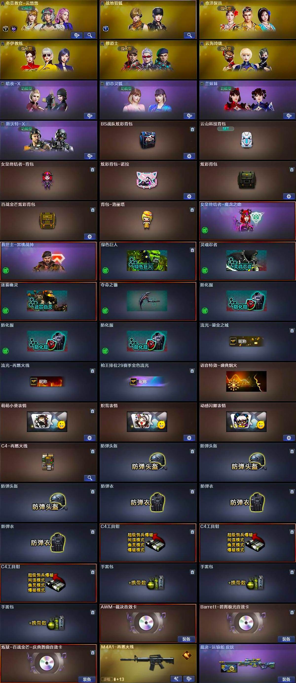 【道具】:BS战队炫彩背包,云山科技背包,女皇终结者-背包,炫彩背包-诺拉,炫彩背包,百战金芒炫彩背包,背包-洛丽塔,女皇终结者-魔龙之吻,救世主-黑桃战神,绿色巨人,灵魂忍者,迷雾幽灵,夺命之镰,防化服*3,流光-鎏金之域,流光-再燃火线,枪王排位29赛季金色流光,语音特效-盛典烟火,萌萌小葵表情,炽雪表情,动感闪耀表情,C4-再燃火线,防弹头盔*3,防弹衣*3,C4工具钳*3,手雷包*3