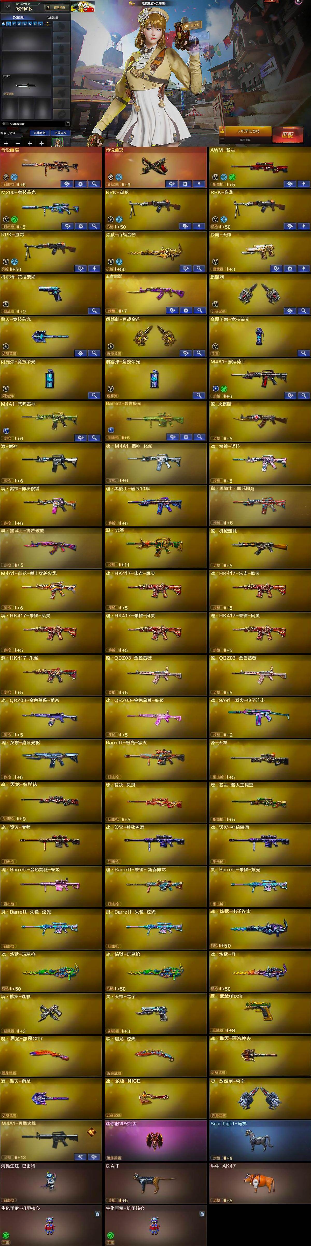 【英雄级武器】:AWM-裁决,M200-竞技荣光,RPK-盘龙*3,炼狱-百战金芒,沙鹰-天神,柯尔特-竞技荣光,麒麟刺,擎天-竞技荣光,麒麟刺-百战金芒,高爆手雷-竞技荣光,闪光弹-竞技荣光,烟雾弹-竞技荣光,M4A1-赤狱骑士,M4A1-苍鸣雷神,Barrett-碧霄极光