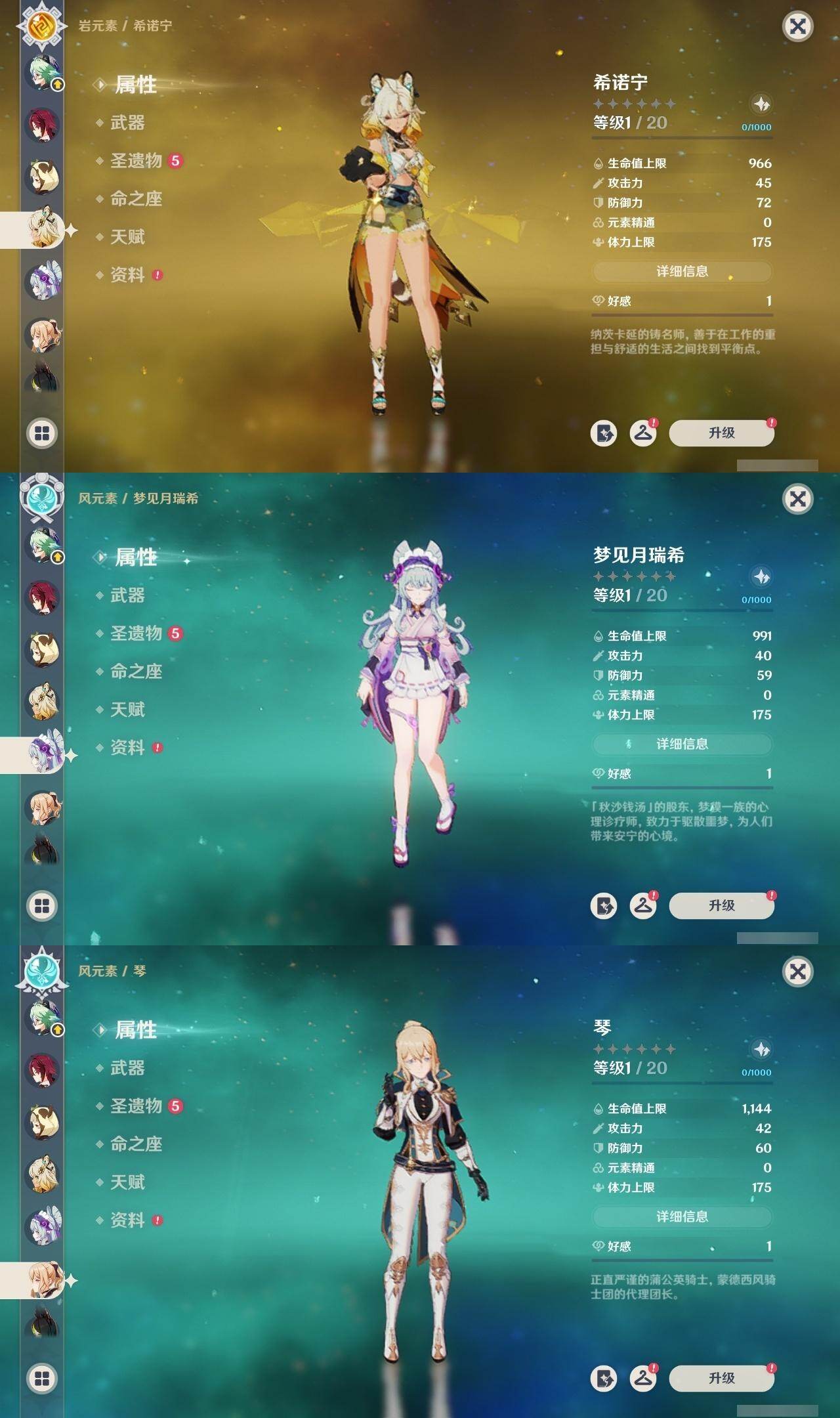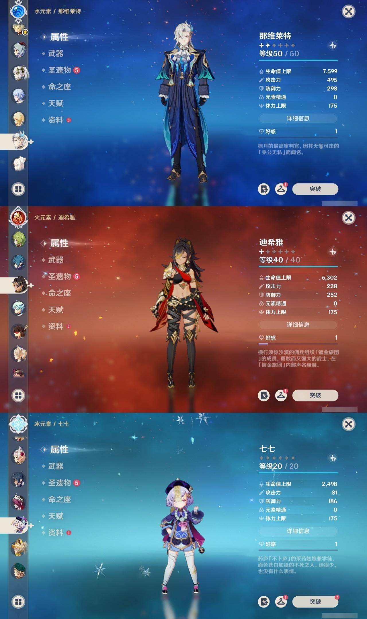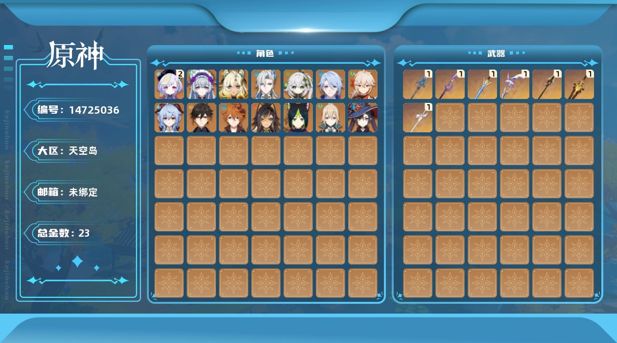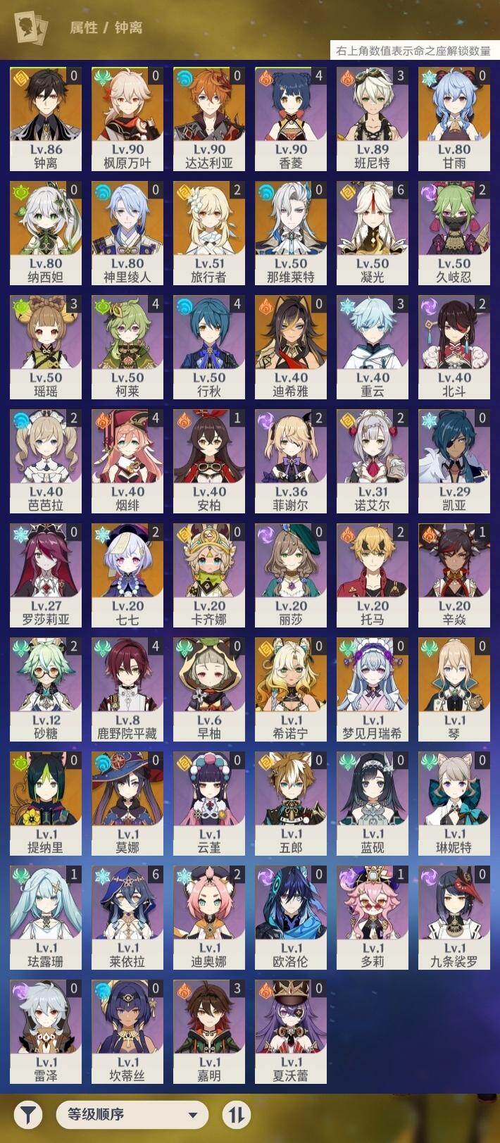 0命那维莱特,0命迪希雅,0命纳西妲,0命提纳里,0命神里绫人,0命枫原万叶,0命钟离,0命甘雨,0命达达利亚,2命七七,0命琴,0命莫娜,0命希诺宁,0命梦见月瑞希,精1苇海信标,精1息灾,精1薙草之稻光,精1苍古自由之誓,精1贯虹之槊,精1阿莫斯之弓,精1风鹰剑