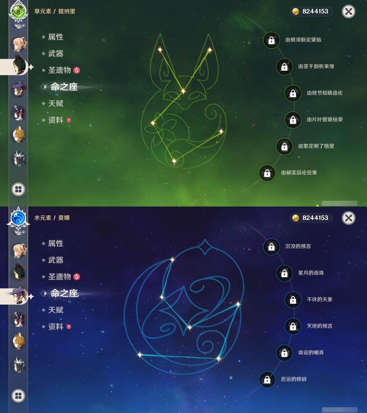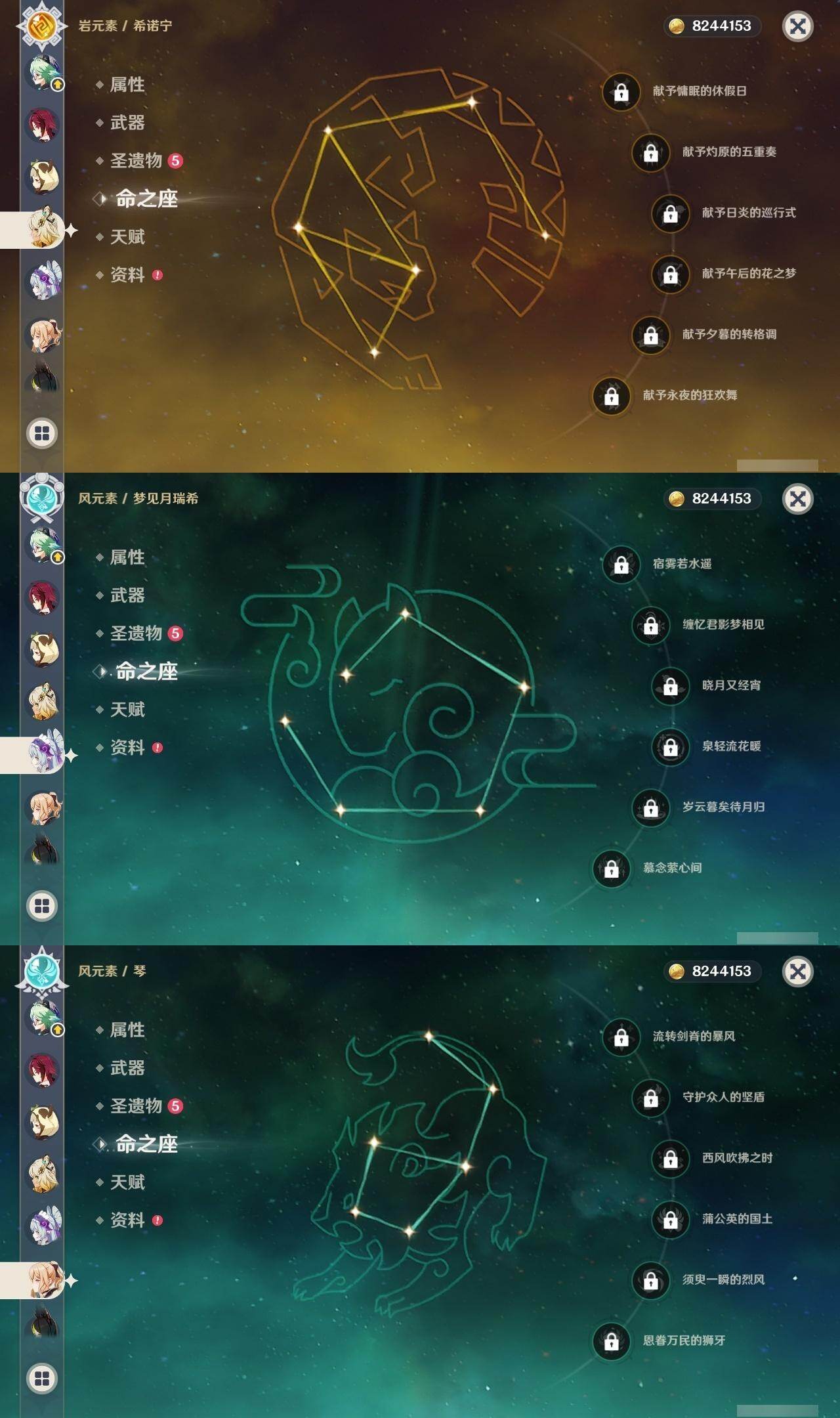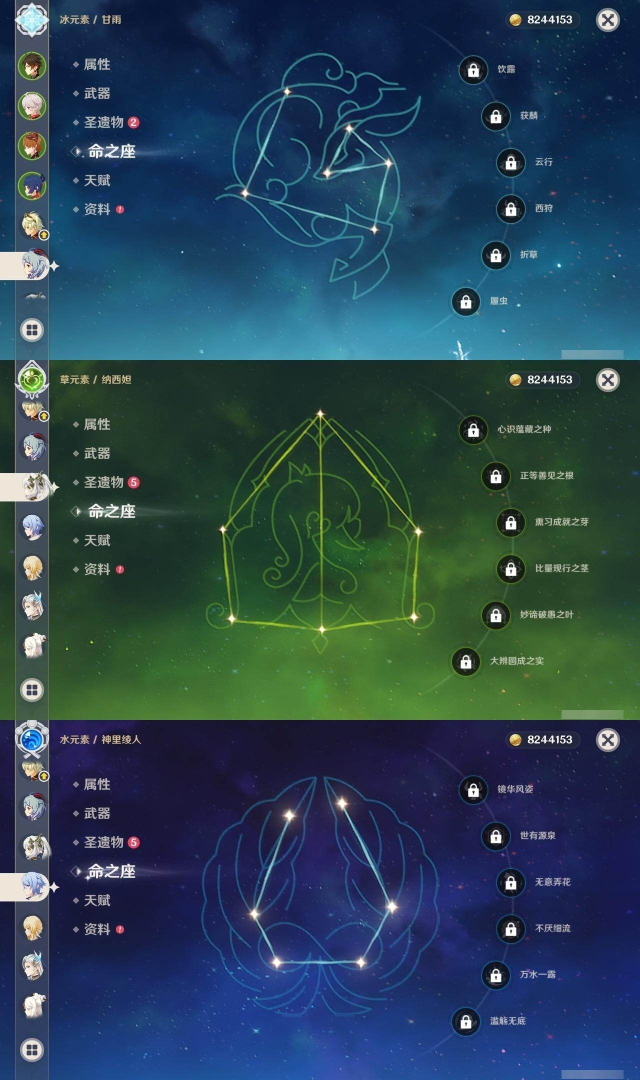 0命那维莱特,0命迪希雅,0命纳西妲,0命提纳里,0命神里绫人,0命枫原万叶,0命钟离,0命甘雨,0命达达利亚,2命七七,0命琴,0命莫娜,0命希诺宁,0命梦见月瑞希,精1苇海信标,精1息灾,精1薙草之稻光,精1苍古自由之誓,精1贯虹之槊,精1阿莫斯之弓,精1风鹰剑