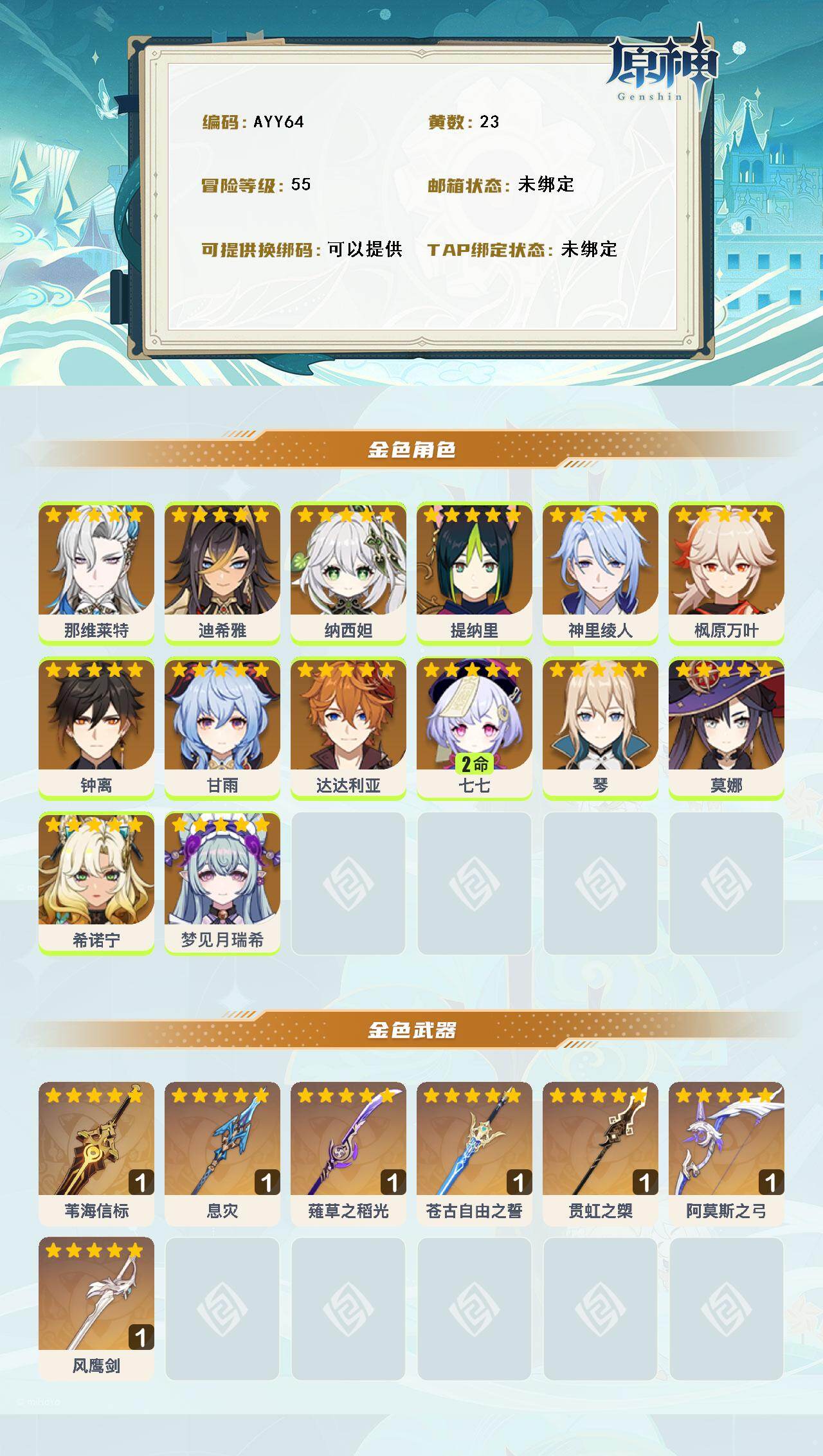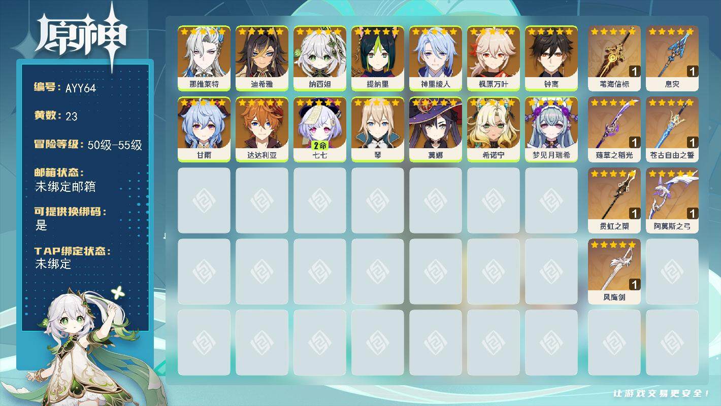 [14725036]55级/23黄/女主/14个五星角色/7个五星武器 0命那维莱特,0命迪希雅,0命纳西妲,0命提纳里,0命神里绫人,0命枫原万叶,0命钟离,0命甘雨,0命达达利亚,2命七七,0命琴,0命莫娜,0命希诺宁,0命梦见月瑞希,精1苇海信标,精1息灾,精1薙草之稻光,精1苍古自由之誓,精1贯虹之槊,精1阿莫斯之弓,精1风鹰剑