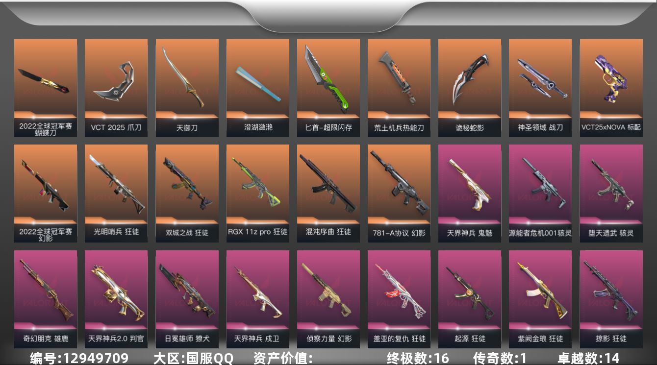 [12949709]【套装】:2022全球冠军赛套装,VCT 2025 赛季套装 【英雄】:幻棱,炼狱,维斯,暮蝶,钛狐,壹决,铁臂,捷风,雷兹,幽影,不死鸟,贤者,猎枭,蝰蛇,零,芮娜,奇乐,尚勃勒,霓虹,斯凯,夜露,星礈,K/O,海神,盖可,黑梦,钢锁 【近战 武器】:近战武器-2022全球冠军赛 蝴蝶刀,近战武器-VCT 2025 爪刀,近战武器-澄湖潋滟,近战武器-超限闪存 匕首,近战武器-荒土机兵 热能刀,近战武器-天御刀,近战武器-诡秘蛇影 军刀,近战武器-神圣领域 战刀 【狂徒】:狂徒-光明哨兵,狂徒-混沌序曲,狂徒-双城之战,狂徒-RGX 11z Pro,狂徒-掠影,狂徒-盖亚的复仇,狂徒-起源,狂徒-紫阙金琅,狂徒-荒土机兵,狂徒-诡秘蛇影 【幻影】:幻影-781-A协议,幻影-2022全球冠军赛,幻影-侦察力量,幻影-超限闪存,幻影-神圣领域,幻影-纳米打击,幻影-末日之翼 【戍卫】:戍卫-天界神兵,戍卫-浮光跃金,戍卫-逆冲蛮牛,戍卫-月球哨兵,戍卫-折光棱晶 【獠犬】:獠犬-日冕雄师,獠犬-神圣领域,獠犬-模拟赫兹,獠犬-逆冲蛮牛 【冥驹】:冥驹-荒土机兵,冥驹-模拟赫兹,冥驹-星云暗涌 【飞将】:飞将-末日之翼 【莽侠】:莽侠-超限闪存,莽侠-诡秘蛇影,莽侠-月球哨兵 【战神】:战神-盖亚的复仇//2.0,战神-神圣领域,战神-浮光跃金 【奥丁】:奥丁-紫阙金琅//2.0,奥丁-纳米打击,奥丁-末日之翼 【判官】:判官-天界神兵//2.0,判官-诡秘蛇影,判官-纳米打击x 【雄鹿】:雄鹿-奇幻朋克,雄鹿-模拟赫兹,雄鹿-逆冲蛮牛,雄鹿-月球哨兵 【骇灵】:骇灵-堕天遗武,骇灵-源能者危机001,骇灵-荒土机兵,骇灵-浮光跃金,骇灵-星云暗涌 【蜂刺】:蜂刺-超限闪存,蜂刺-星云暗涌,蜂刺-折光棱晶 【标配】:标配-荒土机兵,标配-浮光跃金,标配-折光棱晶 【VCT手枪】:标配-VCT25 x NOVA 【正义】:正义-超限闪存,正义-纳米打击,正义-月球哨兵 【鬼魅】:鬼魅-天界神兵,鬼魅-诡秘蛇影,鬼魅-模拟赫兹,鬼魅-星云暗涌 【狂怒】:狂怒-神圣领域,狂怒-逆冲蛮牛 【短炮】:短炮-末日之翼 【卡面】:终章:激斗汉堡 卡面,进入射程 卡面,分崩离析 卡面,纳米打击 卡面,抑制技术 卡面,激斗汉堡 卡面,瓦娃脸雪糕 P2 卡面,从黄昏到黎明 卡面,荒土机