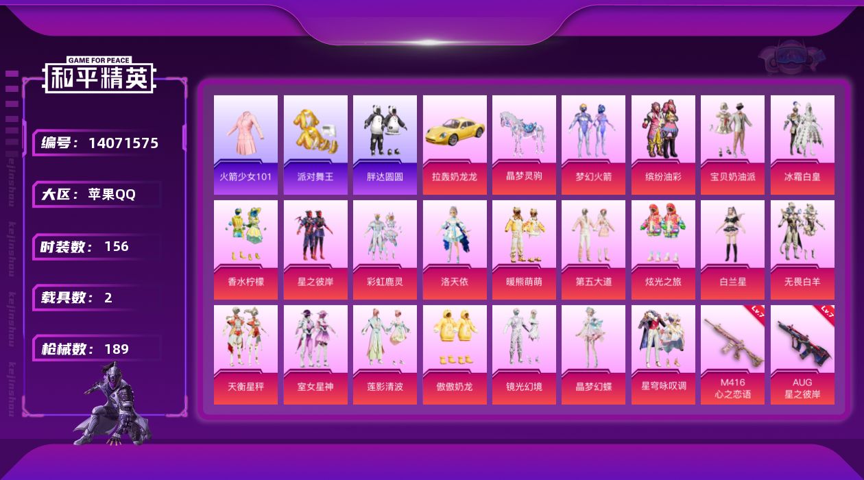 [14071575]苹果 手Q-20粉装-10特效枪-2载具-5粉色飞行器-79572热力值-11王牌印记-156套装-189枪皮