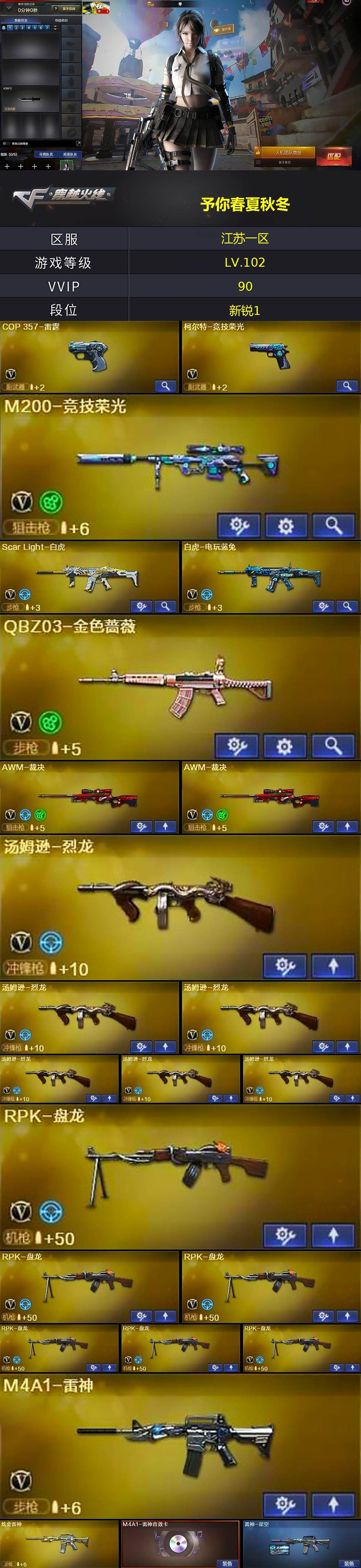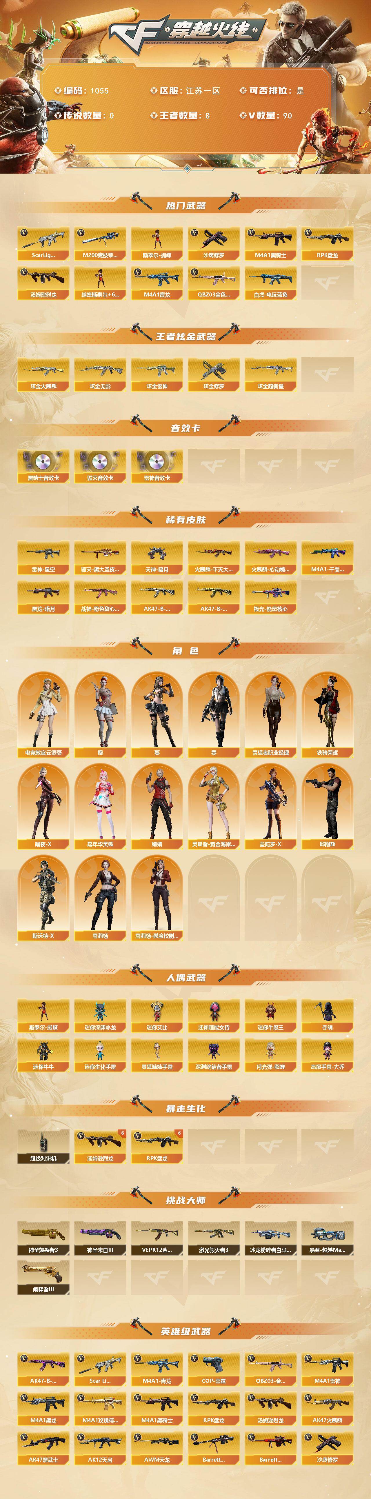 [14729377]江苏一区-90V-8王者-5炫金 【热门武器】:QBZ03-金色蔷薇,Scar Light-白虎,M4A1-青龙,M200-竞技荣光,白虎-电玩蓝兔,M4A1-黑骑士*5,汤姆逊-烈龙*6,RPK-盘龙*6,斯泰尔-蝴蝶,沙鹰-修罗*7 【王者炫金武器】:炫金火麒麟,炫金无影,炫金雷神,炫金超新星,炫金修罗 【音效卡】:M4A1-雷神音效卡,M4A1-黑骑士音效卡,Barrett-毁灭音效卡 【皮肤】:雷神-星空,火麒麟-平天大圣,火麒麟-心动糖果,毁灭-黑大圣皮肤,M4A1-千变-孔明皮肤,黑龙-暗月,战神-粉色甜心皮肤,AK47-B-常胜将军-刘备*4,AK47-B-常胜将军-孙权*2,极光-能量核心,天神-暗月 【角色】:零,葵,樱,电竞教官-云悠悠,暗夜-X,嘉年华灵狐,娟娟,灵狐者-黄金海岸,灵狐者-职业经理,曼陀罗-X,邱刚敖,斯沃特-X,铁骑荣耀,雪莉杨,雪莉杨-摸金校尉 【人偶武器】:斯泰尔-蝴蝶,迷你深渊冰龙,迷你牛魔王,夺魂,迷你牛牛*2,迷你生化手雷,深渊终结者手雷*2,闪光弹-貂蝉,高爆手雷-大乔,迷你艾比,迷你超能女侍,灵狐娃娃手雷 【暴走生化】:超级对讲机 【挑战大师】:暴君乱世-超越Max,神圣爆裂者III,冰龙粉碎者-白马银枪,VEPR-12-金魔,激光毁灭者III,神圣爆裂者-末日III*2,阐释者III 【英雄级武器】:M4A1-千变,AK47-火麒麟*2,M4A1-黑龙,M4A1-雷神,M4A1-黑骑士*5,AK47-黑武士,AK12-天启,M4A1-武圣,AK47-机械迷城,M4A1-青龙,Scar Light-白虎,无影-神兵利器,M4A1-玫瑰精灵,QBZ03-金色蔷薇,AK-47-猩红传说,AK47-B-战神,王者火魄-觉醒版,黑骑士-海王*2,AK47-B-常胜将军,王者之烈-觉醒版,白虎-电玩蓝兔,AWM-天龙,Barrett-毁灭,Barrett-极光,AWM-裁决*2,M200-竞技荣光,RPK-盘龙*6,汤姆逊-烈龙*6,沙鹰-修罗*7,沙鹰-天神,COP-雷霆,柯尔特-竞技荣光,Glock18-武圣,屠龙*2,龙啸,擎天,麒麟刺,幻灵之锋,擎天-竞技荣光*2,雷霆王者之锋-觉醒版,高爆手雷-幻灵*3,高爆手雷-竞技荣光*3,闪光弹-幻灵*2,闪光弹-竞技荣光*4,闪光弹-神工天巧,闪光弹-雷霆王者-觉醒版,