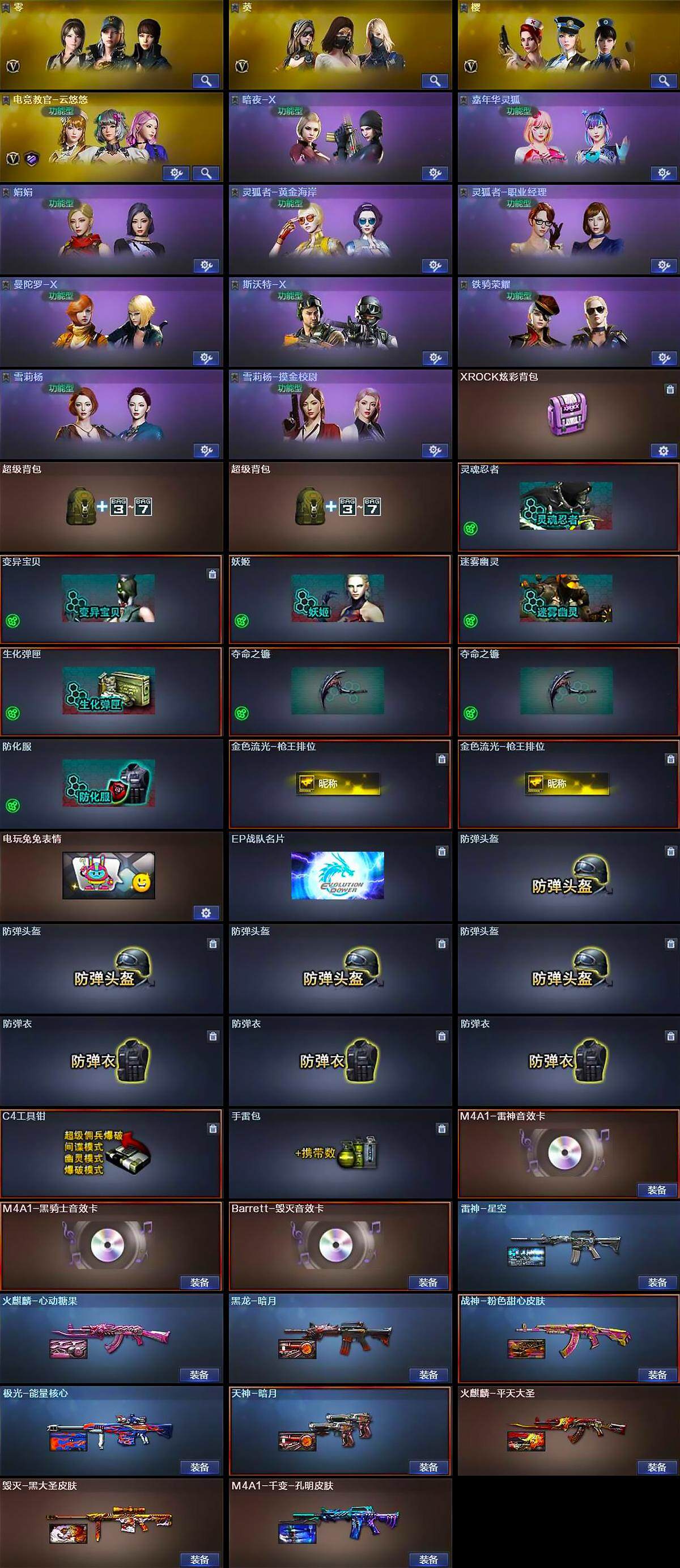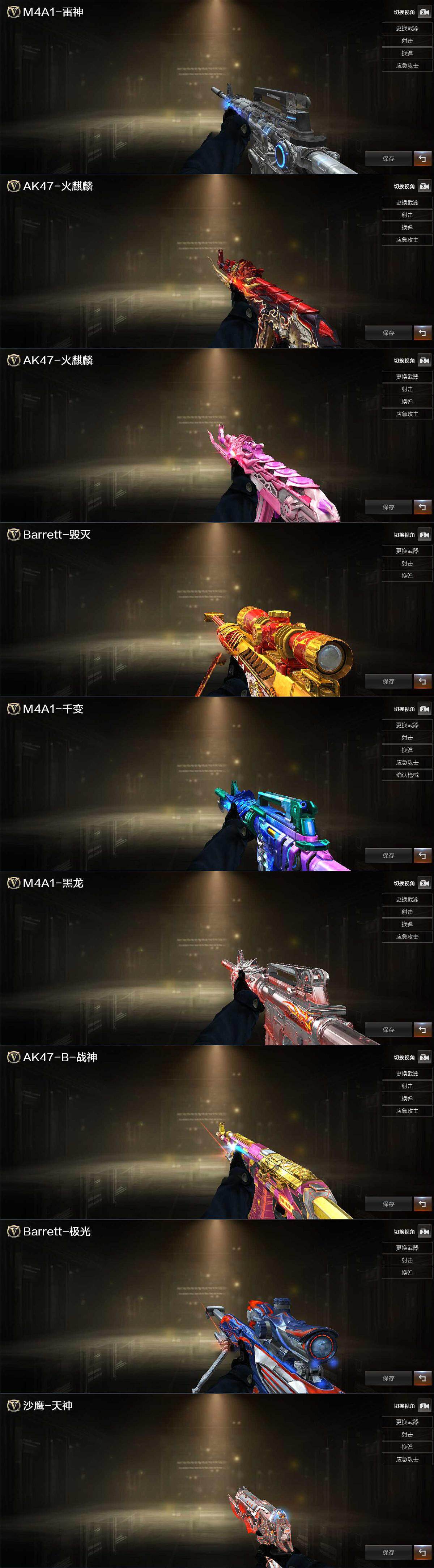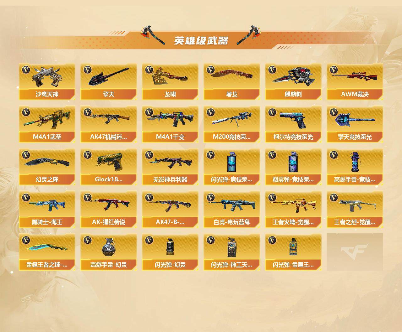 【英雄级武器】:M4A1-千变,AK47-火麒麟*2,M4A1-黑龙,M4A1-雷神,M4A1-黑骑士*5,AK47-黑武士,AK12-天启,M4A1-武圣,AK47-机械迷城,M4A1-青龙,Scar Light-白虎,无影-神兵利器,M4A1-玫瑰精灵,QBZ03-金色蔷薇,AK-47-猩红传说,AK47-B-战神,王者火魄-觉醒版,黑骑士-海王*2,AK47-B-常胜将军,王者之烈-觉醒版,白虎-电玩蓝兔,AWM-天龙,Barrett-毁灭,Barrett-极光,AWM-裁决*2,M200-竞技荣光,RPK-盘龙*6,汤姆逊-烈龙*6,沙鹰-修罗*7,沙鹰-天神,COP-雷霆,柯尔特-竞技荣光,Glock18-武圣,屠龙*2,龙啸,擎天,麒麟刺,幻灵之锋,擎天-竞技荣光*2,雷霆王者之锋-觉醒版,高爆手雷-幻灵*3,高爆手雷-竞技荣光*3,闪光弹-幻灵*2,闪光弹-竞技荣光*4,闪光弹-神工天巧,闪光弹-雷霆王者-觉醒版,