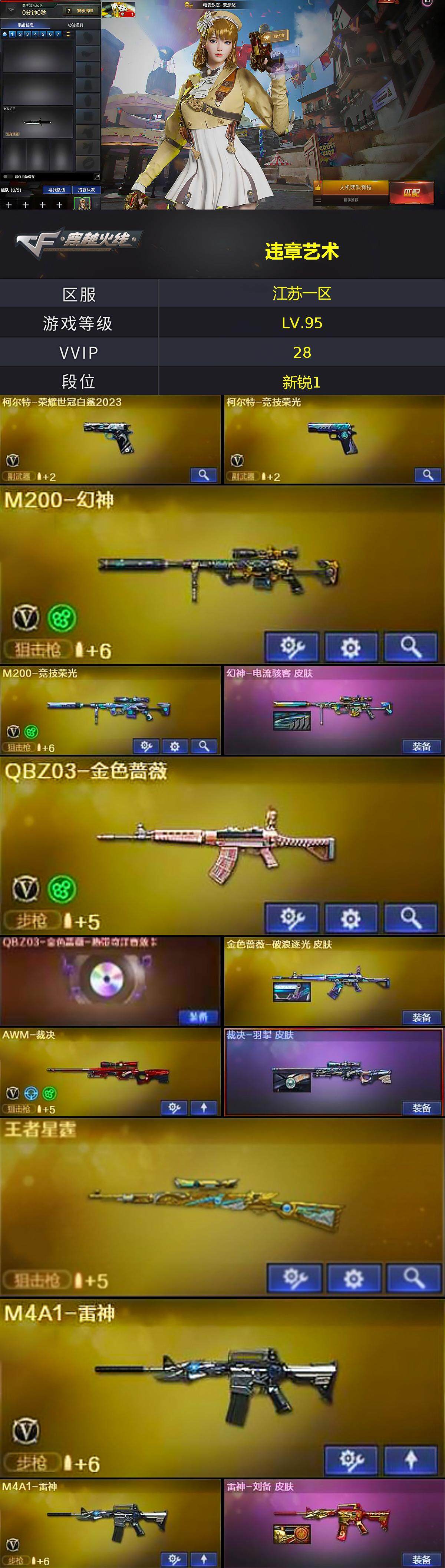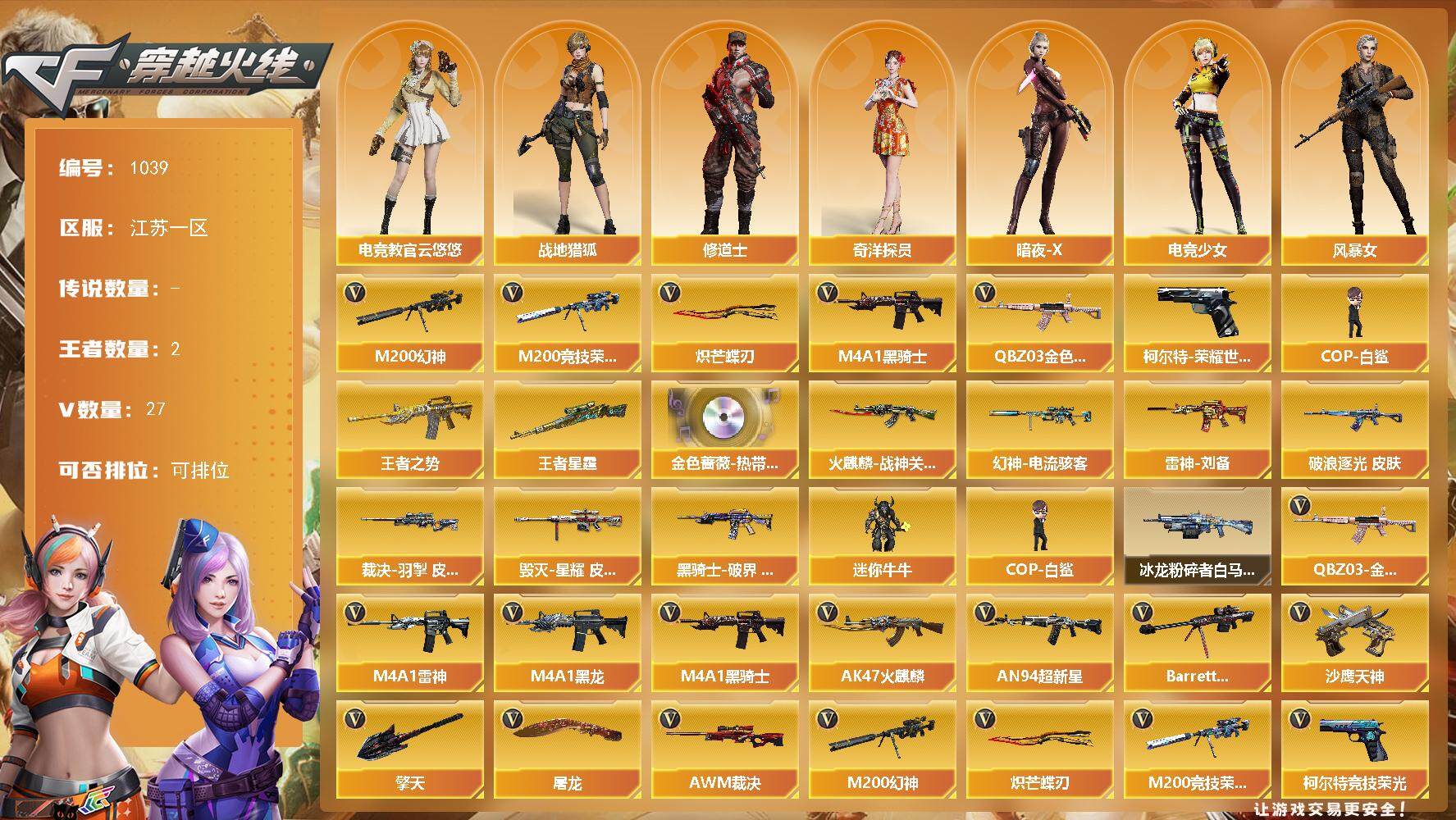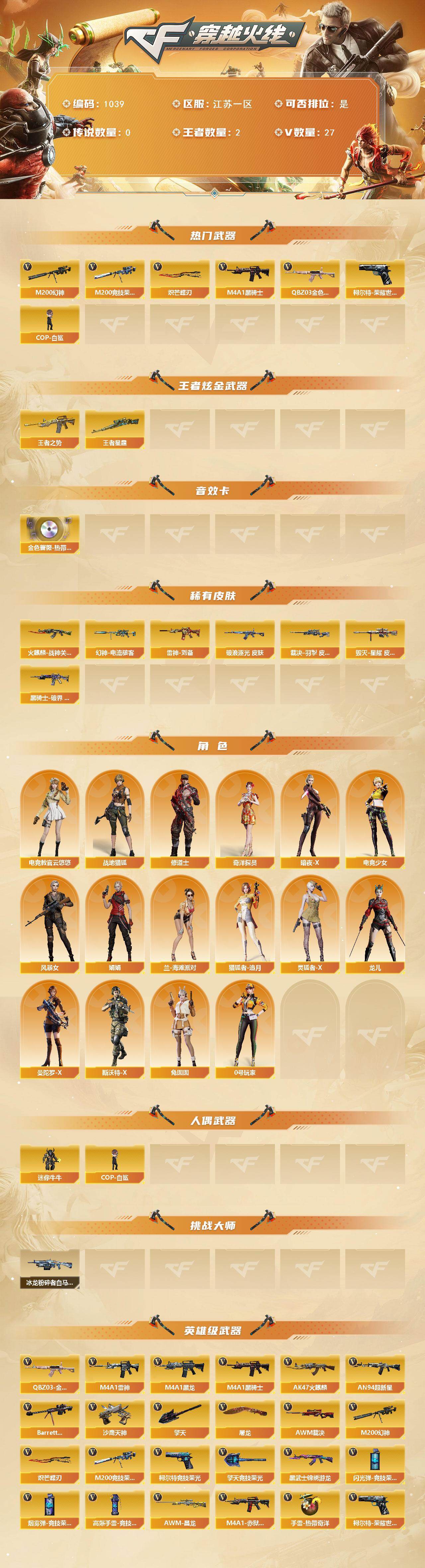 [14730644]江苏一区-27V-2王者-0炫金 【热门武器】:QBZ03-金色蔷薇,M200-幻神,柯尔特-荣耀世冠白鲨2023,M200-竞技荣光,M4A1-黑骑士,COP-白鲨,炽芒蝶刃 【王者炫金武器】:王者之势,王者星霆 【音效卡】:QBZ03-金色蔷薇-热带奇洋音效卡 【皮肤】:幻神-电流骇客 皮肤,金色蔷薇-破浪逐光 皮肤,裁决-羽掣 皮肤,雷神-刘备 皮肤,火麒麟-战神关羽,毁灭-星耀 皮肤,黑骑士-破界 皮肤 【角色】:电竞教官-云悠悠,战地猎狐,奇洋探员,修道士,暗夜-X,电竞少女,风暴女,娟娟,兰-海滩派对,猎狐者-追月,0号玩家,灵狐者-X,龙儿,曼陀罗-X,斯沃特-X,兔囡囡 【人偶武器】:COP-白鲨,迷你牛牛 【挑战大师】:冰龙粉碎者-白马银枪 【英雄级武器】:AK47-火麒麟*2,M4A1-黑龙,M4A1-雷神*2,M4A1-黑骑士,AN94-超新星,黑武士-锦绣游龙,QBZ03-金色蔷薇,Barrett-毁灭,AWM-裁决,M200-幻神,M200-竞技荣光,沙鹰-天神*2,柯尔特-荣耀世冠白鲨2023,柯尔特-竞技荣光,屠龙*2,擎天,擎天-竞技荣光,炽芒蝶刃,高爆手雷-竞技荣光,手雷-热带奇洋,闪光弹-竞技荣光,烟雾弹-竞技荣光,M4A1-赤狱骑士,AWM-昌龙 【道具】:CFS限定背包,亚洲杯纪念炫彩背包,奇洋探员-海龟背包,超级背包,女皇终结者-魔龙之吻,救世主-黑桃战神,绿色巨人,灵魂忍者,迷雾幽灵,夺命之镰,防化服*3,星辰流光-枪王排位,流光-再燃火线,枪王排位28赛季金色流光,枪王排位29赛季金色流光,防弹头盔*6,防弹衣*6,C4工具钳*5,手雷包*5 【特殊枪械】:1黑骑士