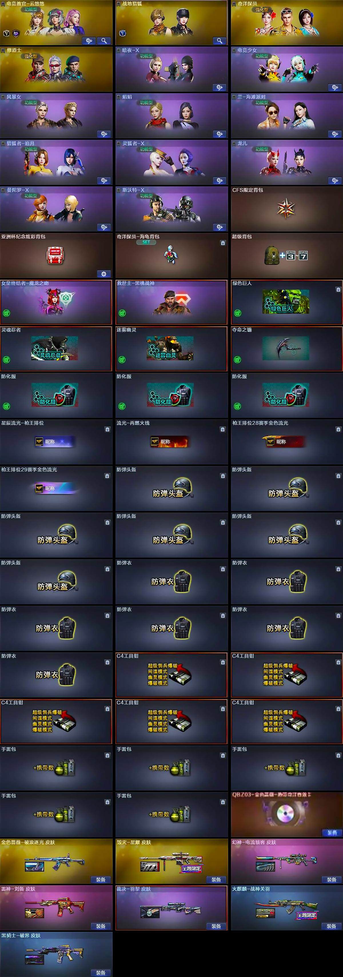 【道具】:CFS限定背包,亚洲杯纪念炫彩背包,奇洋探员-海龟背包,超级背包,女皇终结者-魔龙之吻,救世主-黑桃战神,绿色巨人,灵魂忍者,迷雾幽灵,夺命之镰,防化服*3,星辰流光-枪王排位,流光-再燃火线,枪王排位28赛季金色流光,枪王排位29赛季金色流光,防弹头盔*6,防弹衣*6,C4工具钳*5,手雷包*5