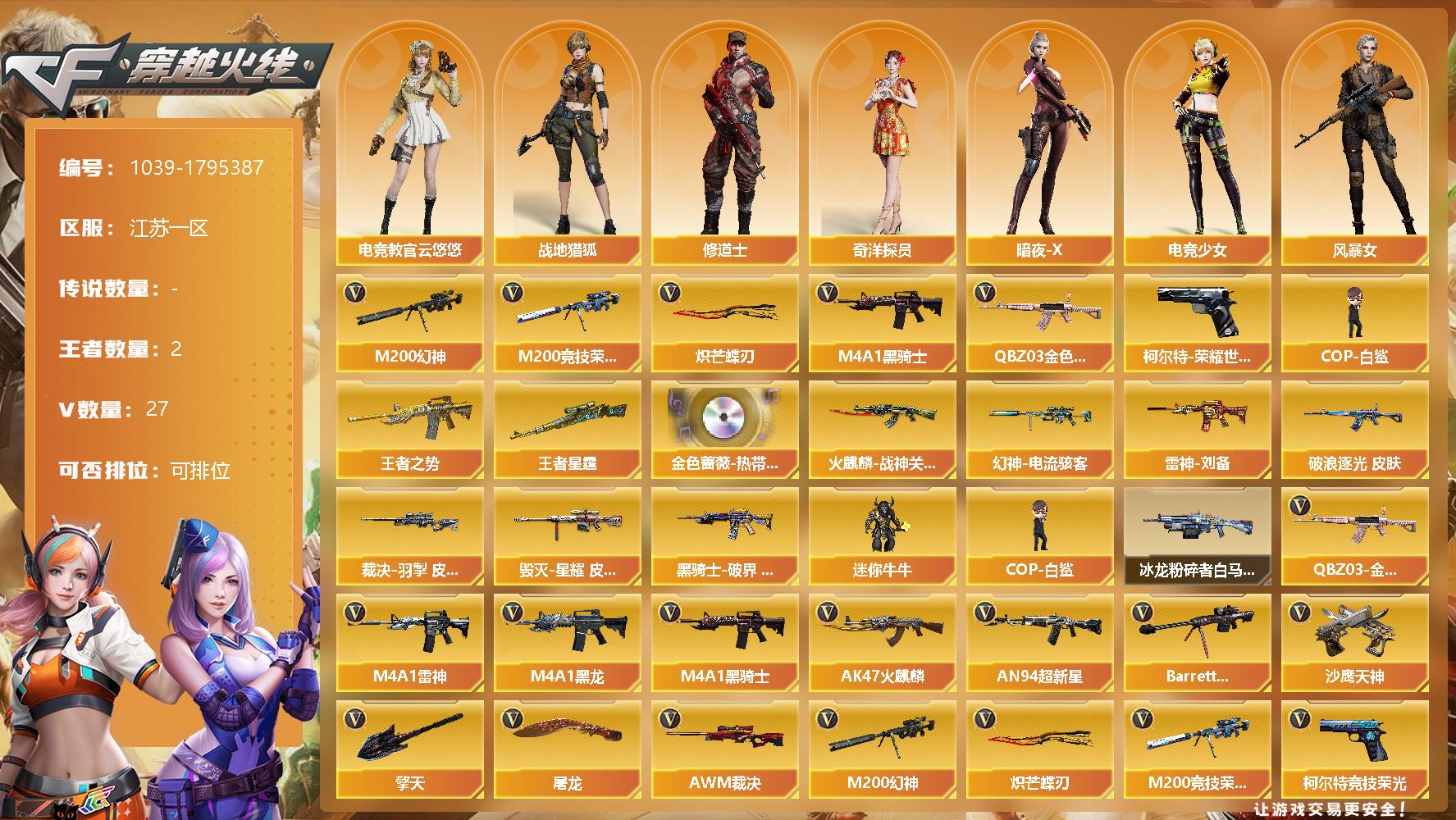 [14730645]江苏一区-27V-2王者-0炫金 【热门武器】:QBZ03-金色蔷薇,M200-幻神,柯尔特-荣耀世冠白鲨2023,M200-竞技荣光,M4A1-黑骑士,COP-白鲨,炽芒蝶刃 【王者炫金武器】:王者之势,王者星霆 【音效卡】:QBZ03-金色蔷薇-热带奇洋音效卡 【皮肤】:幻神-电流骇客 皮肤,金色蔷薇-破浪逐光 皮肤,裁决-羽掣 皮肤,雷神-刘备 皮肤,火麒麟-战神关羽,毁灭-星耀 皮肤,