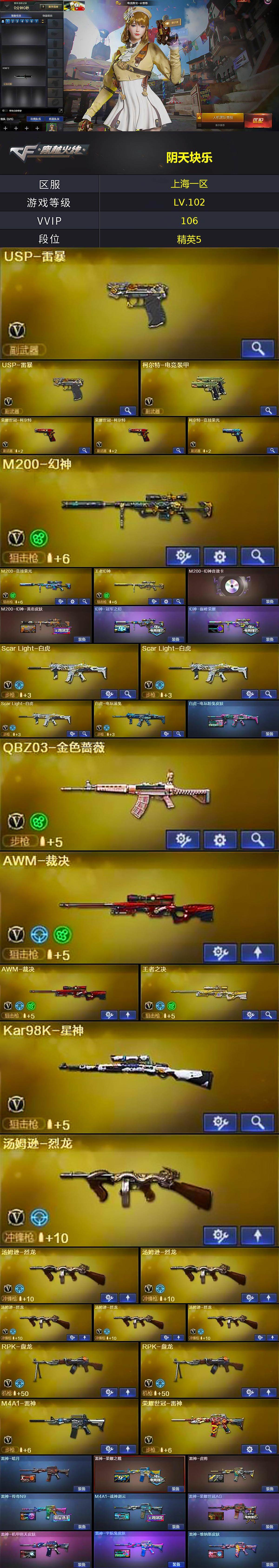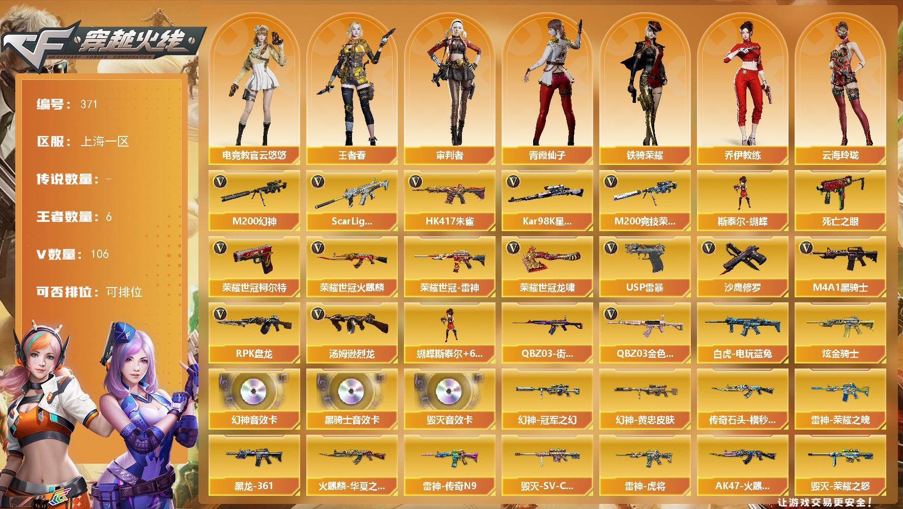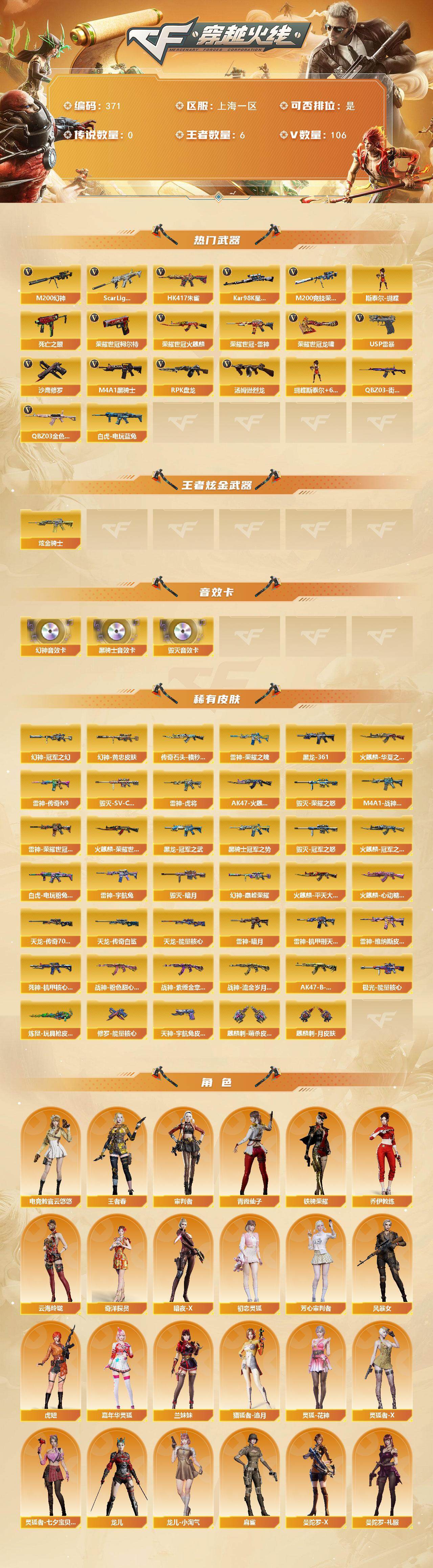 [14732933]上海一区-106V-6王者-1炫金 【热门武器】:QBZ03-金色蔷薇,Scar Light-白虎*3,HK417-朱雀,M200-幻神,M200-竞技荣光,死亡之眼,荣耀世冠-火麒麟,荣耀世冠-雷神,白虎-电玩蓝兔,QBZ03-街机,荣耀世冠-柯尔特*2,Kar98K-星神,M4A1-黑骑士*5,汤姆逊-烈龙*6,RPK-盘龙*2,斯泰尔-蝴蝶,USP-雷暴*2,沙鹰-修罗*4,荣耀世冠-龙啸 【王者炫金武器】:炫金骑士 【音效卡】:M200-幻神音效卡,M4A1-黑骑士音效卡,Barrett-毁灭音效卡 【皮肤】:M200-幻神-黄忠皮肤,幻神-冠军之幻,幻神-巅峰荣耀,白虎-电玩粉兔皮肤,雷神-暗月,雷神-荣耀之魄,雷神-虎将,雷神-传奇N9,M4A1-战神赵云,雷神-荣耀世冠AG,雷神-机甲刑天皮肤,雷神-宇航兔皮肤,雷神-维纳斯皮肤,火麒麟-冠军之心,火麒麟-华夏之心*2,AK47-火麒麟-传奇EVEN,传奇石头-横秒之巅,火麒麟-平天大圣*3,火麒麟-荣耀世冠AG,火麒麟-心动糖果,毁灭-暗月,毁灭-荣耀之怒,毁灭-冠军之怒,毁灭-SV-CFPLS16冠军,M4A1-黑龙-361,黑龙-冠军之武,黑骑士-冠军之势,死神-机甲核心皮肤,战神-粉色甜心皮肤,战神-紫绶金章皮肤*3,战神-流金岁月皮肤,AK47-B-常胜将军-孙权*2,天龙-能量核心,AWM-天龙-传奇70KG,AWM-天龙-传奇白鲨,极光-能量核心,炼狱-玩具枪皮肤,修罗-能量核心,天神-宇航兔皮肤,麒麟刺-萌杀皮肤,麒麟刺-月皮肤 【角色】:电竞教官-云悠悠,审判者,王者春,奇洋探员,乔伊教练,云海玲珑,暗夜-X,初恋灵狐,芳心审判者,风暴女,虎妞,嘉年华灵狐,兰妹妹,猎狐者-追月,灵狐-花神,灵狐者-X,灵狐者-七夕宝贝,龙儿,龙儿-小淘气,麻雀,曼陀罗-X,曼陀罗-礼服,萌儿,潘多拉-X,青霞仙子,斯沃特-X,铁骑荣耀,兔囡囡,维纳斯,新娜塔莎,雪莉杨-摸金校尉,夜玫瑰-幻能朋克,樱-战斗天使,游珑儿 【人偶武器】:火麒麟-灵狐*2,斯泰尔-蝴蝶,AWM-灵狐-15周年嘉年华,迷你深渊冰龙*2,迷你裂空之翼,迷你波特博士,夺魂,迷你火种,生化手雷-机甲核心,深渊终结者手雷*2,迷你艾比,迷你超能女侍,迷你巨石泰坦-魔花研究所 【暴走生化】:死亡之眼,超级对讲机 【挑战大师】:冰龙粉碎