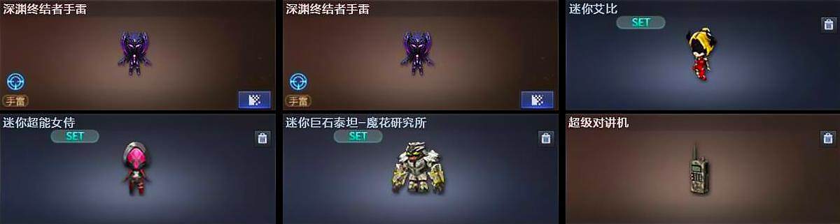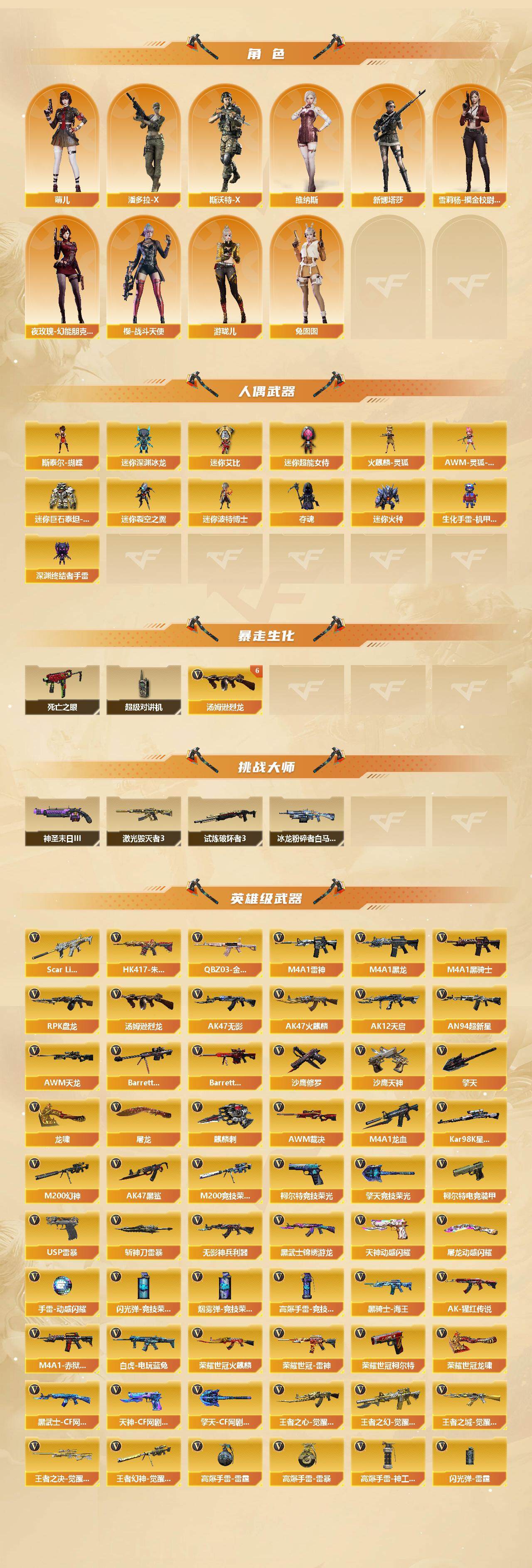 【人偶武器】:火麒麟-灵狐*2,斯泰尔-蝴蝶,AWM-灵狐-15周年嘉年华,迷你深渊冰龙*2,迷你裂空之翼,迷你波特博士,夺魂,迷你火种,生化手雷-机甲核心,深渊终结者手雷*2,迷你艾比,迷你超能女侍,迷你巨石泰坦-魔花研究所