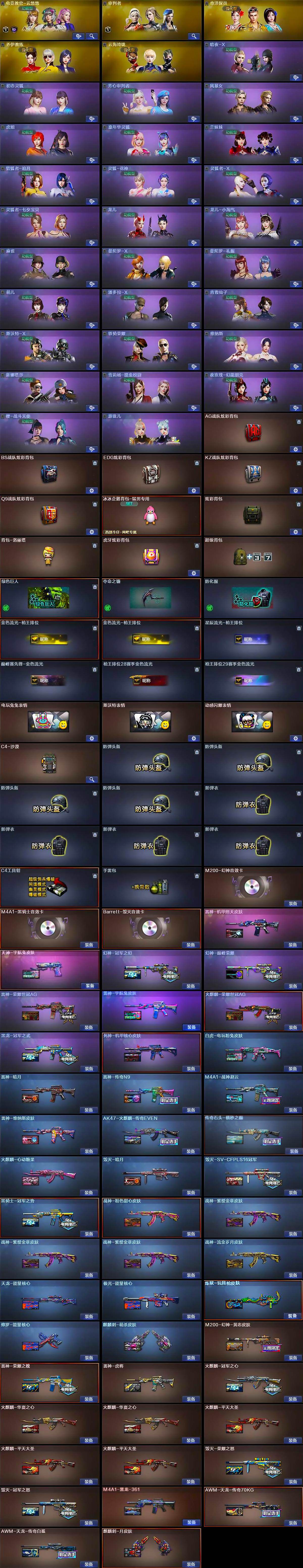 【皮肤】:M200-幻神-黄忠皮肤,幻神-冠军之幻,幻神-巅峰荣耀,白虎-电玩粉兔皮肤,雷神-暗月,雷神-荣耀之魄,雷神-虎将,雷神-传奇N9,M4A1-战神赵云,雷神-荣耀世冠AG,雷神-机甲刑天皮肤,雷神-宇航兔皮肤,雷神-维纳斯皮肤,火麒麟-冠军之心,火麒麟-华夏之心*2,AK47-火麒麟-传奇EVEN,传奇石头-横秒之巅,火麒麟-平天大圣*3,火麒麟-荣耀世冠AG,火麒麟-心动糖果,毁灭-暗月,毁灭-荣耀之怒,毁灭-冠军之怒,毁灭-SV-CFPLS16冠军,M4A1-黑龙-361,黑龙-冠军之武,黑骑士-冠军之势,死神-机甲核心皮肤,战神-粉色甜心皮肤,战神-紫绶金章皮肤*3,战神-流金岁月皮肤,AK47-B-常胜将军-孙权*2,天龙-能量核心,AWM-天龙-传奇70KG,AWM-天龙-传奇白鲨,极光-能量核心,炼狱-玩具枪皮肤,修罗-能量核心,天神-宇航兔皮肤,麒麟刺-萌杀皮肤,麒麟刺-月皮肤