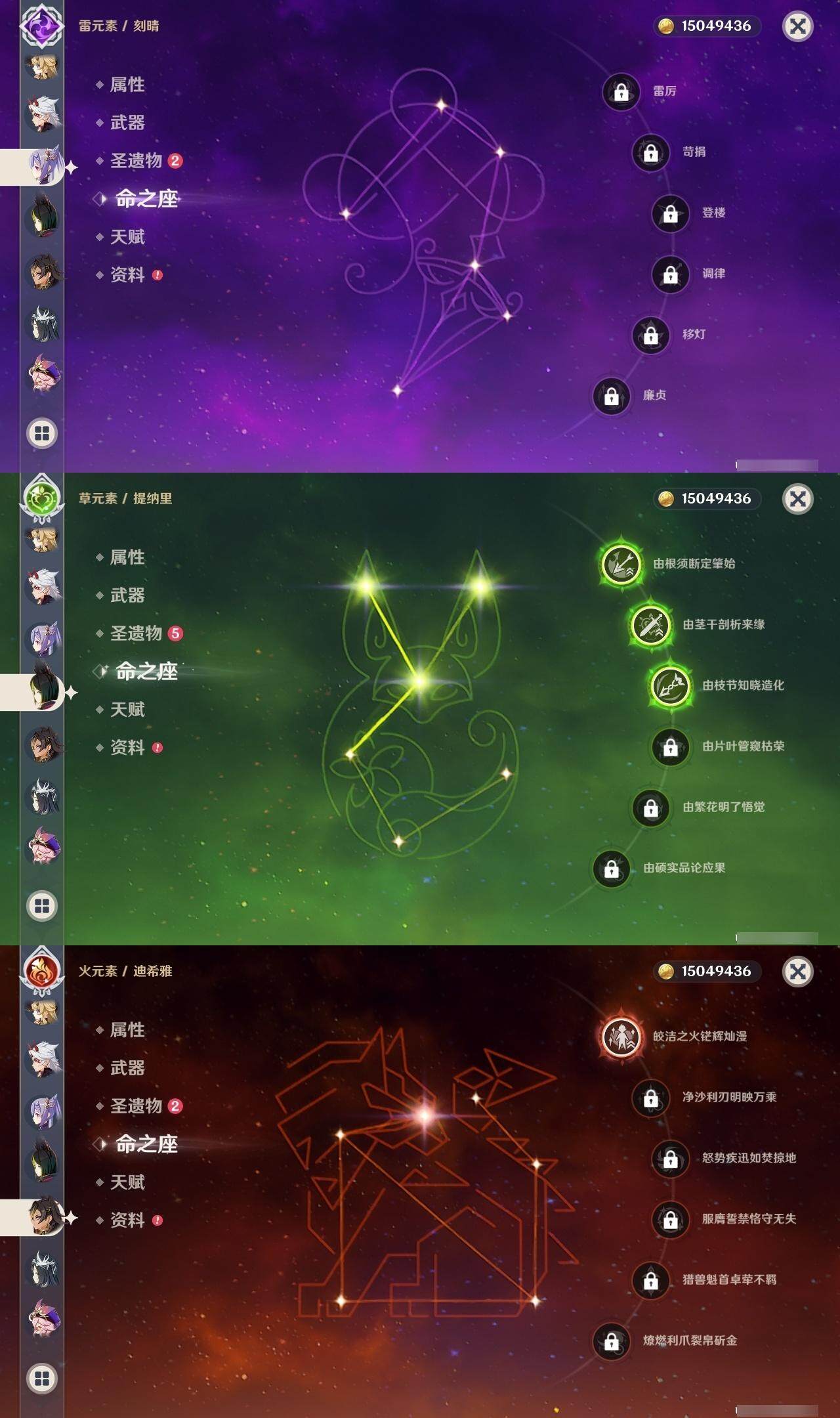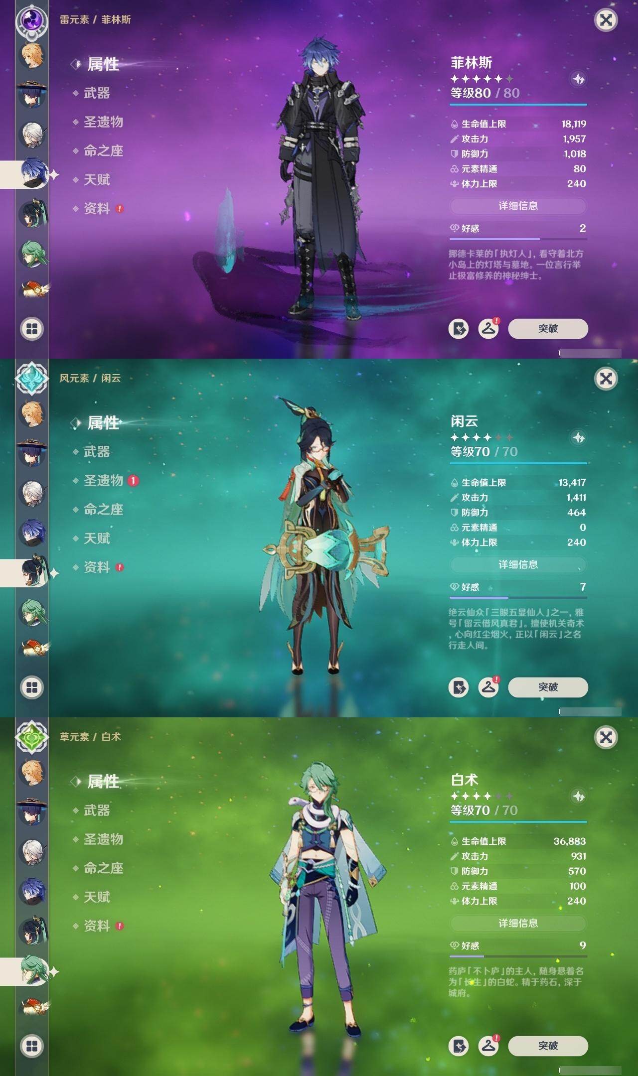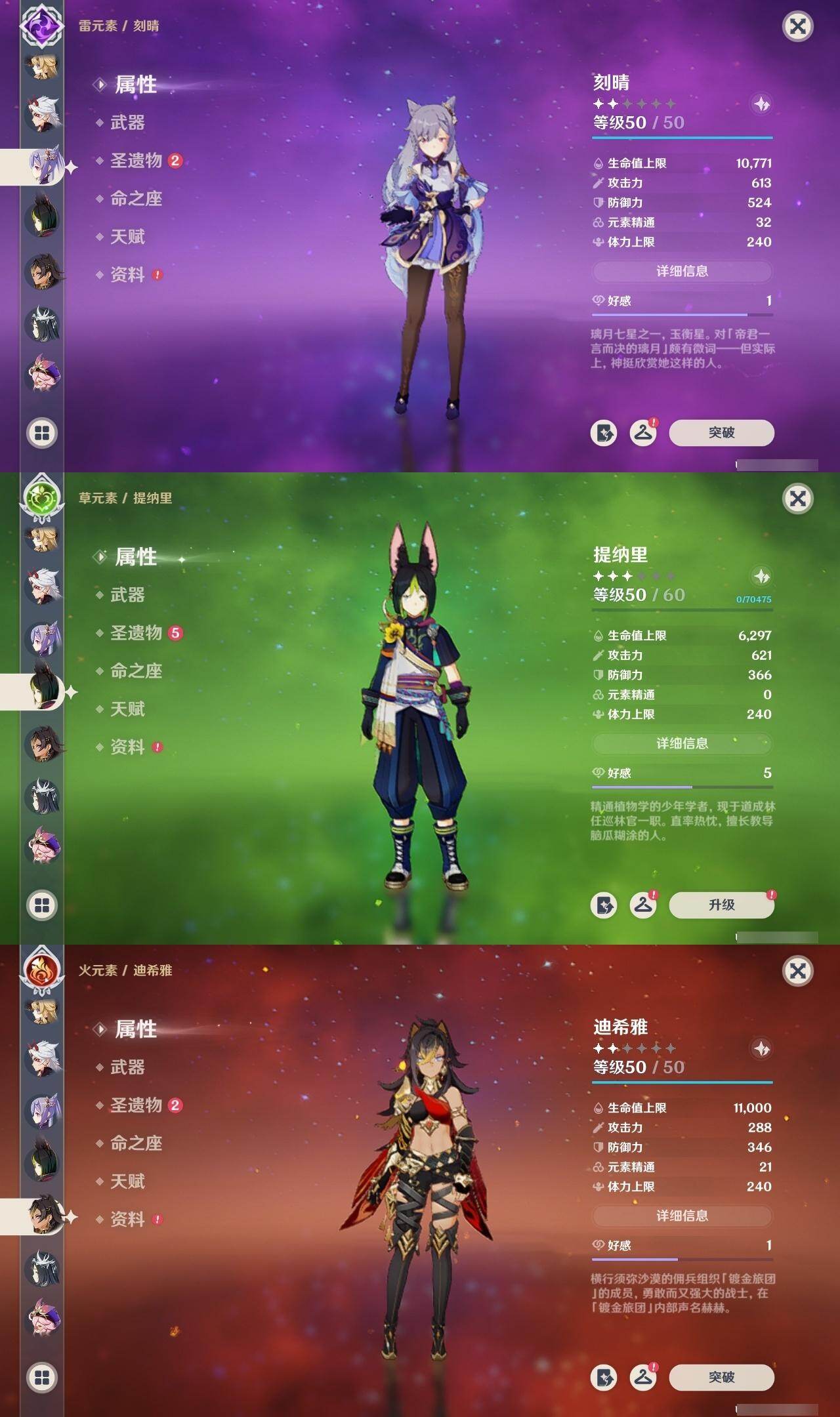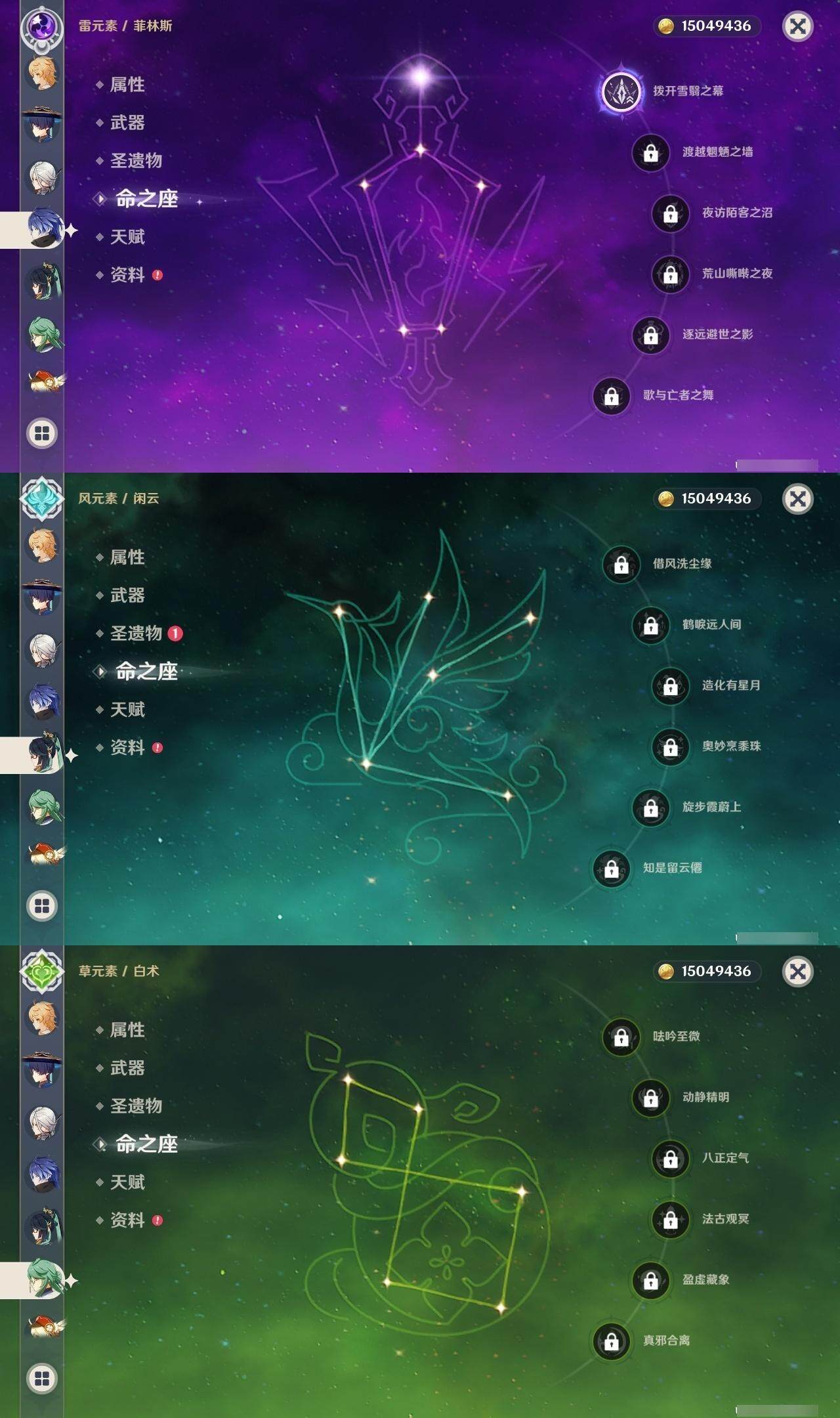 0命克洛琳德,0命阿蕾奇诺,0命闲云,0命娜维娅,0命白术,1命迪希雅,0命流浪者,3命提纳里,0命荒泷一斗,0命可莉,0命刻晴,1命琴,1命莫娜,2命迪卢克,0命希诺宁,0命玛拉妮,0命恰斯卡,0命玛薇卡,0命茜特菈莉,0命梦见月瑞希,1命菲林斯,精1四风原典,精1和璞鸢,精1天空之翼,精1阿莫斯之弓,精1天空之卷
