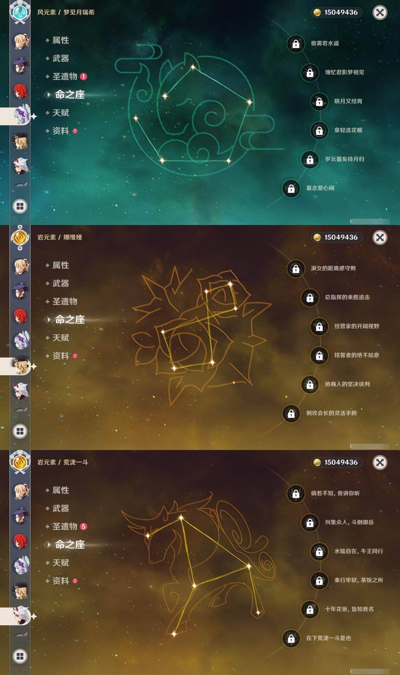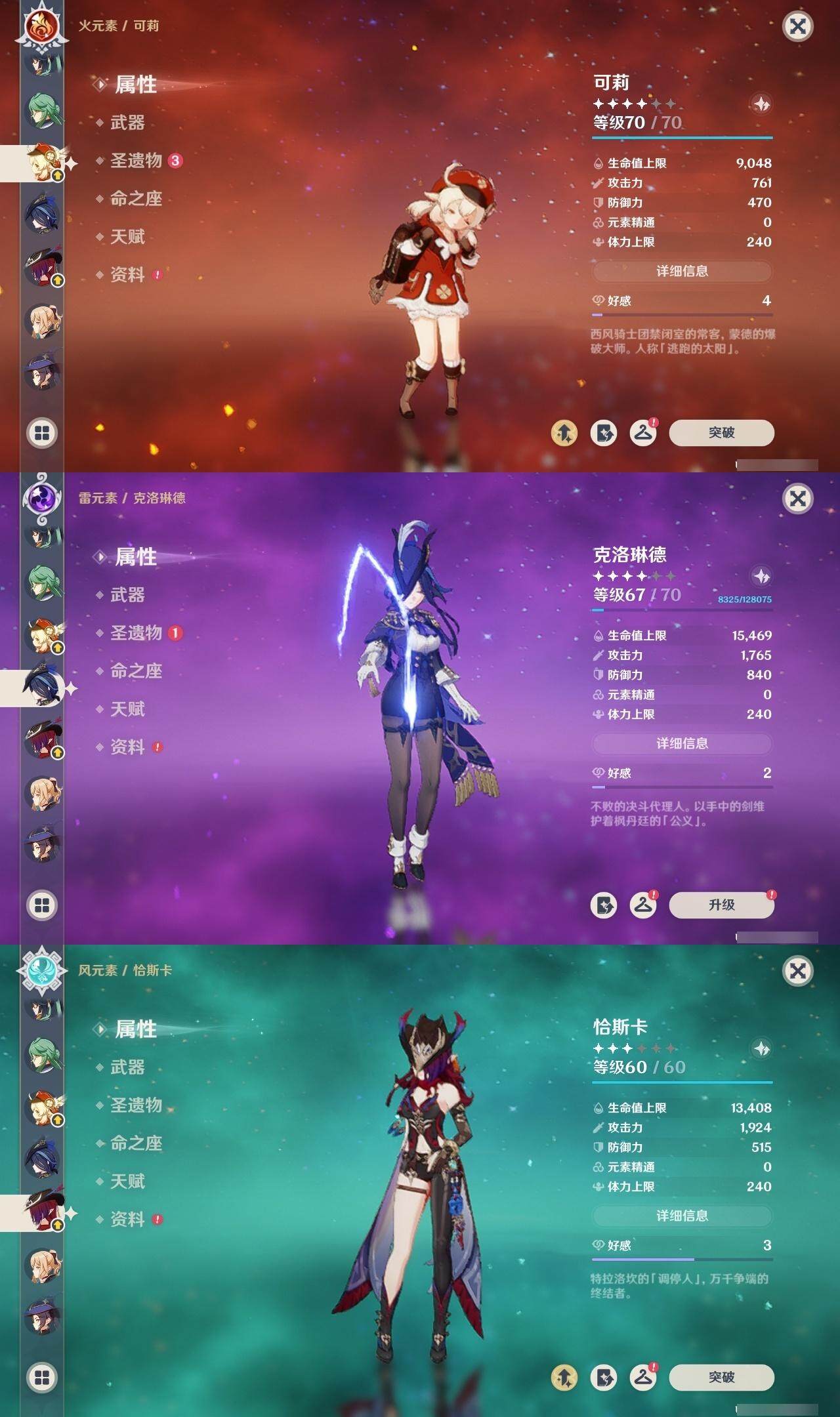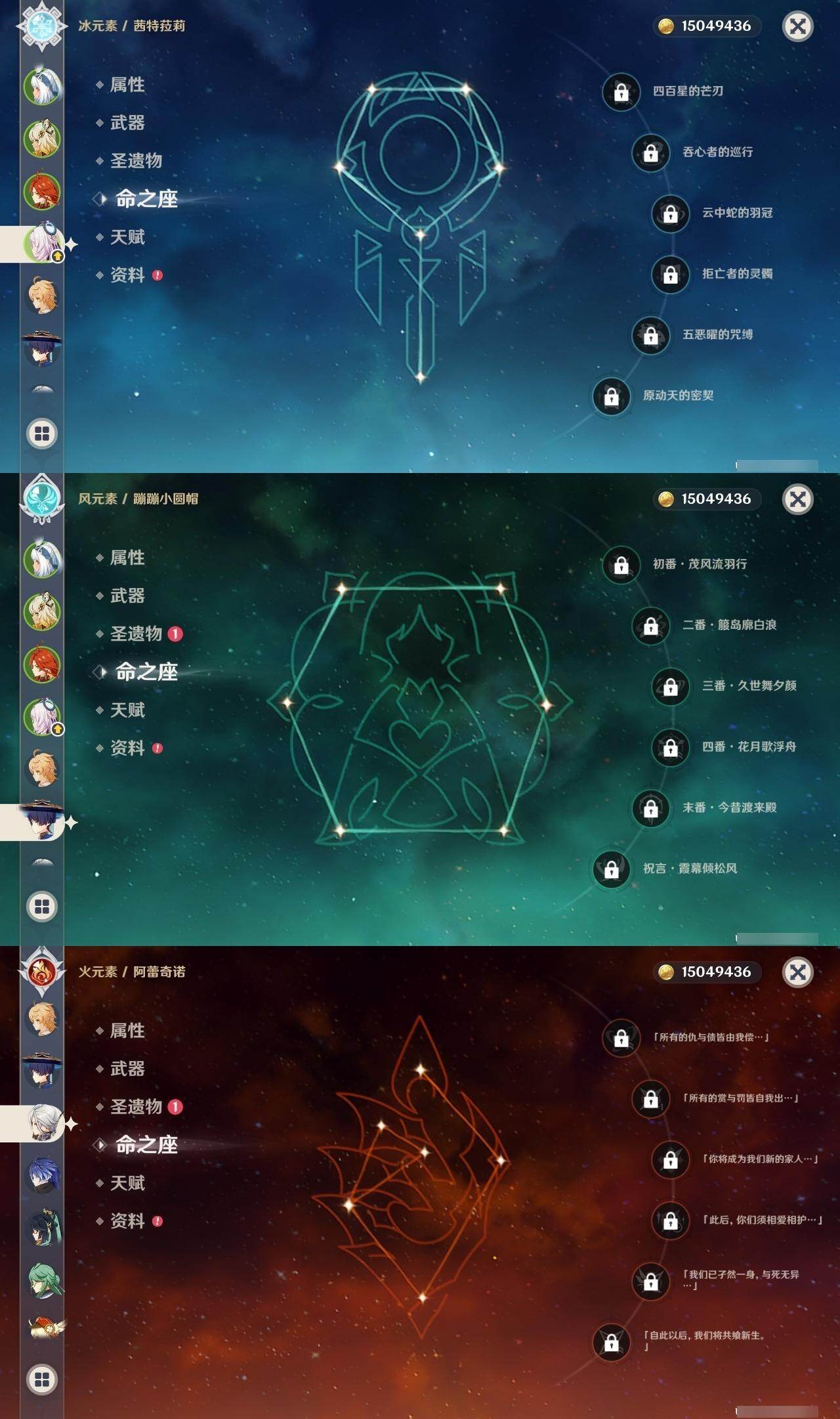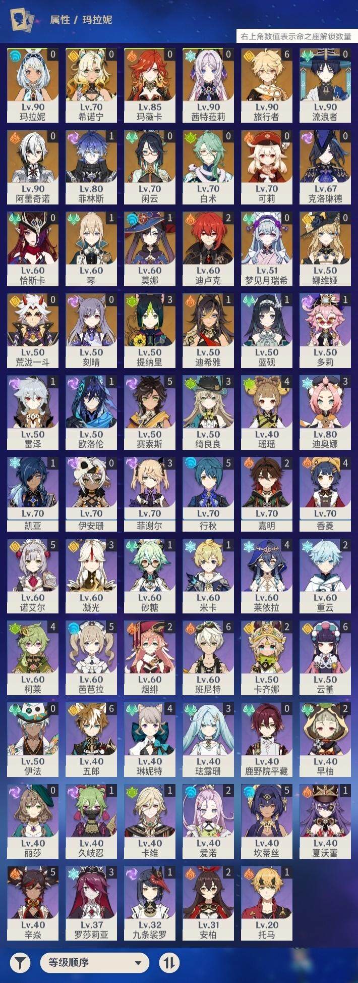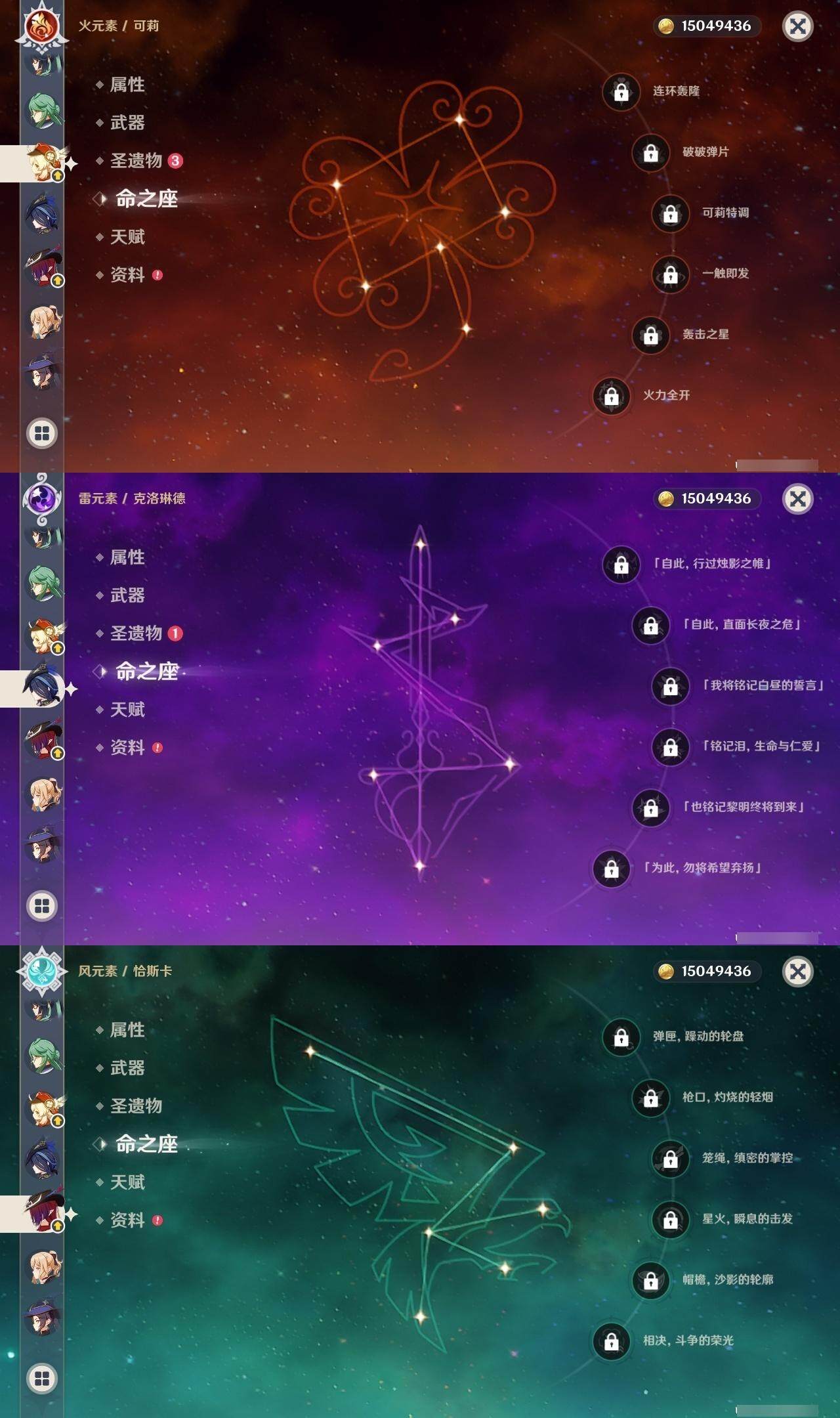 0命克洛琳德,0命阿蕾奇诺,0命闲云,0命娜维娅,0命白术,1命迪希雅,0命流浪者,3命提纳里,0命荒泷一斗,0命可莉,0命刻晴,1命琴,1命莫娜,2命迪卢克,0命希诺宁,0命玛拉妮,0命恰斯卡,0命玛薇卡,0命茜特菈莉,0命梦见月瑞希,1命菲林斯,精1四风原典,精1和璞鸢,精1天空之翼,精1阿莫斯之弓,精1天空之卷