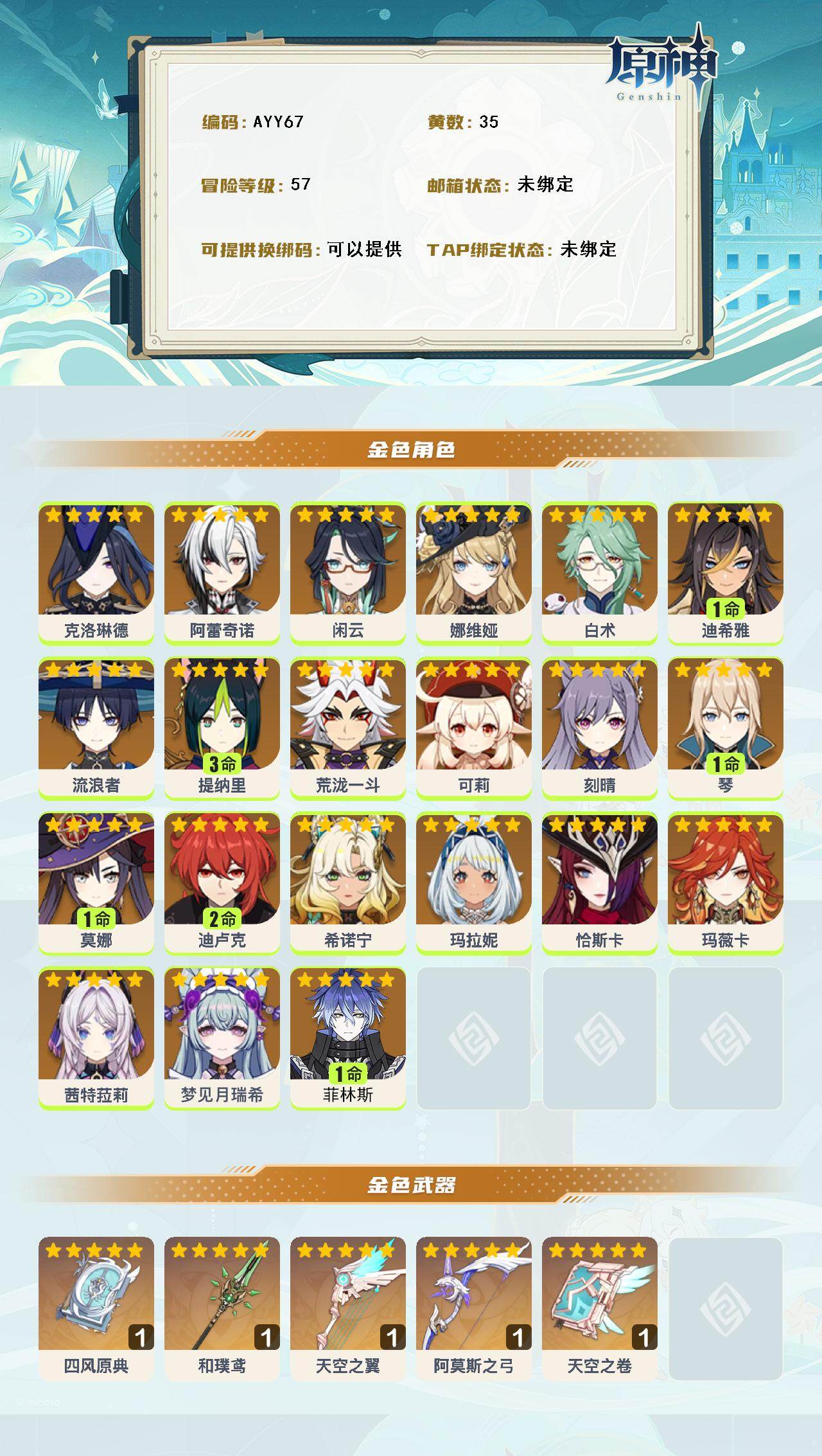 [14735894]57级/35黄/男主/21个五星角色/5个五星武器 0命克洛琳德,0命阿蕾奇诺,0命闲云,0命娜维娅,0命白术,1命迪希雅,0命流浪者,3命提纳里,0命荒泷一斗,0命可莉,0命刻晴,1命琴,1命莫娜,2命迪卢克,0命希诺宁,0命玛拉妮,0命恰斯卡,0命玛薇卡,0命茜特菈莉,0命梦见月瑞希,1命菲林斯,精1四风原典,精1和璞鸢,精1天空之翼,精1阿莫斯之弓,精1天空之卷