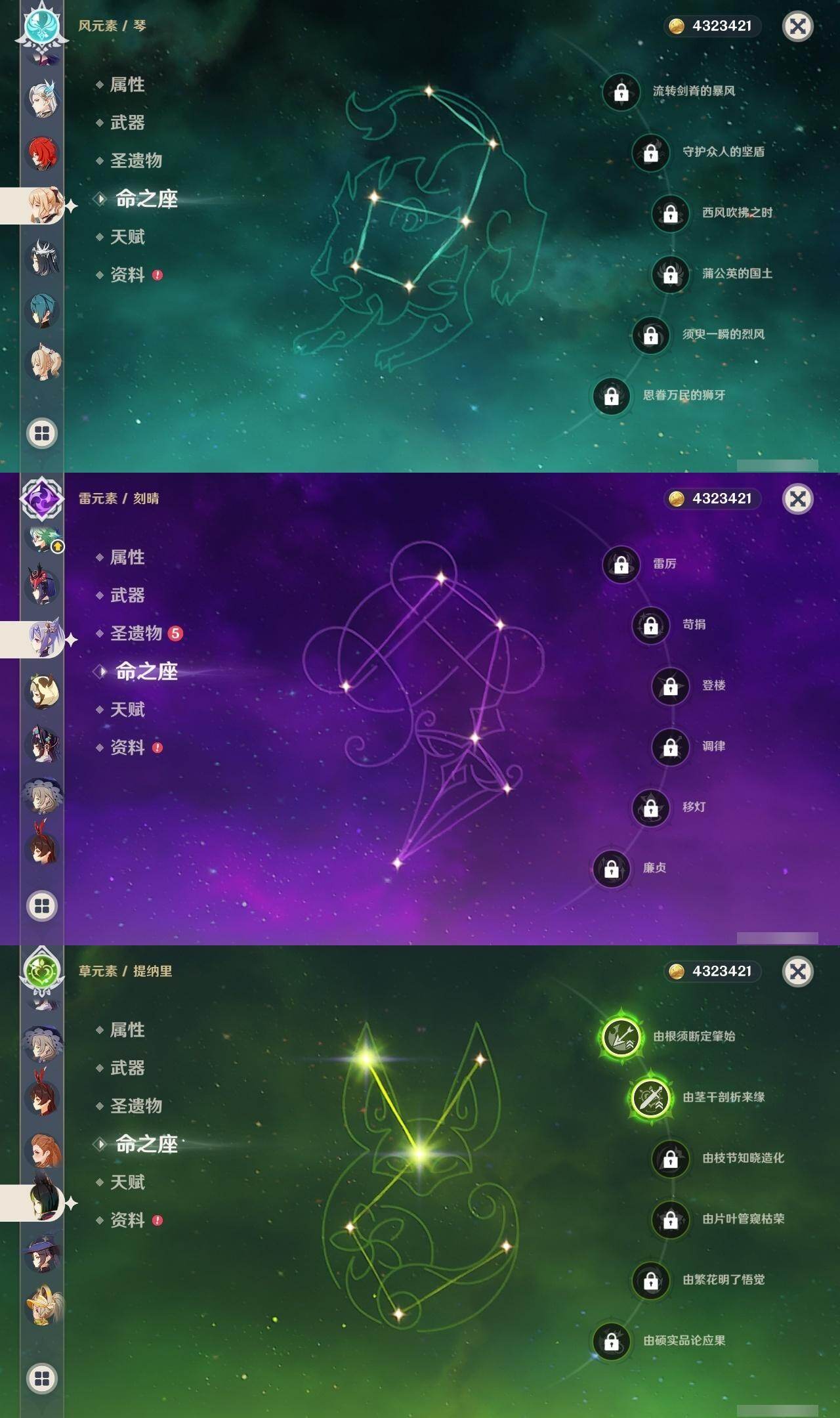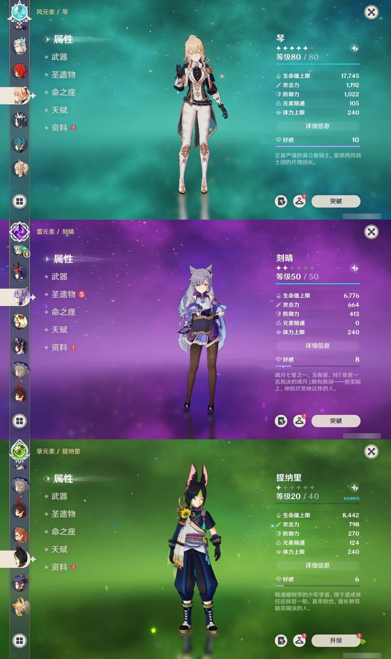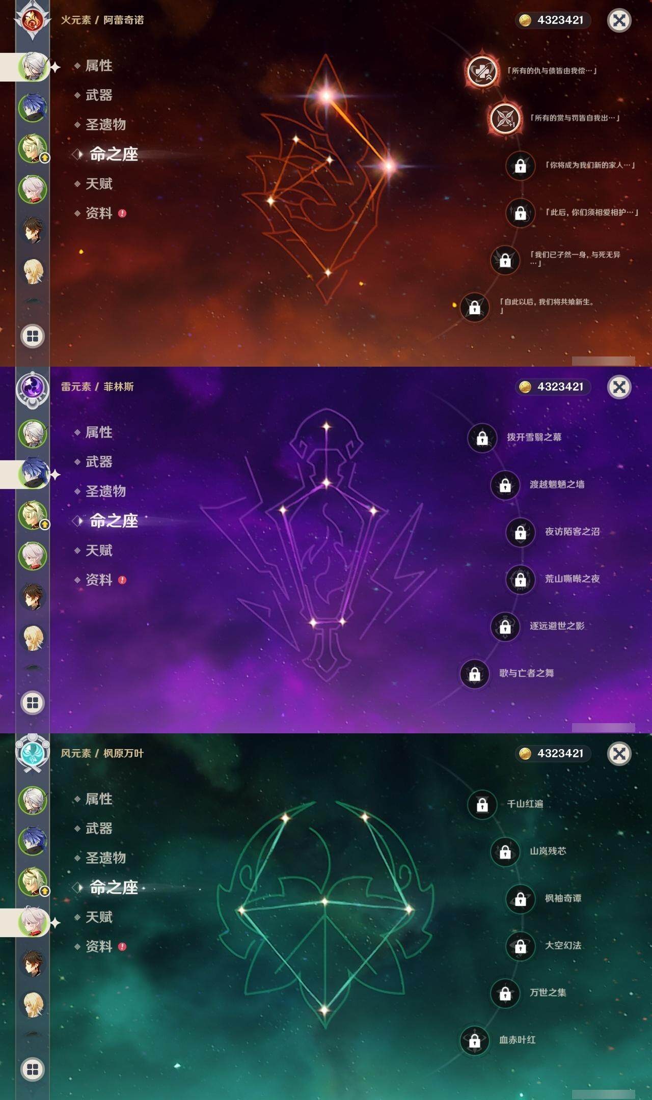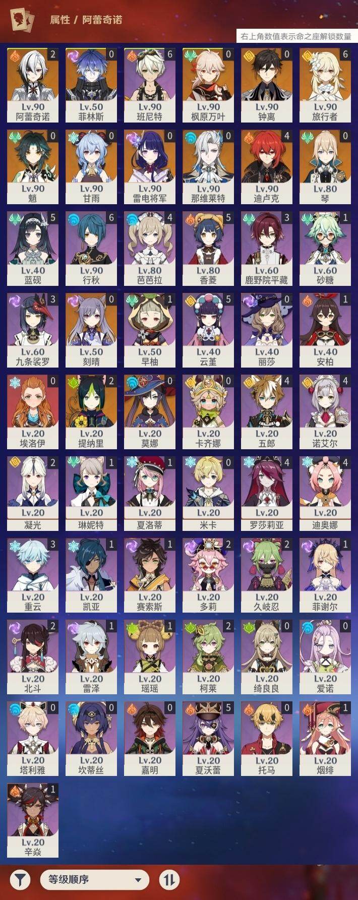 2命阿蕾奇诺,0命那维莱特,2命提纳里,0命雷电将军,0命枫原万叶,0命钟离,0命甘雨,0命魈,0命刻晴,0命琴,0命莫娜,4命迪卢克,0命菲林斯,精1赤月之形,精1息灾,精1雾切之回光,精1和璞鸢,精1天空之脊