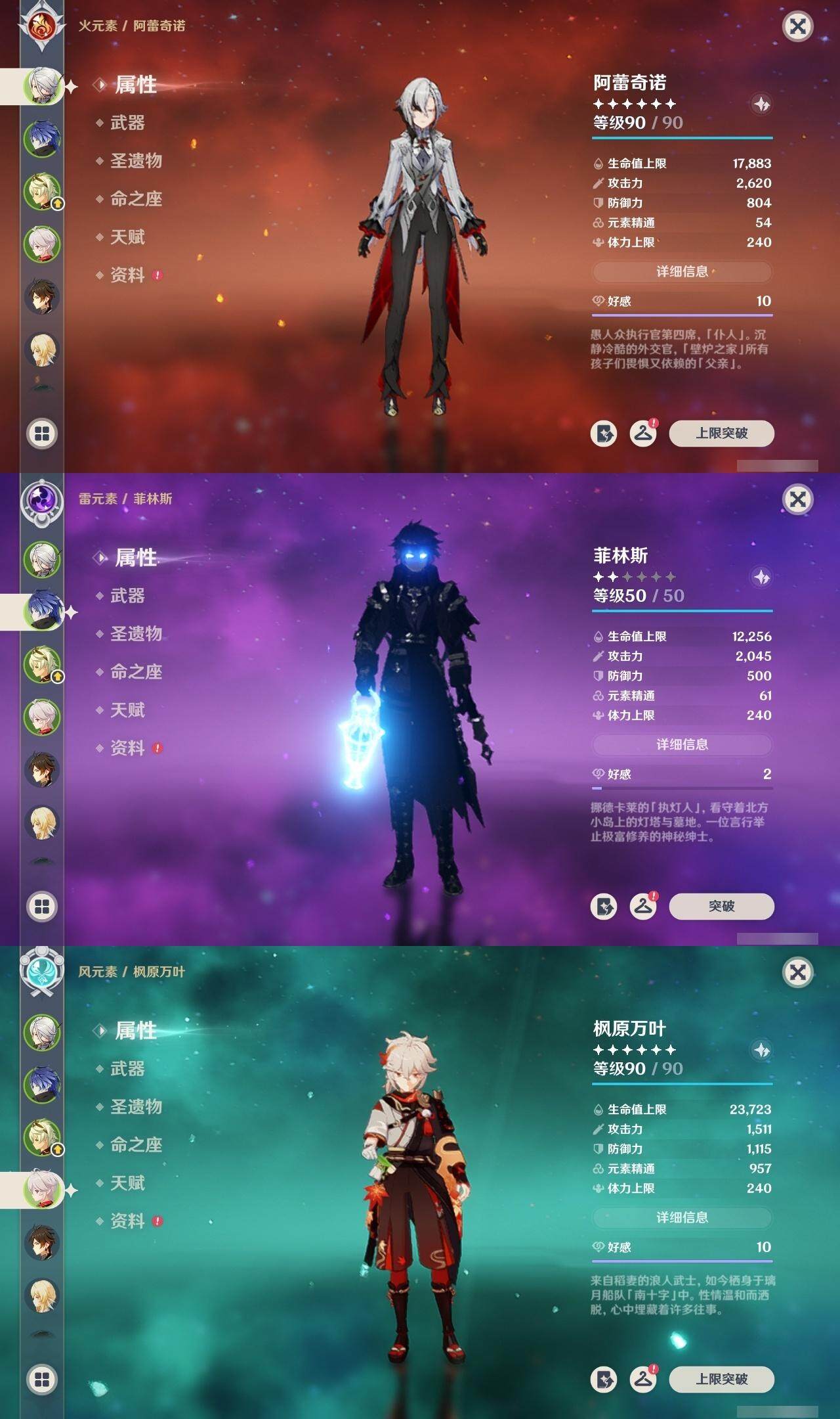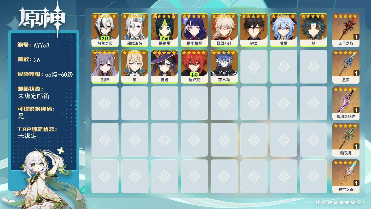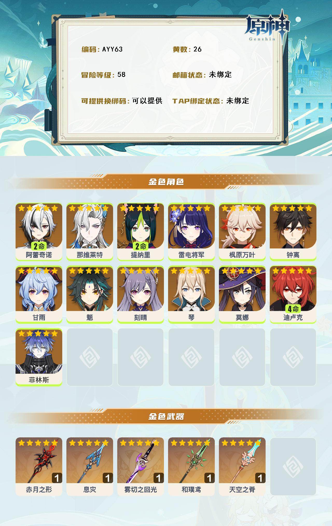 [14735971]58级/26黄/女主/13个五星角色/5个五星武器 2命阿蕾奇诺,0命那维莱特,2命提纳里,0命雷电将军,0命枫原万叶,0命钟离,0命甘雨,0命魈,0命刻晴,0命琴,0命莫娜,4命迪卢克,0命菲林斯,精1赤月之形,精1息灾,精1雾切之回光,精1和璞鸢,精1天空之脊