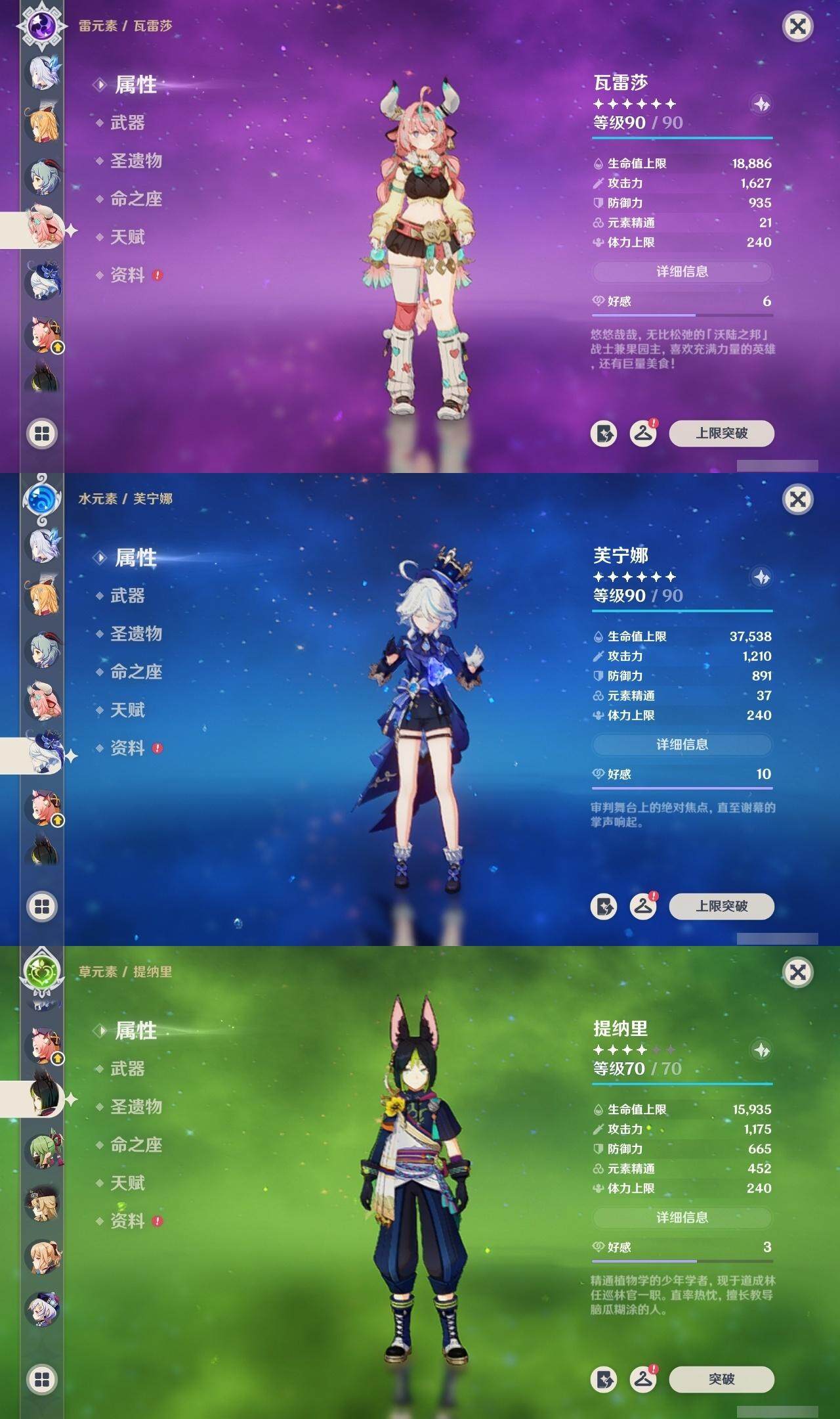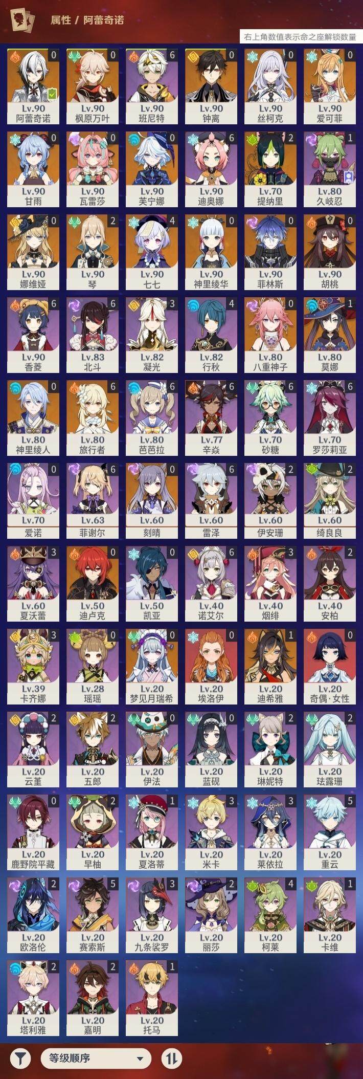 - [15331884]60级/52黄/女主/31个五星角色 0命克洛琳德,0命阿蕾奇诺,0命娜维娅,2命芙宁娜,3命那维莱特,0命白术,0命迪希雅,0命艾尔海森,0命纳西妲,3命提纳里,1命夜兰,0命神里绫人,0命雷电将军,0命枫原万叶,0命神里绫华,0命钟离,1命胡桃,0命甘雨,0命魈,0命宵宫,0命珊瑚宫心海,4命刻晴,1命七七,2命琴,2命莫娜,2命迪卢克,0命基尼奇,0命希诺宁,0命梦见月瑞希,0命爱可菲,0命杜林
