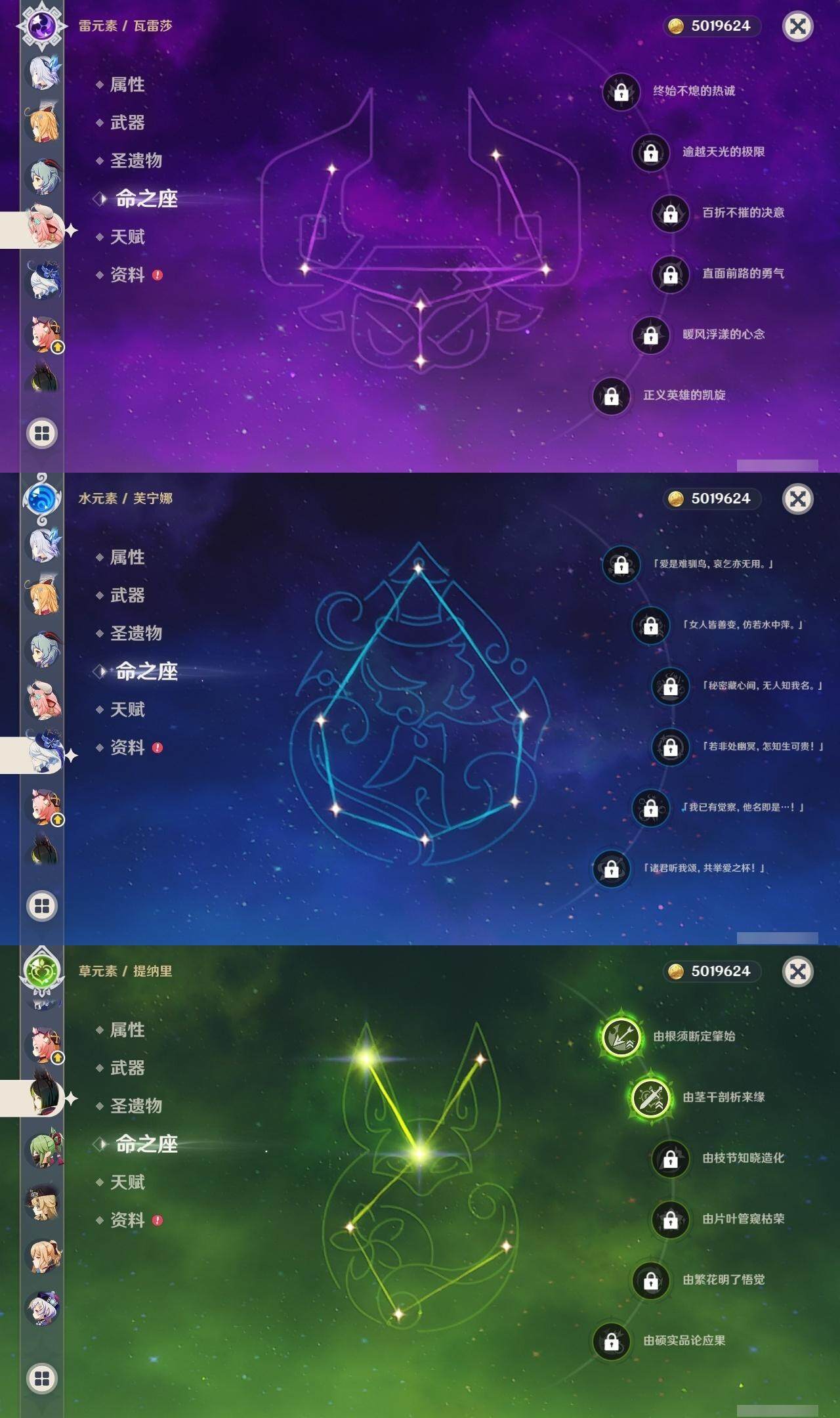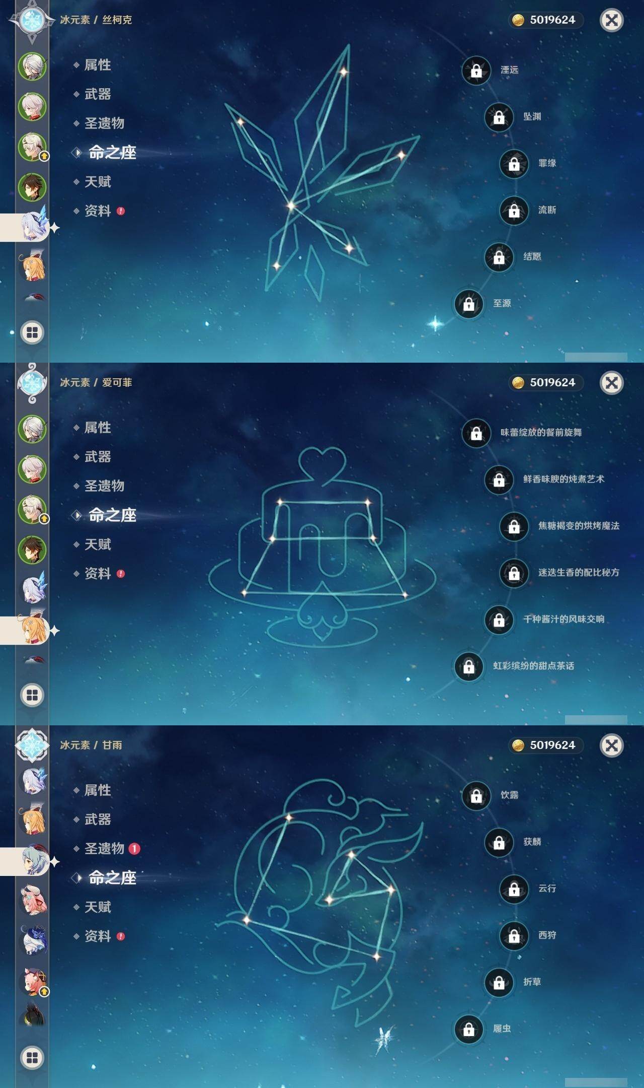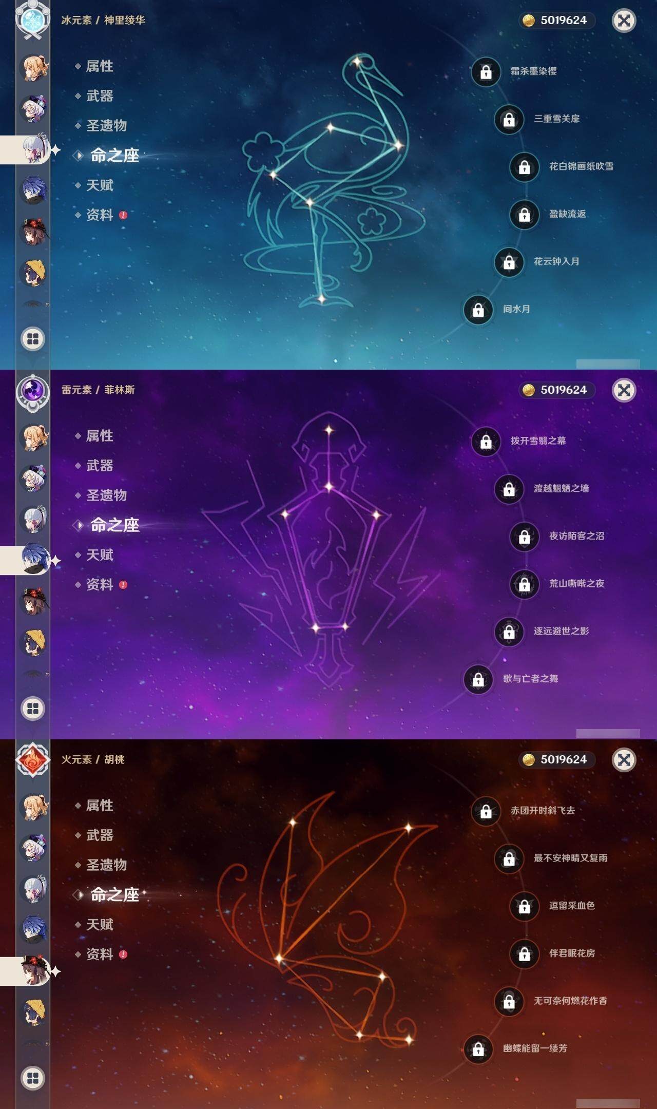 0命阿蕾奇诺,0命娜维娅,0命芙宁娜,1命迪希雅,2命提纳里,0命神里绫人,0命八重神子,0命枫原万叶,0命神里绫华,0命钟离,0命胡桃,0命甘雨,0命刻晴,4命七七,2命琴,1命莫娜,0命迪卢克,0命梦见月瑞希,0命瓦雷莎,0命爱可菲,0命丝柯克,0命菲林斯,精1赤月之形,精1裁断,精1圣显之钥,精1无工之剑,精1和璞鸢,精1天空之脊,精1贯虹之槊,精1天空之翼,精1阿莫斯之弓,精1天空之傲,精1支离轮光