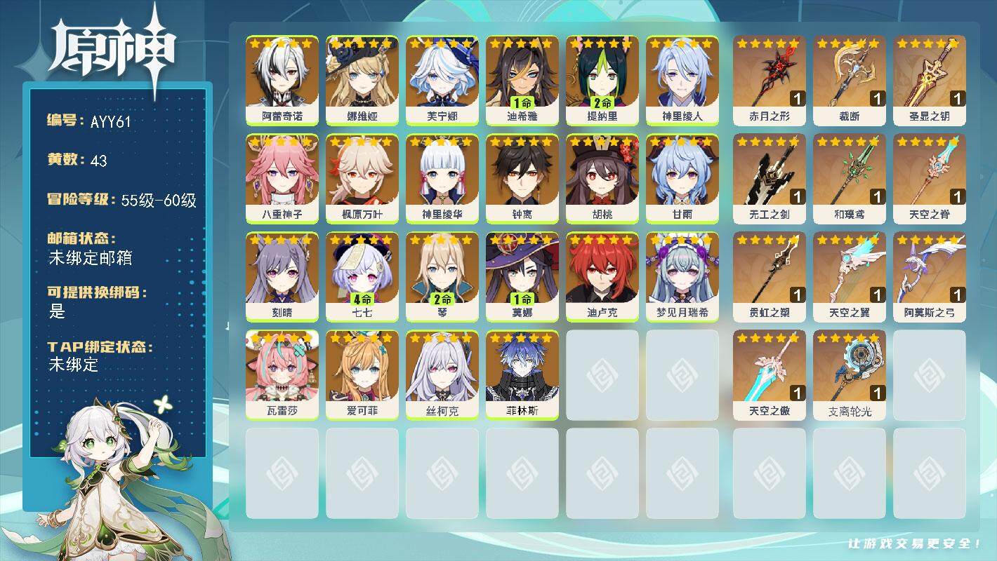 [14735992]60级/43黄/女主/22个五星角色/11个五星武器 0命阿蕾奇诺,0命娜维娅,0命芙宁娜,1命迪希雅,2命提纳里,0命神里绫人,0命八重神子,0命枫原万叶,0命神里绫华,0命钟离,0命胡桃,0命甘雨,0命刻晴,4命七七,2命琴,1命莫娜,0命迪卢克,0命梦见月瑞希,0命瓦雷莎,0命爱可菲,0命丝柯克,0命菲林斯,精1赤月之形,精1裁断,精1圣显之钥,精1无工之剑,精1和璞鸢,精1天空之脊,精1贯虹之槊,精1天空之翼,精1阿莫斯之弓,精1天空之傲,精1支离轮光