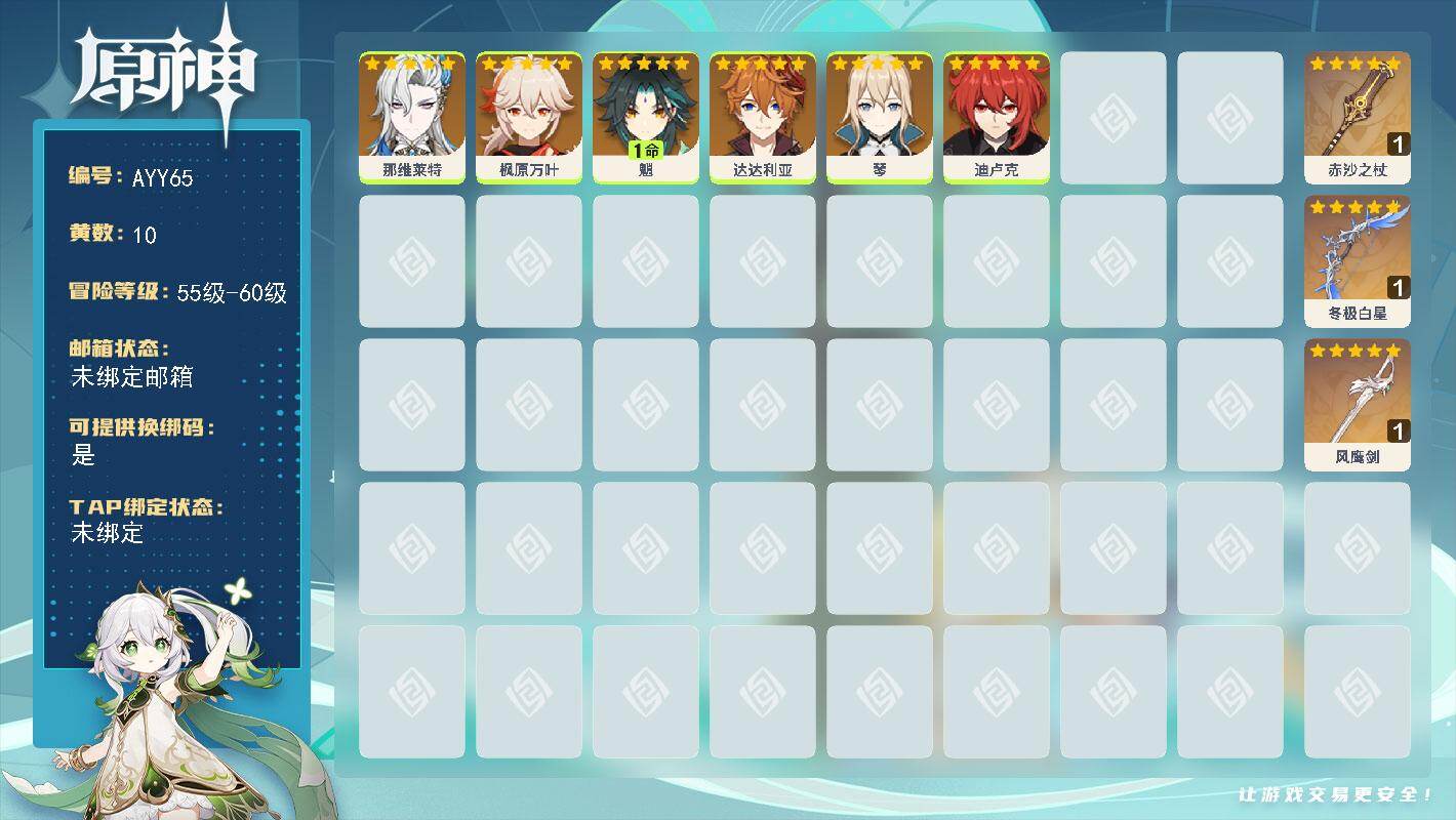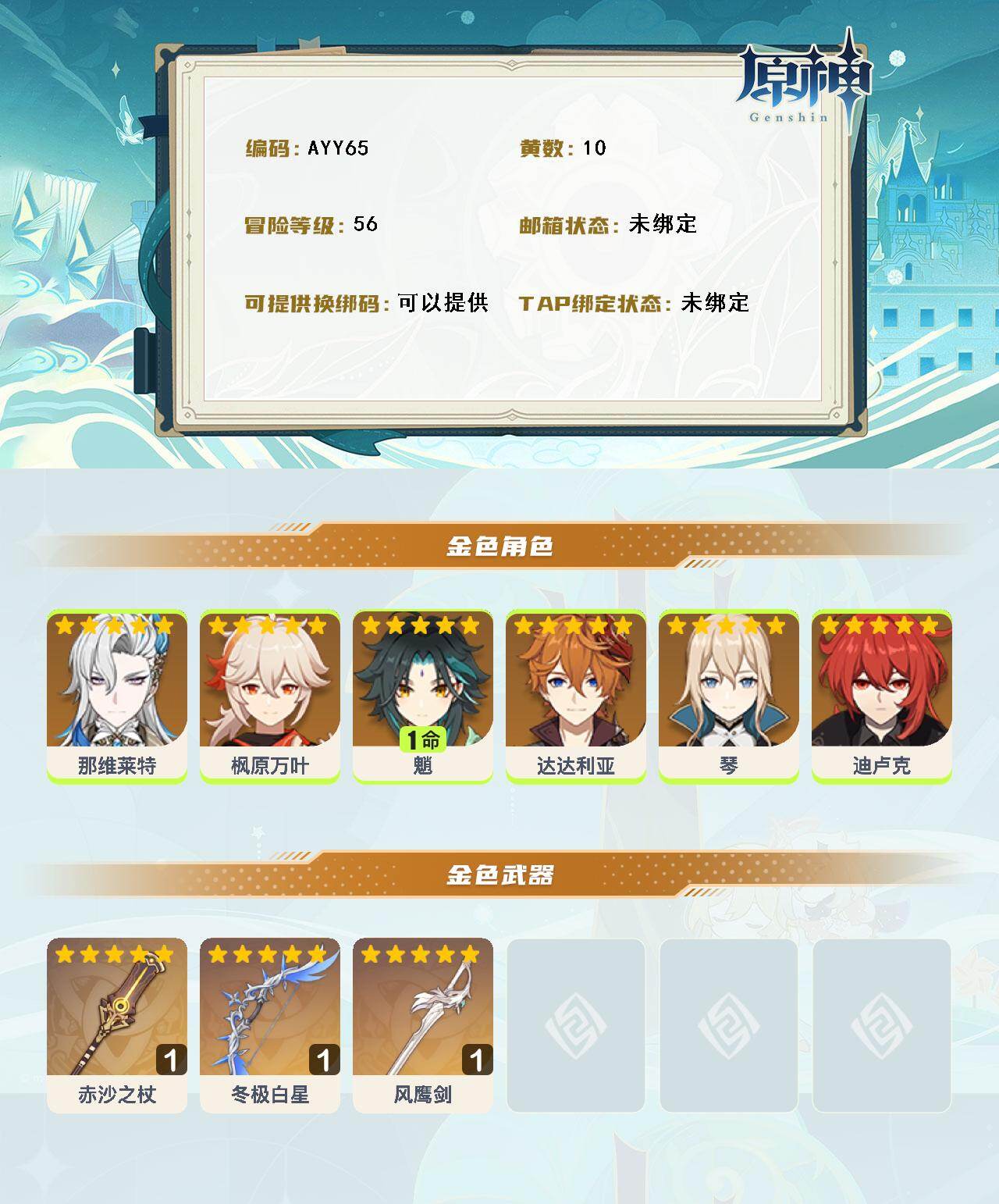 [14736065]56级/10黄/女主/6个五星角色/3个五星武器 0命那维莱特,0命枫原万叶,1命魈,0命达达利亚,0命琴,0命迪卢克,精1赤沙之杖,精1冬极白星,精1风鹰剑