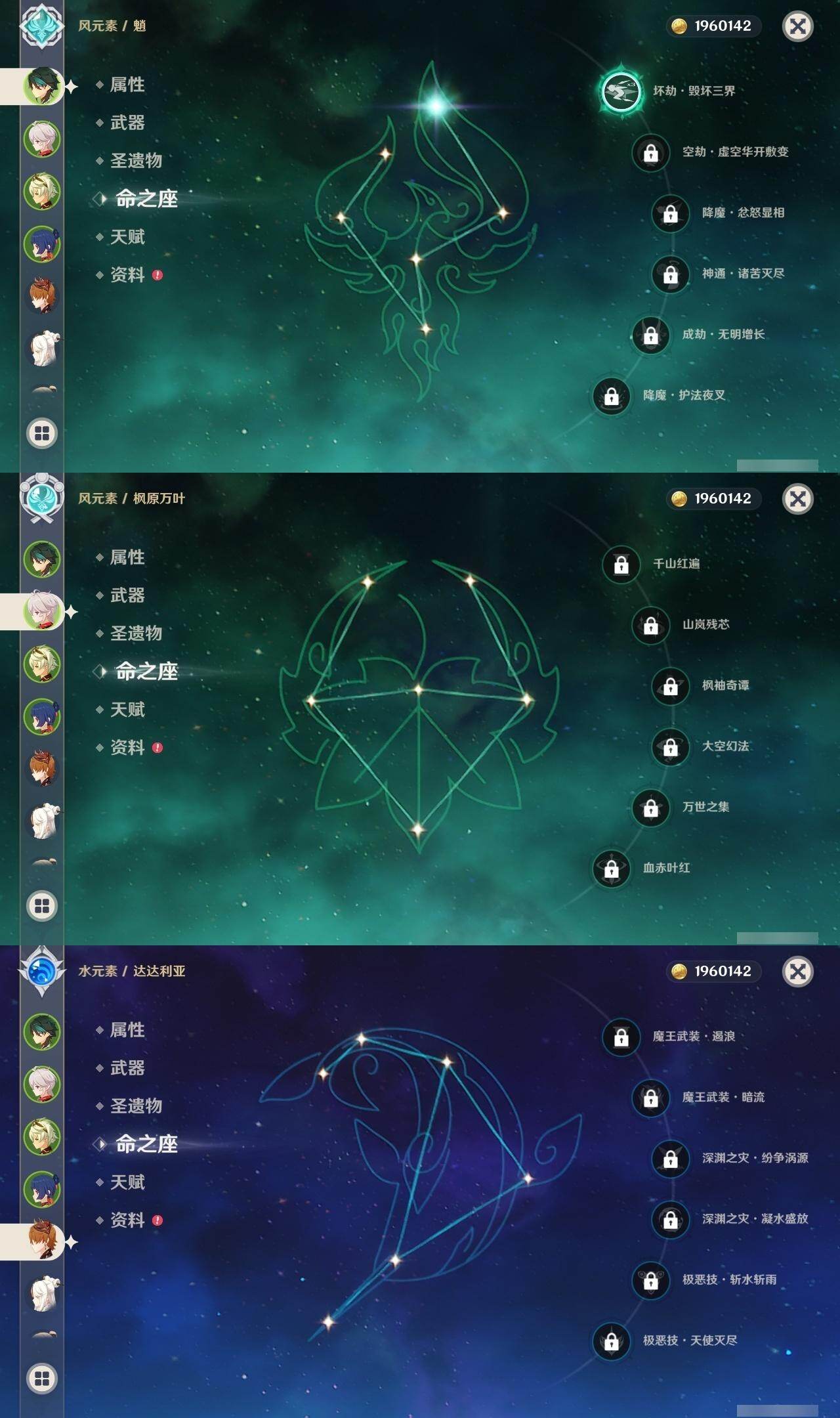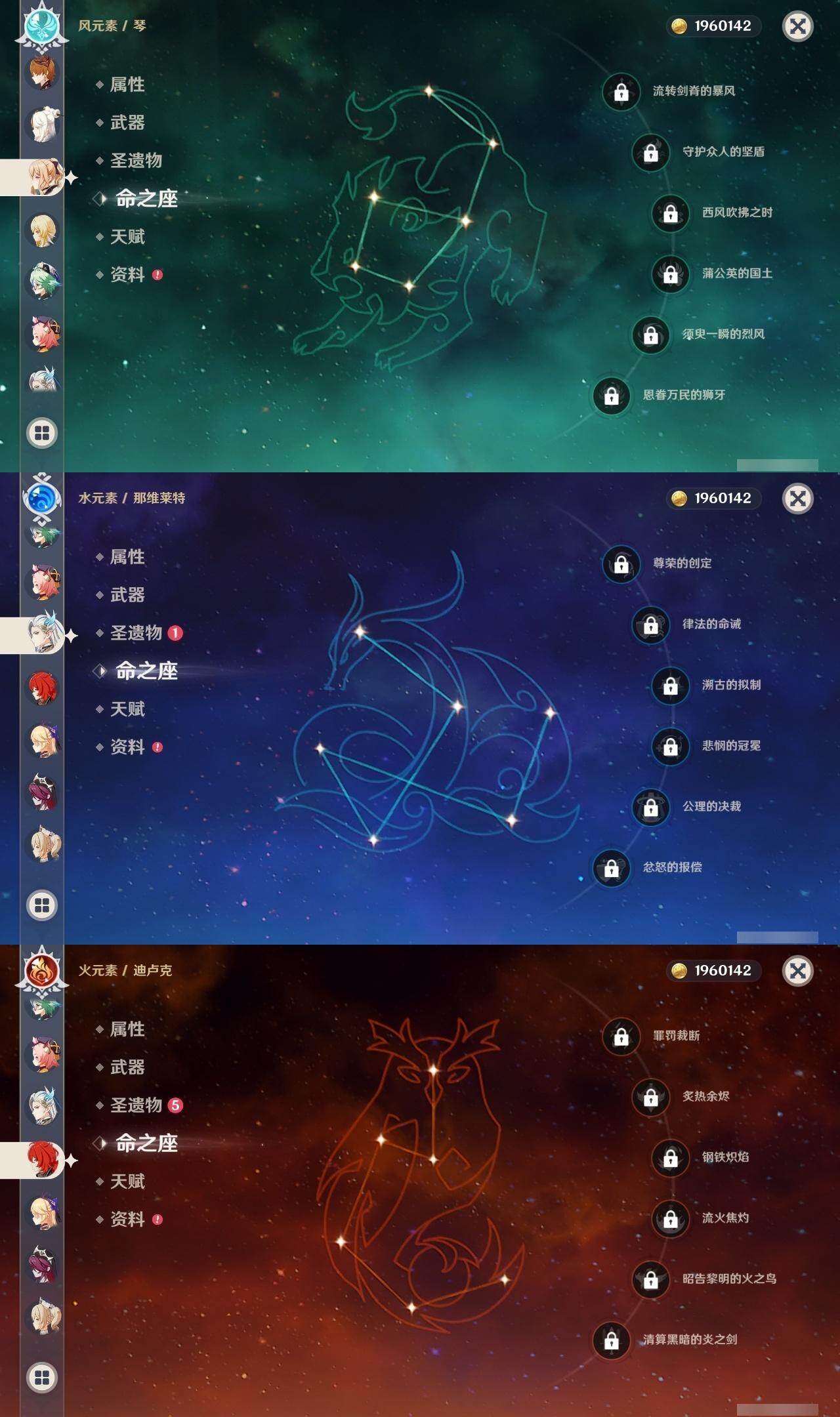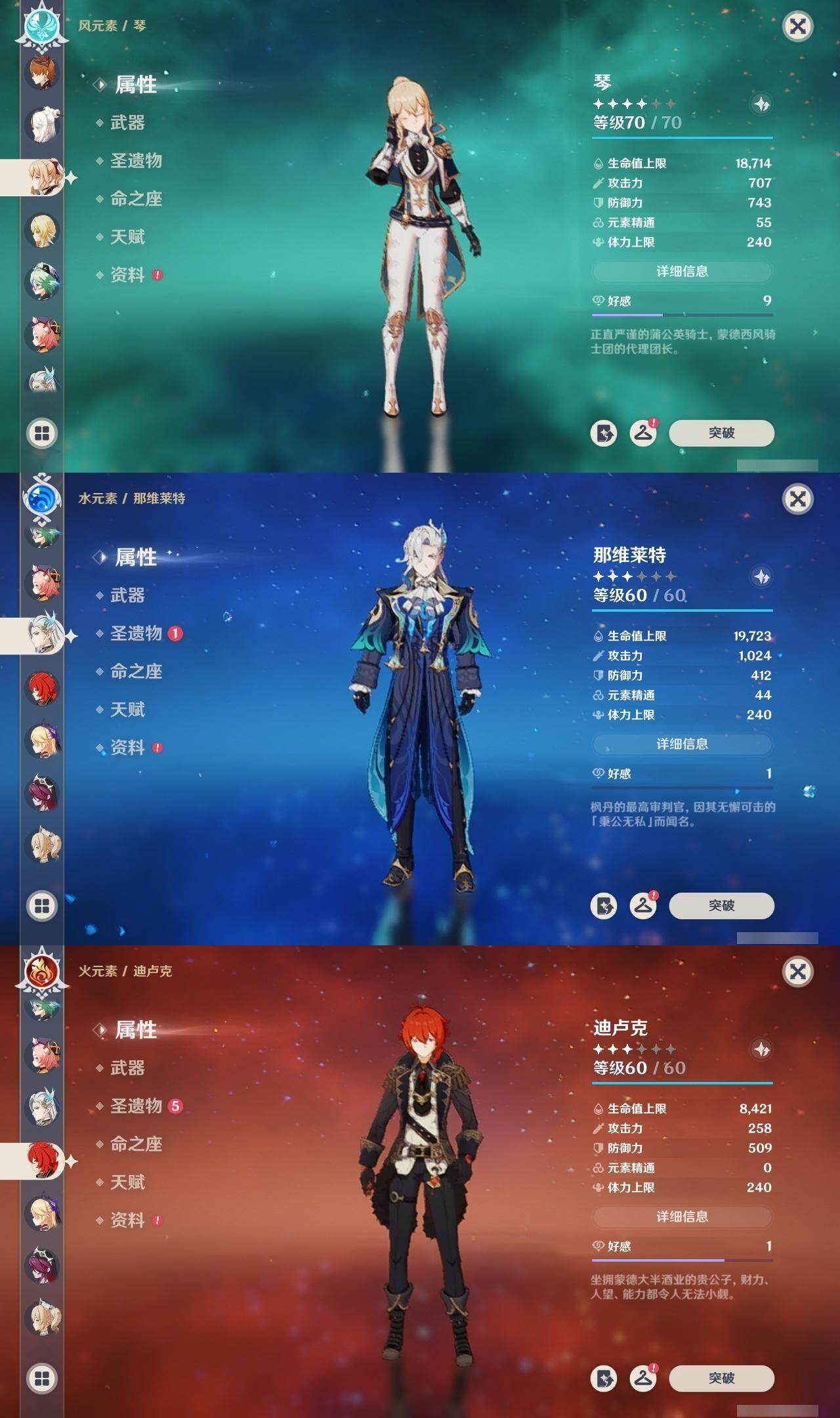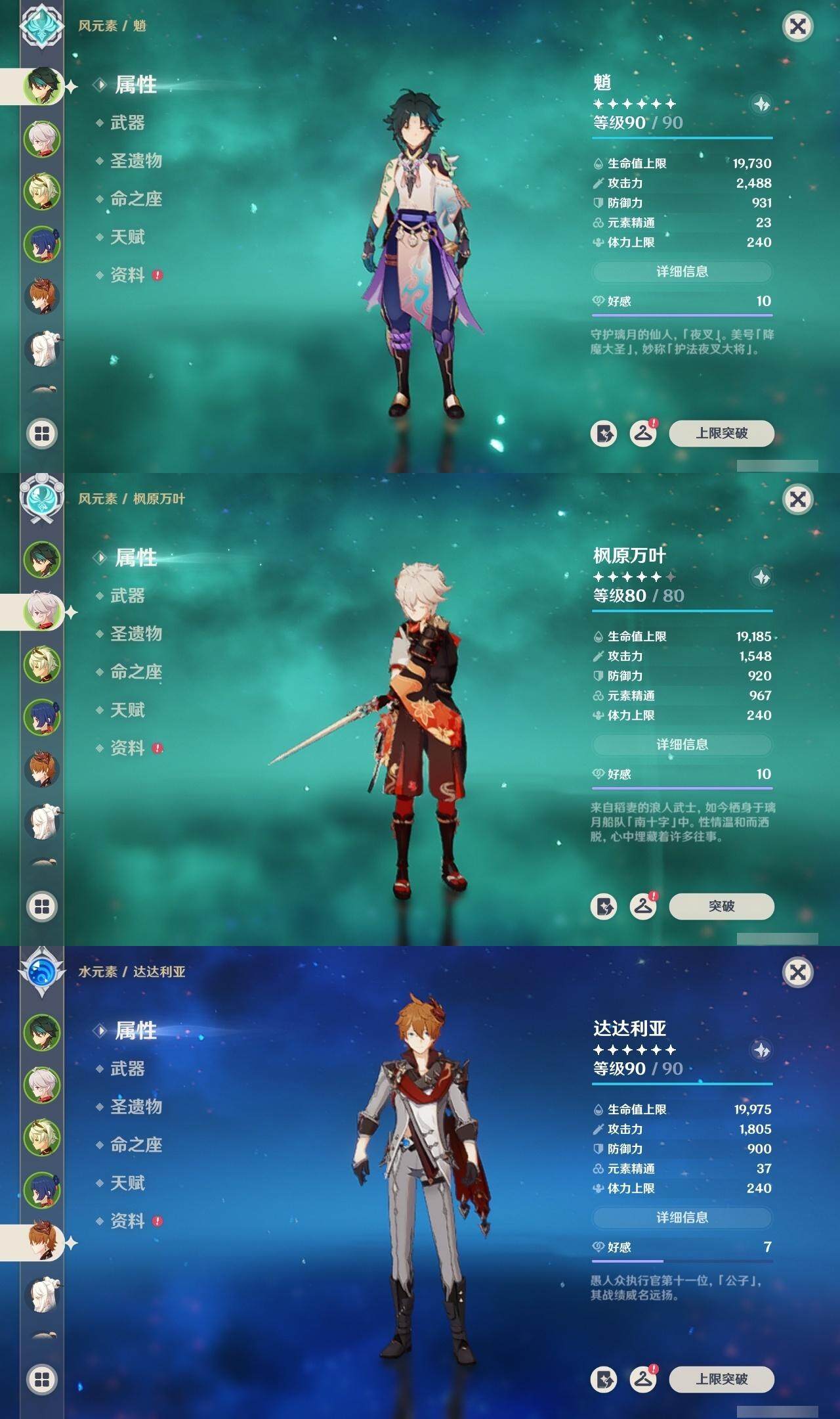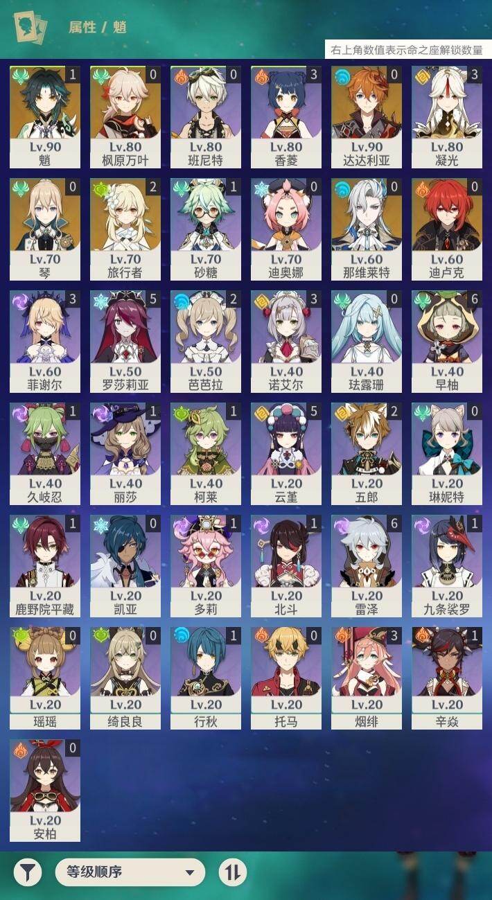 0命那维莱特,0命枫原万叶,1命魈,0命达达利亚,0命琴,0命迪卢克,精1赤沙之杖,精1冬极白星,精1风鹰剑
