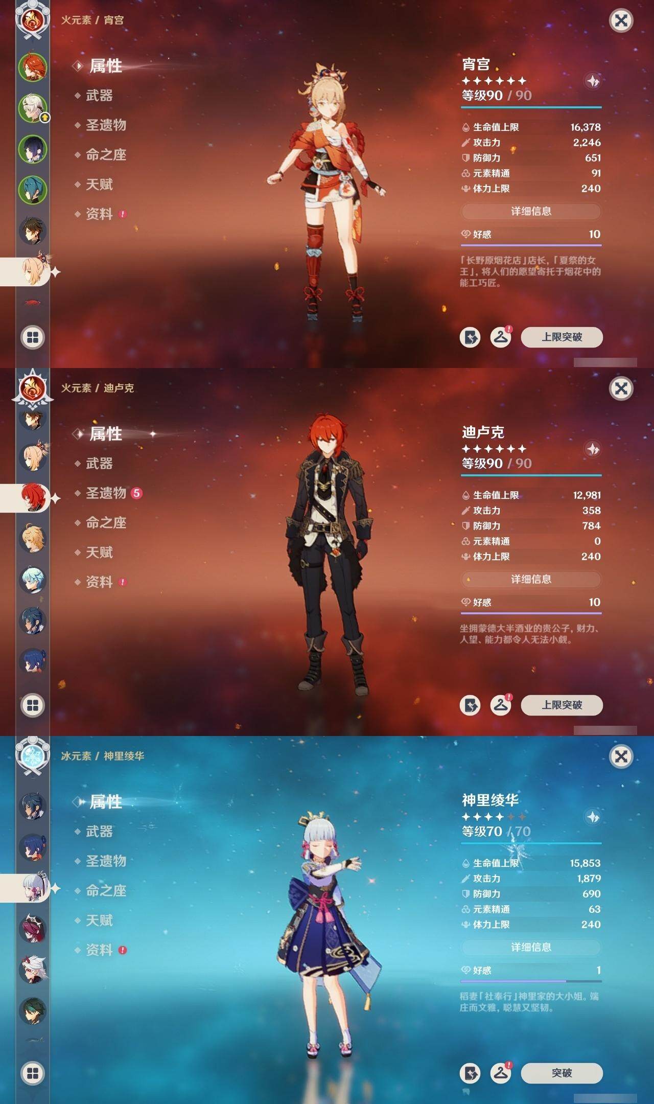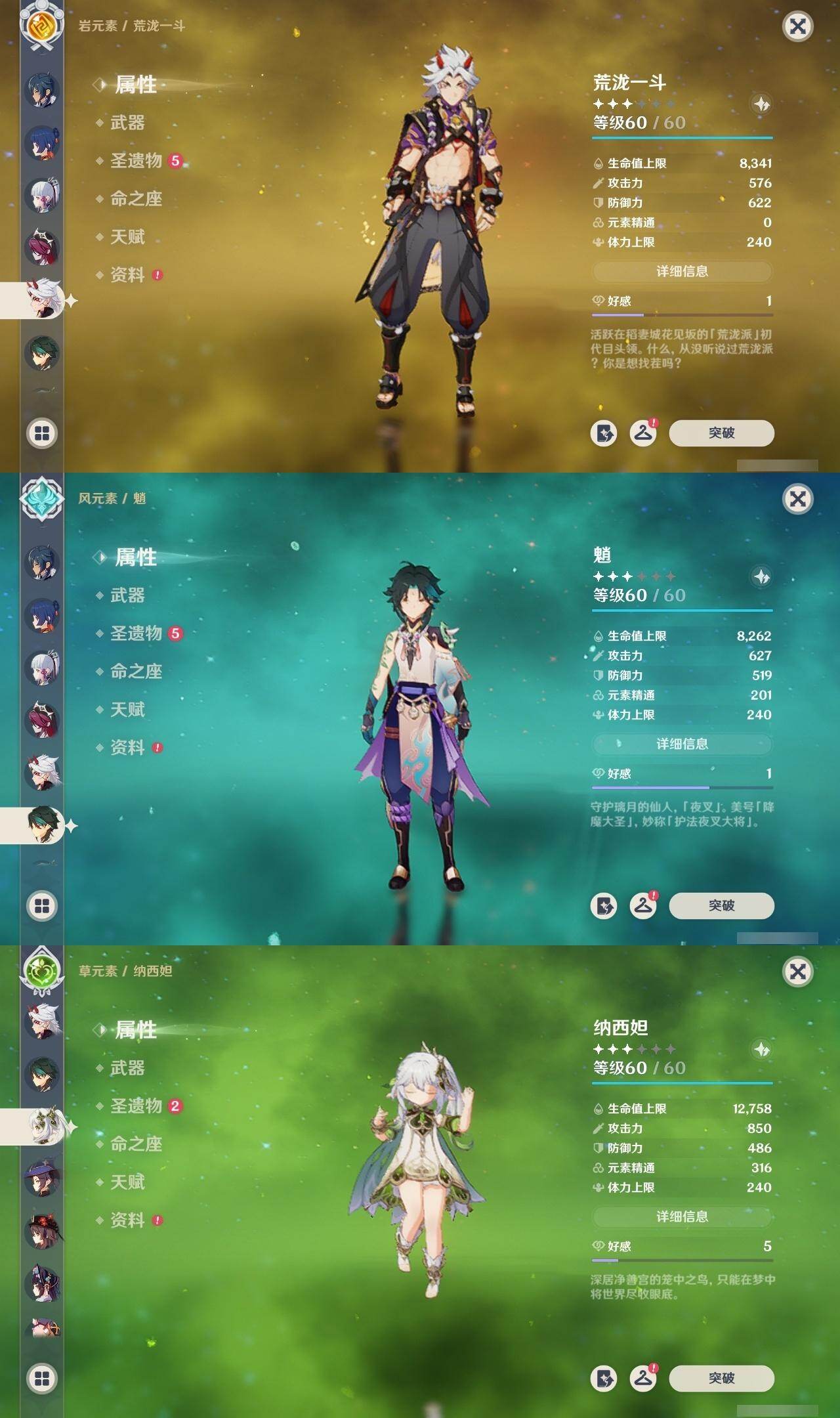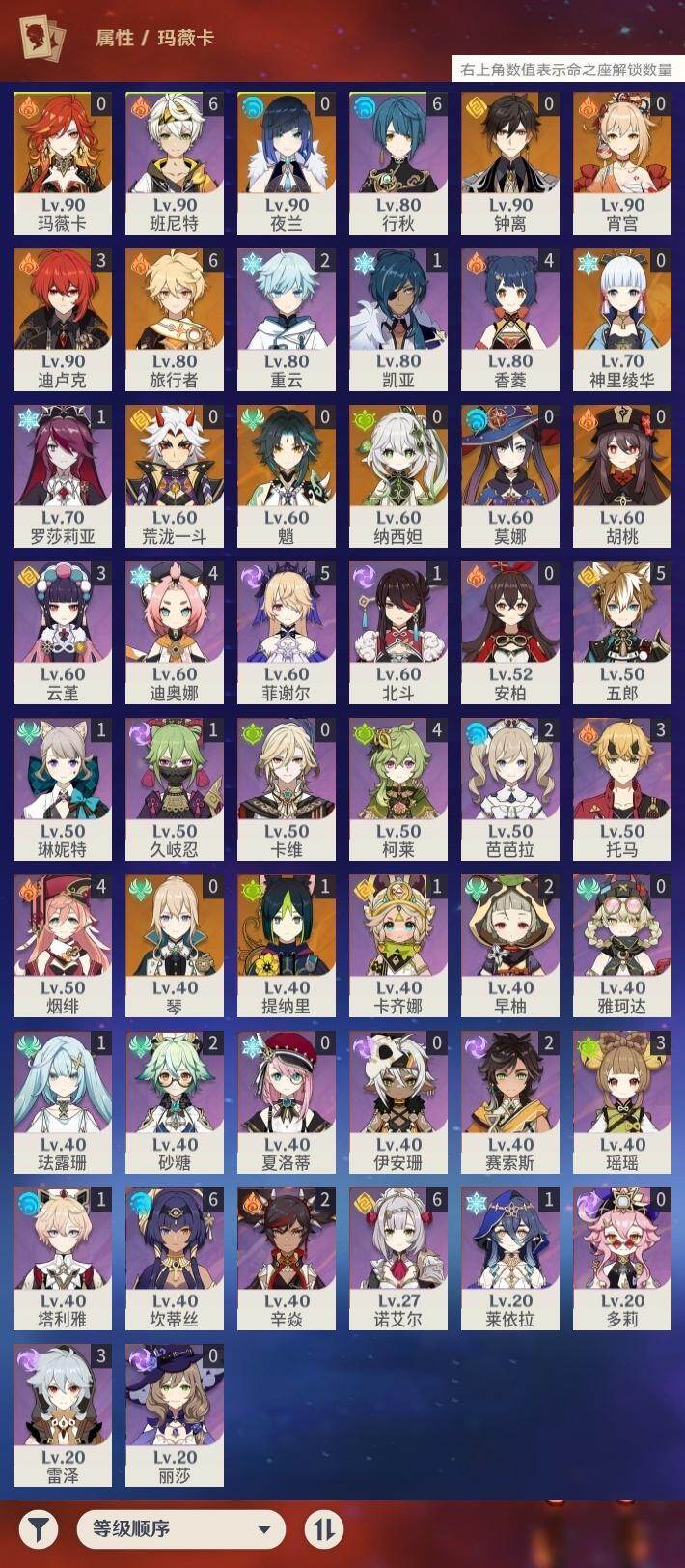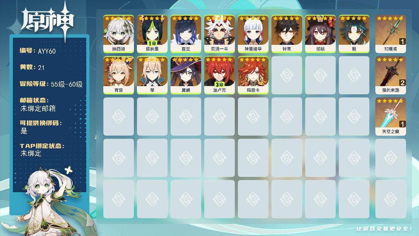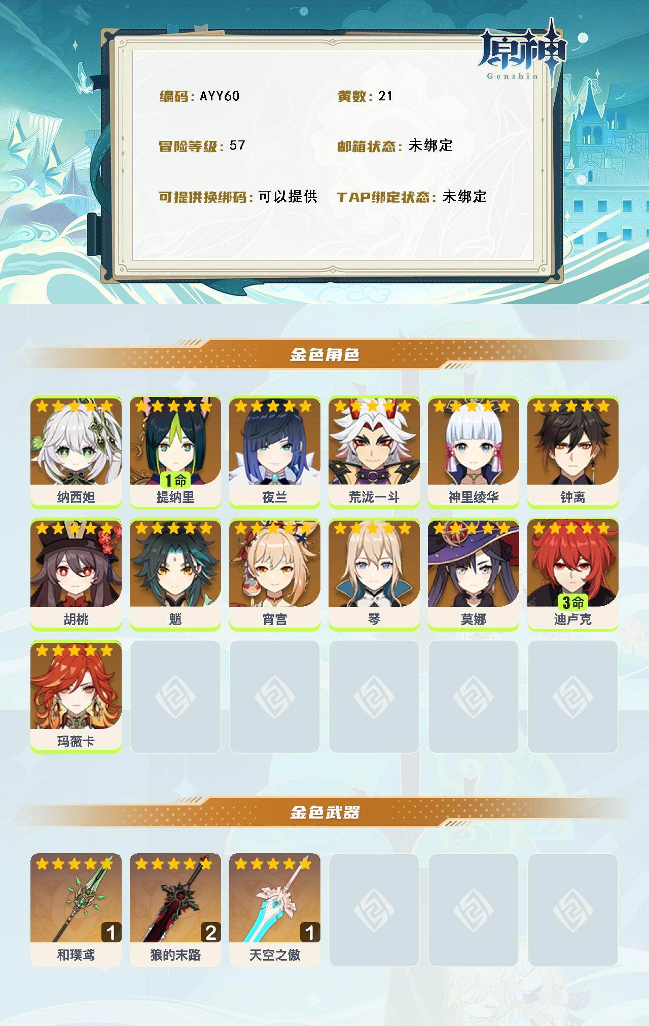 [14736075]57级/21黄/男主/13个五星角色/3个五星武器 0命纳西妲,1命提纳里,0命夜兰,0命荒泷一斗,0命神里绫华,0命钟离,0命胡桃,0命魈,0命宵宫,0命琴,0命莫娜,3命迪卢克,0命玛薇卡,精1和璞鸢,精2狼的末路,精1天空之傲