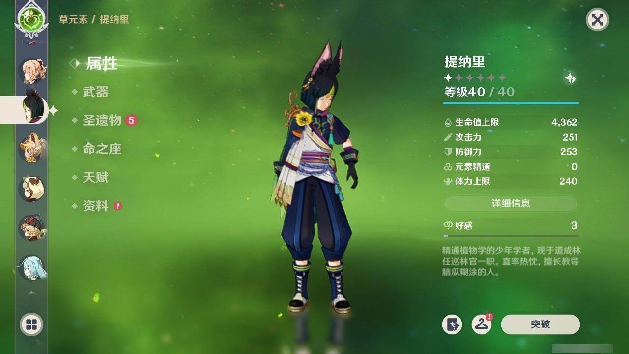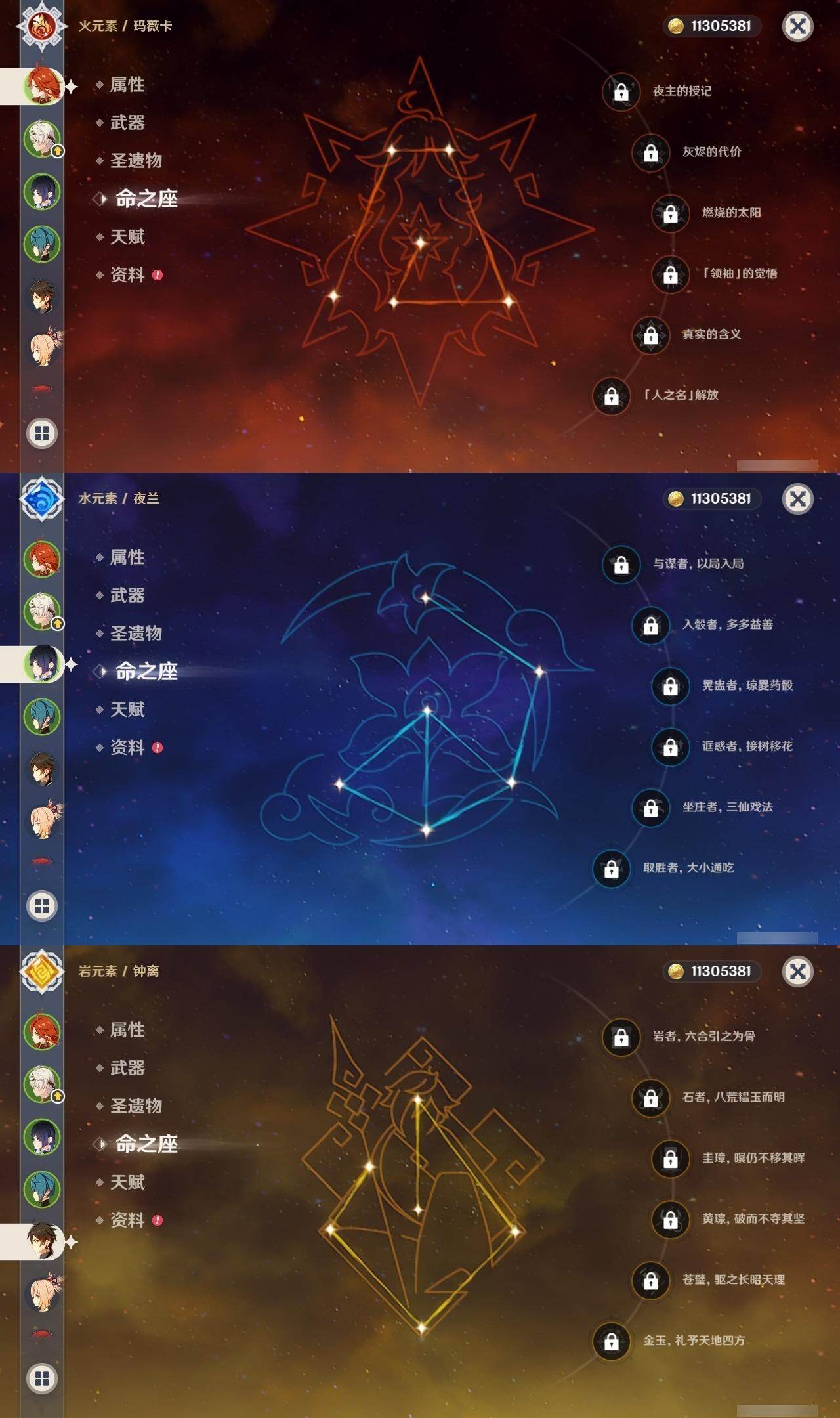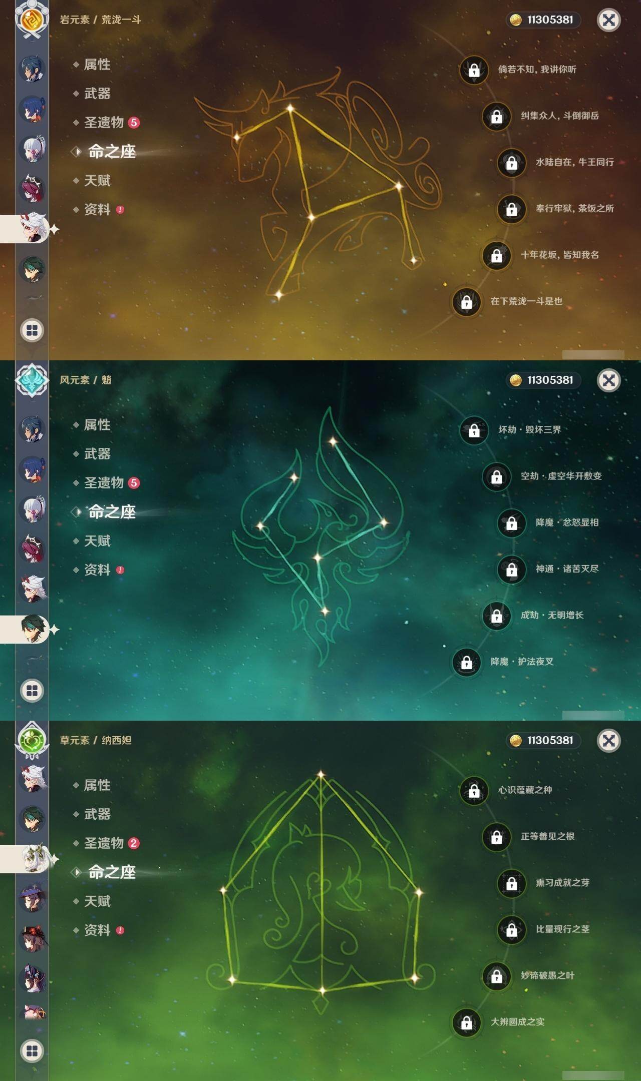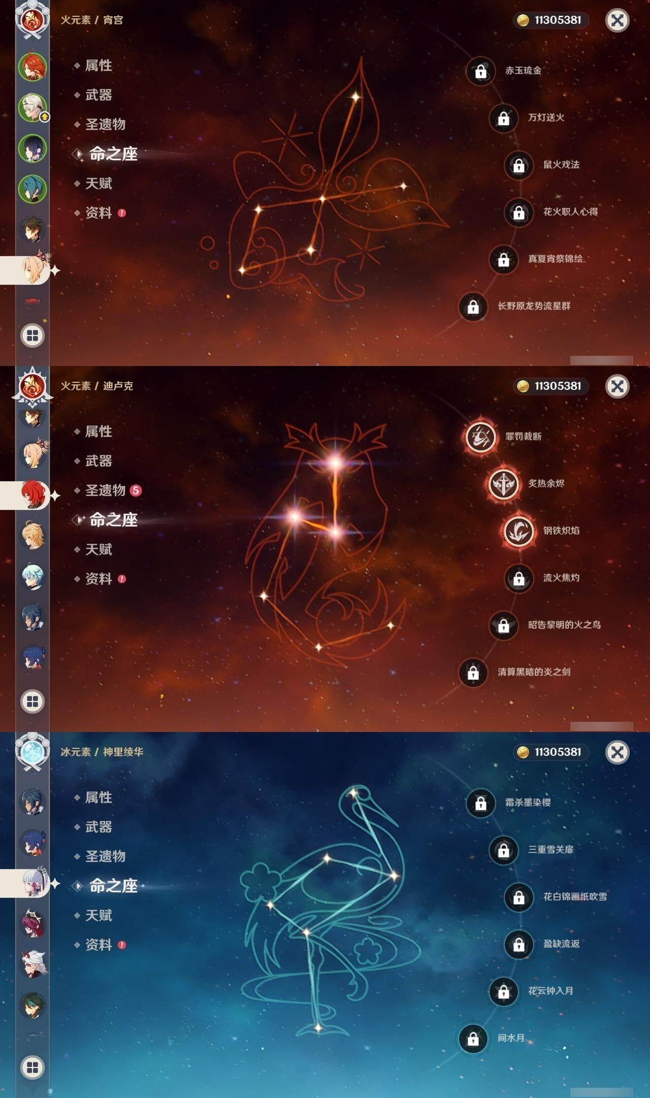 0命纳西妲,1命提纳里,0命夜兰,0命荒泷一斗,0命神里绫华,0命钟离,0命胡桃,0命魈,0命宵宫,0命琴,0命莫娜,3命迪卢克,0命玛薇卡,精1和璞鸢,精2狼的末路,精1天空之傲