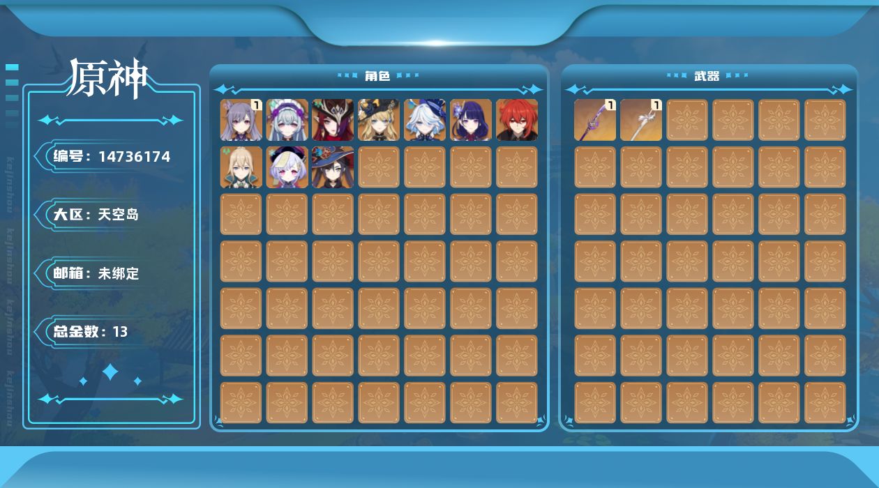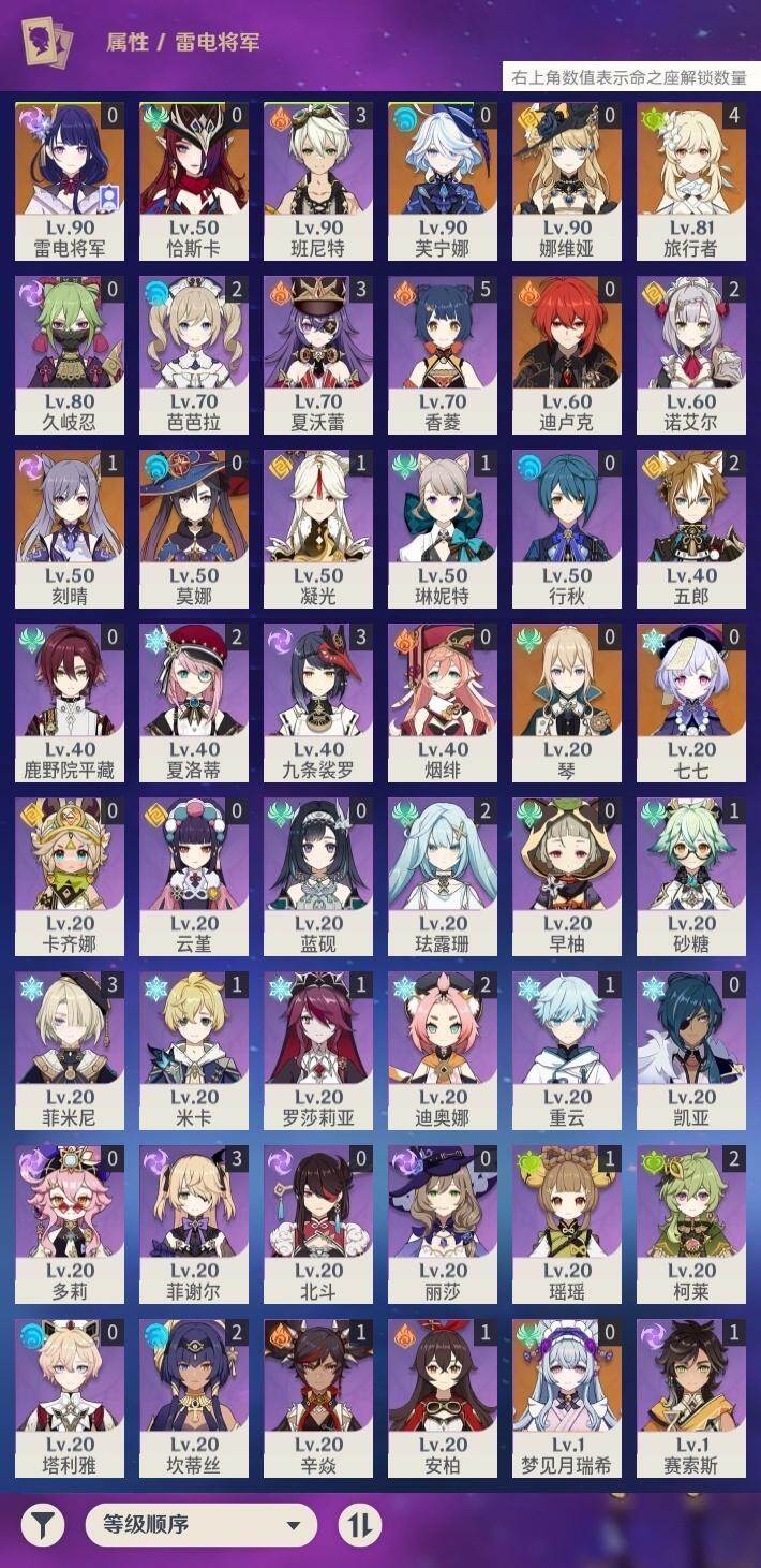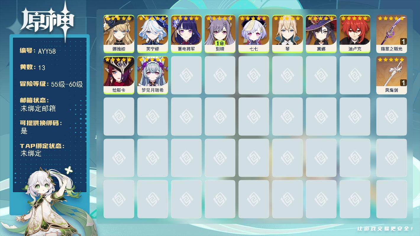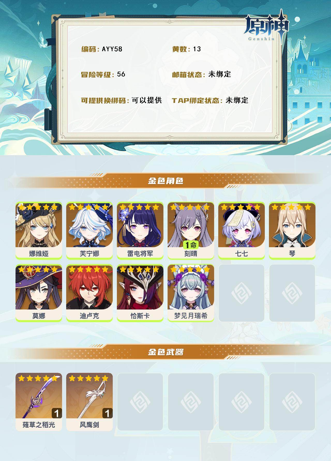 [14736174]56级/13黄/女主/10个五星角色/2个五星武器 0命娜维娅,0命芙宁娜,0命雷电将军,1命刻晴,0命七七,0命琴,0命莫娜,0命迪卢克,0命恰斯卡,0命梦见月瑞希,精1薙草之稻光,精1风鹰剑