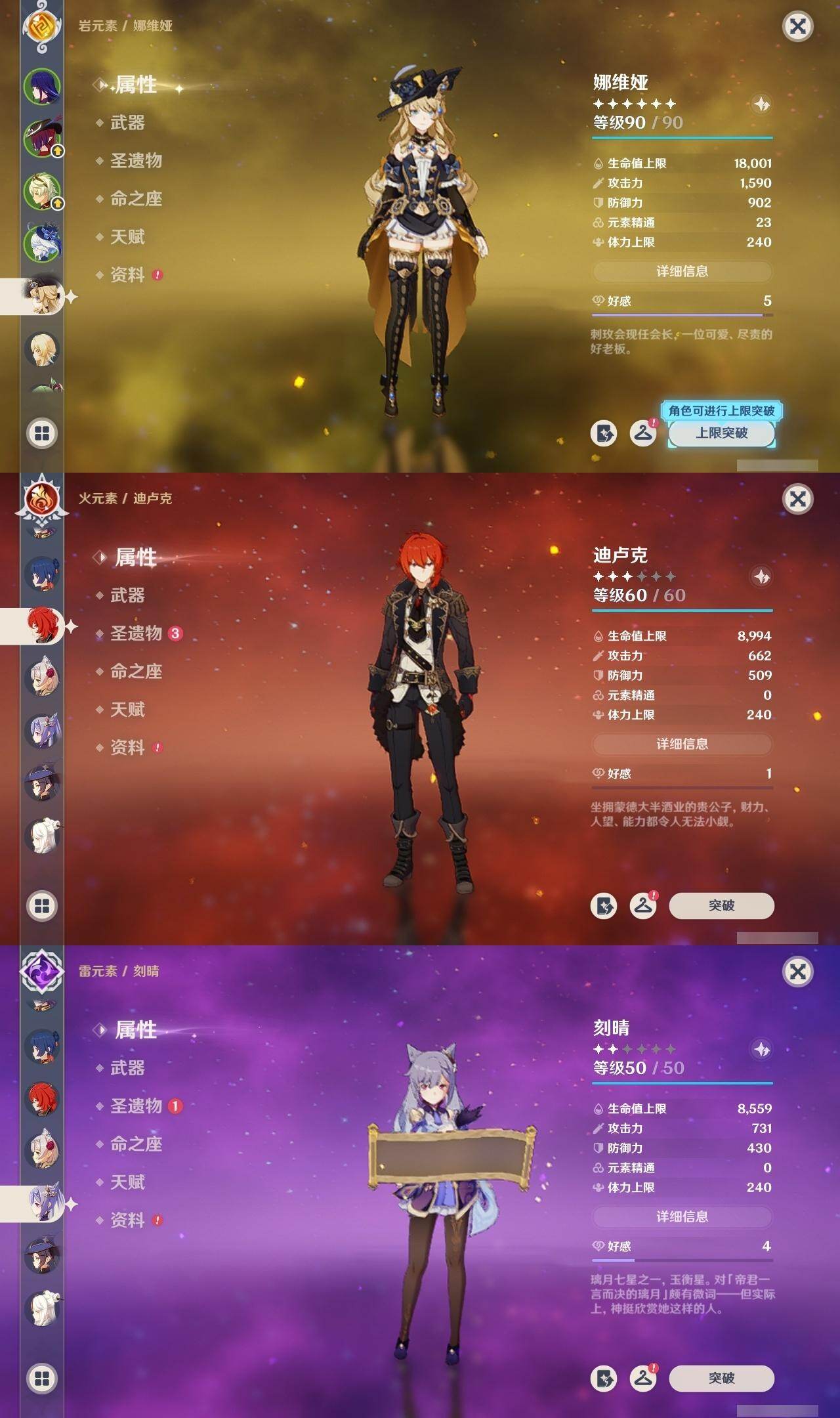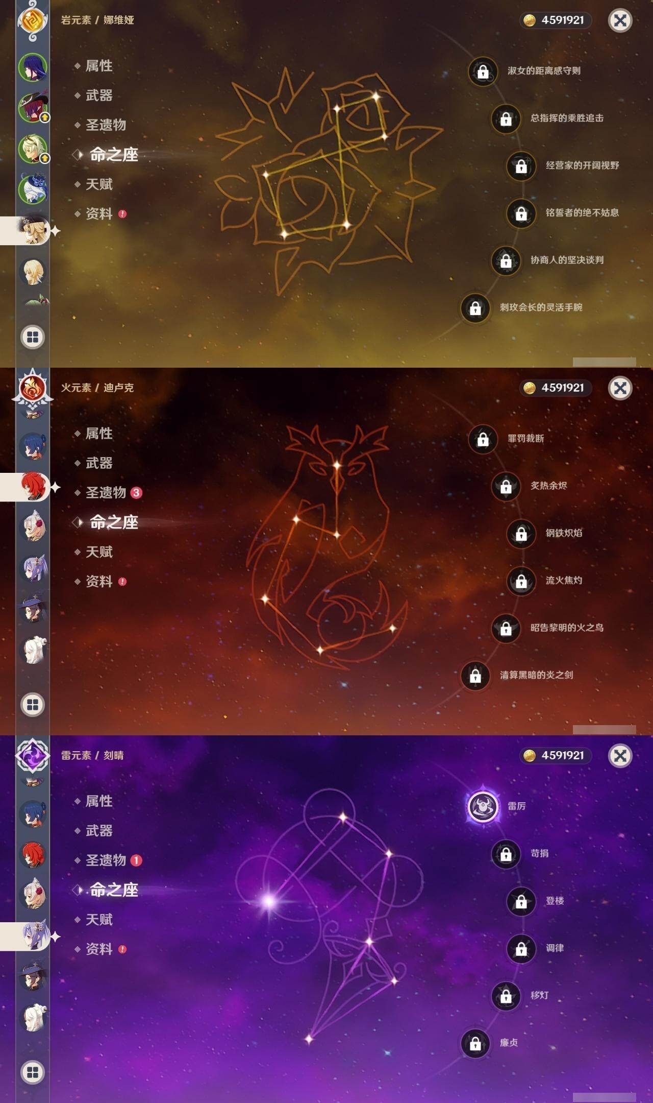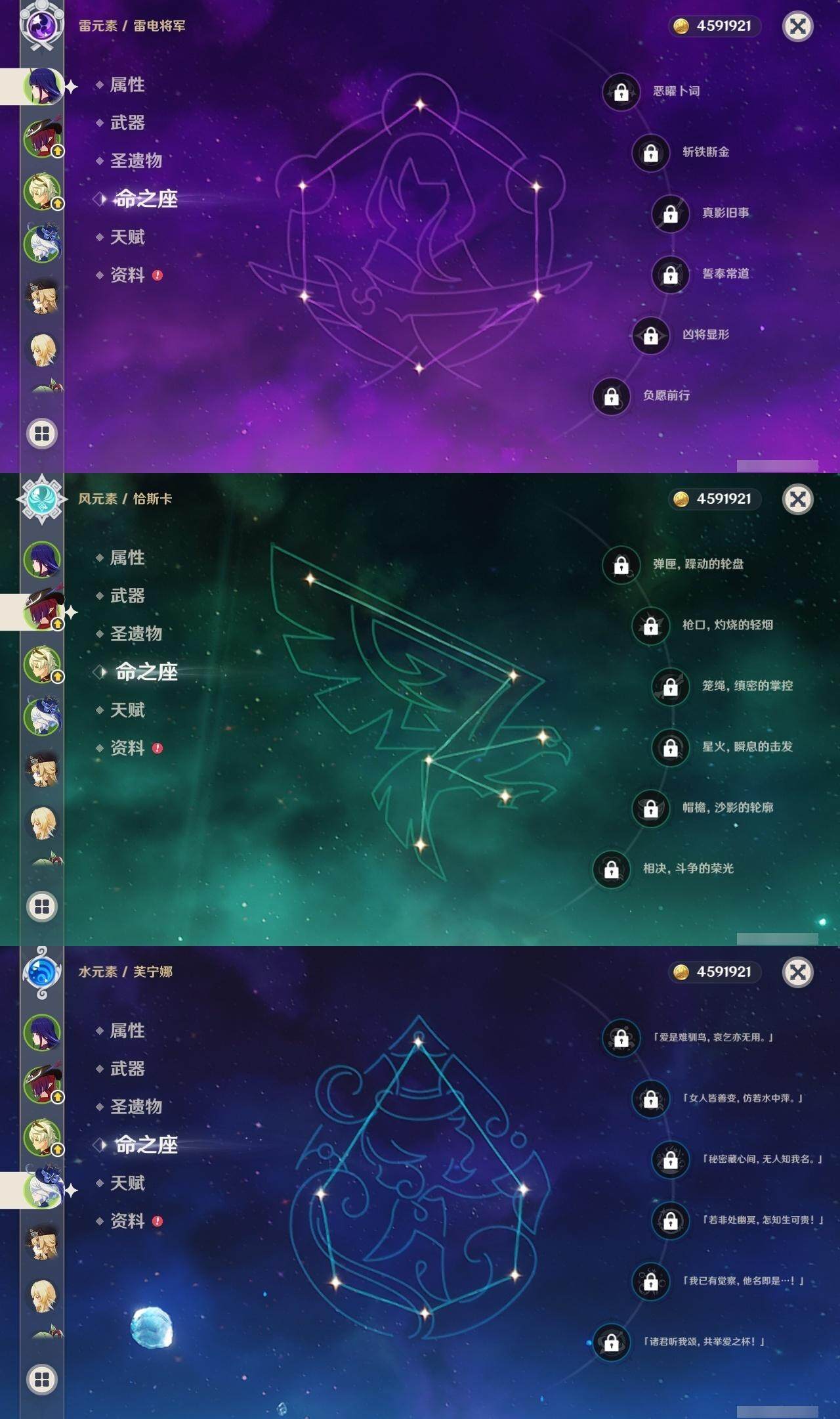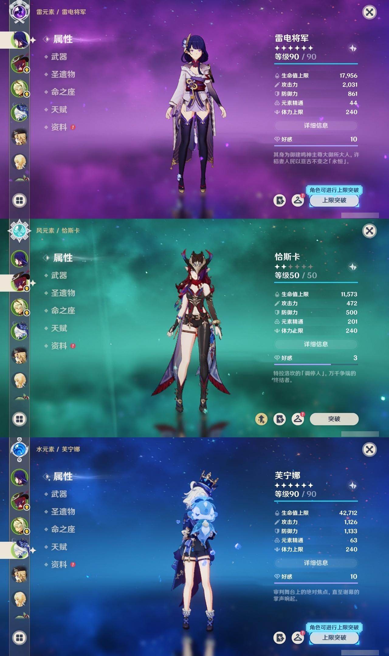 [14736174]56级/13黄/女主/10个五星角色/2个五星武器 0命娜维娅,0命芙宁娜,0命雷电将军,1命刻晴,0命七七,0命琴,0命莫娜,0命迪卢克,0命恰斯卡,0命梦见月瑞希,精1薙草之稻光,精1风鹰剑
