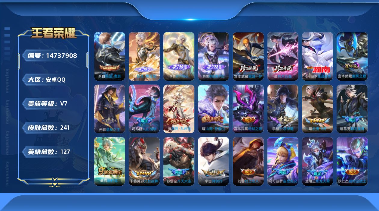 [14737908]按键4 安卓Q-241皮肤-1典藏皮肤-3无双-3珍品传说-16传说-66史诗