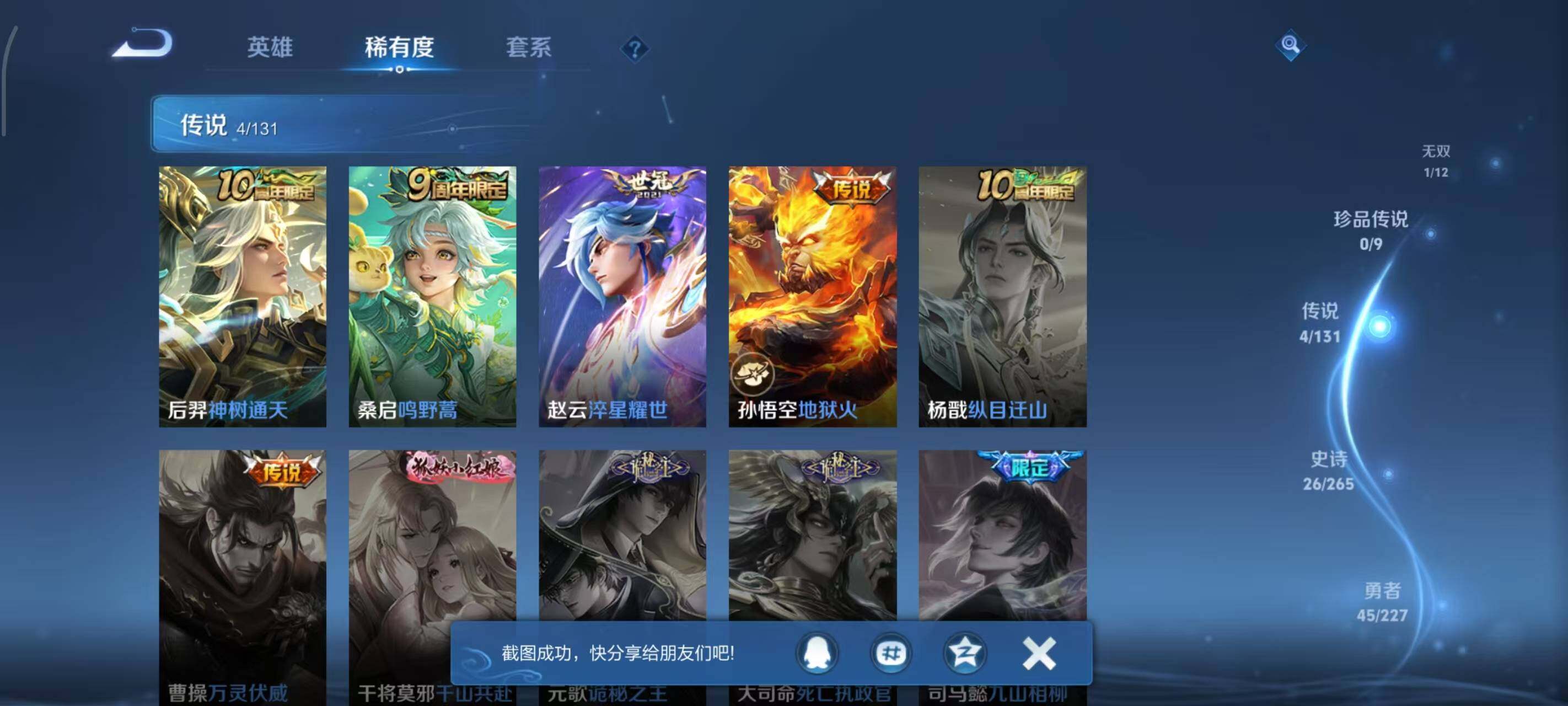 【传说皮肤】:后羿神树通天,桑启鸣野蒿,赵云淬星耀世,孙悟空地狱火