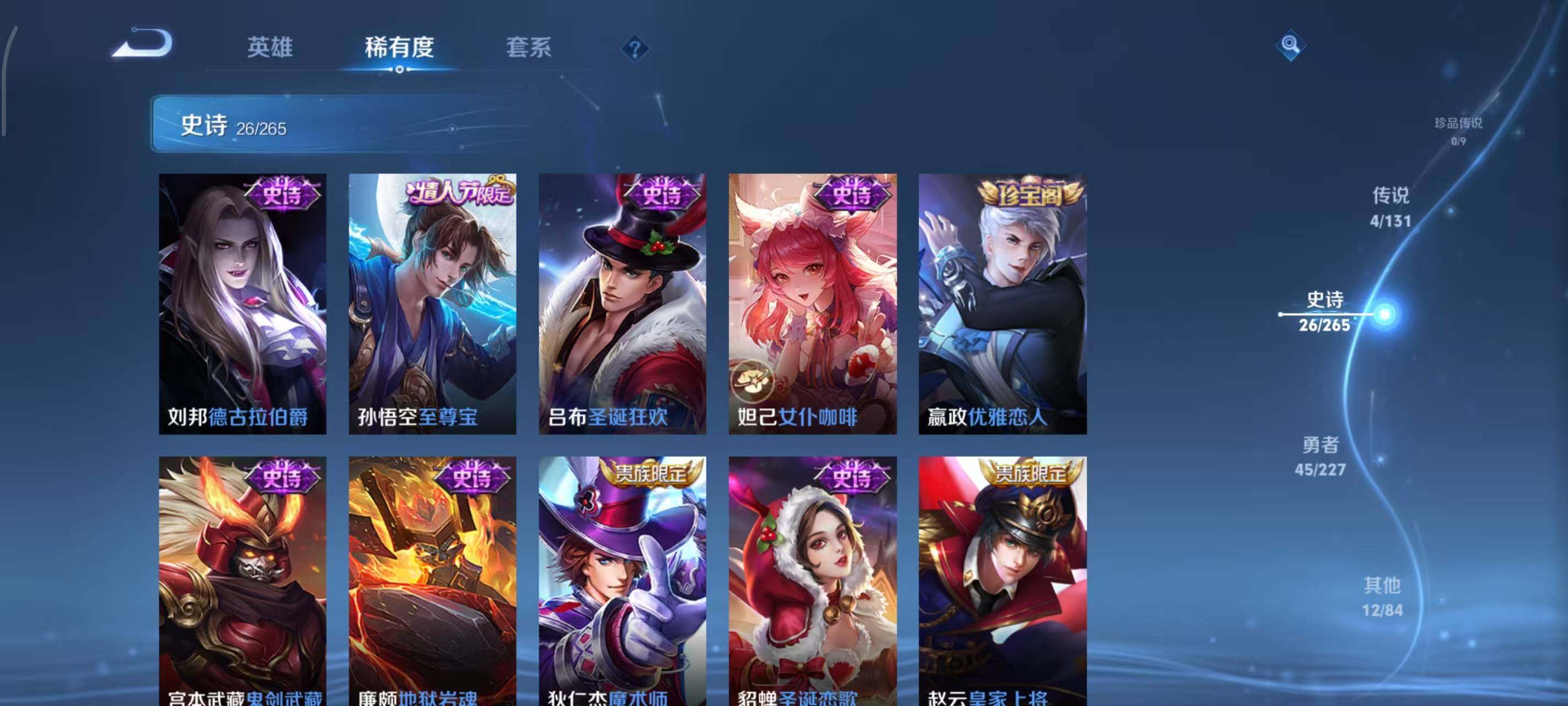【史诗皮肤】:鲁班七号电玩小子,赵云皇家上将,貂蝉圣诞恋歌,狄仁杰魔术师,廉颇地狱岩魂,宫本武藏鬼剑武藏,嬴政优雅恋人,妲己女仆咖啡,吕布圣诞狂欢,孙悟空至尊宝,刘邦德古拉伯爵,兰陵王暗隐猎兽者,亚瑟心灵战警,安琪拉心灵骇客,后羿辉光之辰,铠曙光守护者,白起星夜王子,阿轲节奏热浪,孙策猫狗日记,妲己时之彼端,裴擒虎李小龙,镜匿光追影者,鬼谷子五谷丰年,阿古朵江河有灵,女娲万灵启世,少司缘巫礼祀神