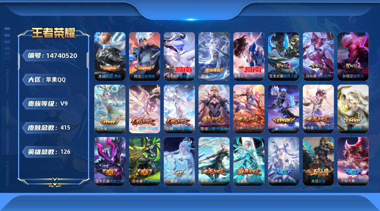 - PX_2088715- 包人脸 V8 贵族积分91115 苹果QQ/ 347皮肤/ 124英雄 【1 星传说皮肤】,未来机甲 孙尚香, 【3 珍品传说】,怪盗基德 马可波罗,时之奇旅 孙策,江户川柯南 鲁班七号, 【3 典藏皮肤】,全息碎影 孙悟空,弑枪猎影 韩信,赤影疾锋 关羽, 【14 传说皮肤】,启明星使 虞姬,云鹰飞将 曜,齐天大圣 孙悟空,诗剑行 李白,燃星之曲 花木兰,黄金射手座 后