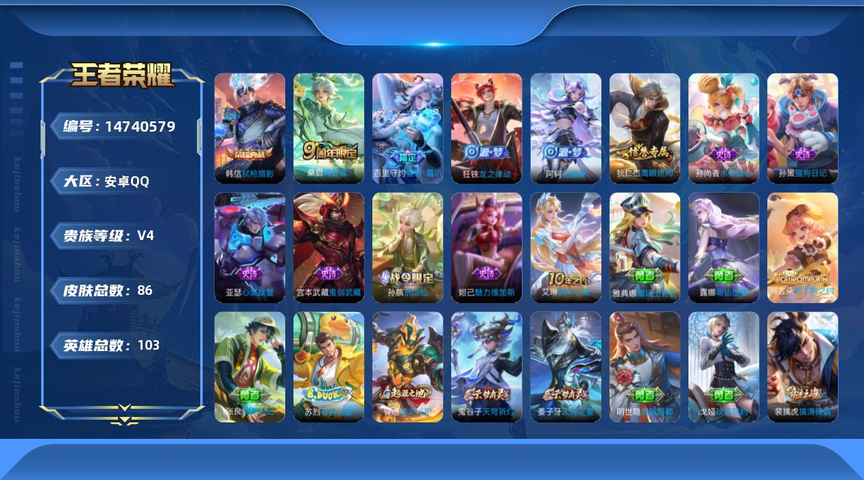 [14740579]可二次【店主推荐捡漏号!可直接换绑】 安卓Q-V4-最强王者段位-103英雄-86皮肤-1典藏皮肤-1传说-10史诗