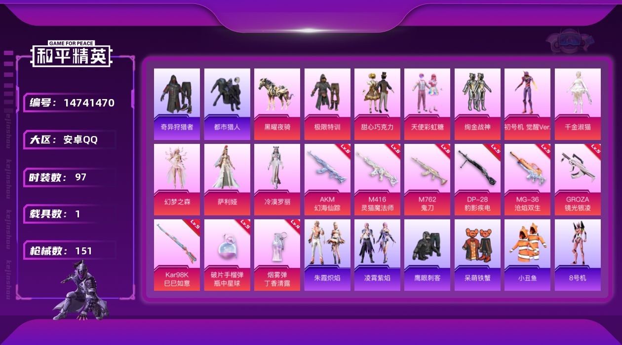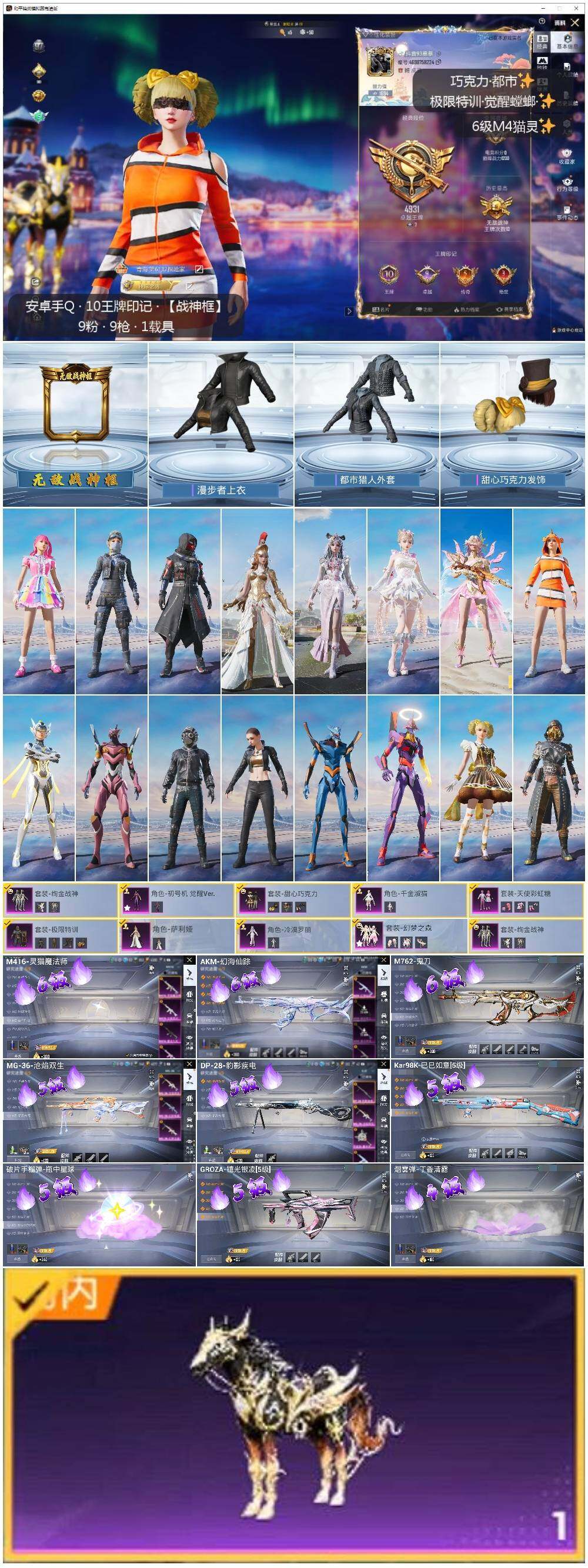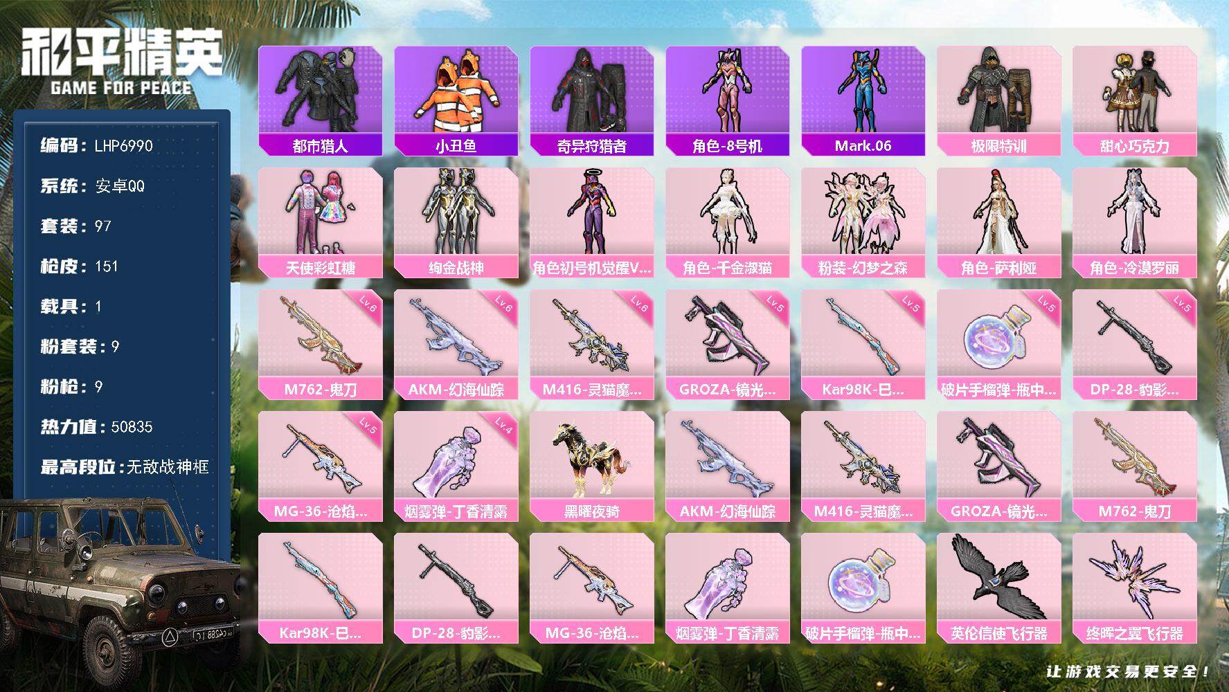 [14741470]可二次【店主推荐捡漏号!可直接换绑】/素材身法号/无敌战神框1/绝世印记3/地铁满天赋 安卓 手Q-无敌战神框-9粉装-9特效枪-1载具-5粉色飞行器-5w热力值-10王牌印记-97套装-151枪皮【热门品类】:套装-都市猎人,套装-小丑鱼,套装-奇异狩猎者,角色-8号机,角色-Mark.06【粉色套装】:粉装-极限特训,粉装-甜心巧克力,粉装-天使彩虹糖,粉装-绚金战神,角色-初号机 觉醒Ver.,角色-千金淑猫,粉装-幻梦之森,角色-萨利娅,角色-冷漠罗丽【粉色枪皮等级】:AKM-幻海仙踪(六级),M416-灵猫魔法师(六级),GROZA-镜光银凌(五级),M762-鬼刀(六级),Kar98K-巳巳如意(五级),DP-28-豹影疾电(五级),MG-36-沧焰双生(五级),烟雾弹-丁香清露(四级),破片手榴弹-瓶中星球(五级)【粉色载具】:黑曜夜骑【粉色飞行器】:英伦信使飞行器,终晖之翼飞行器,灵猫魔法师飞行器