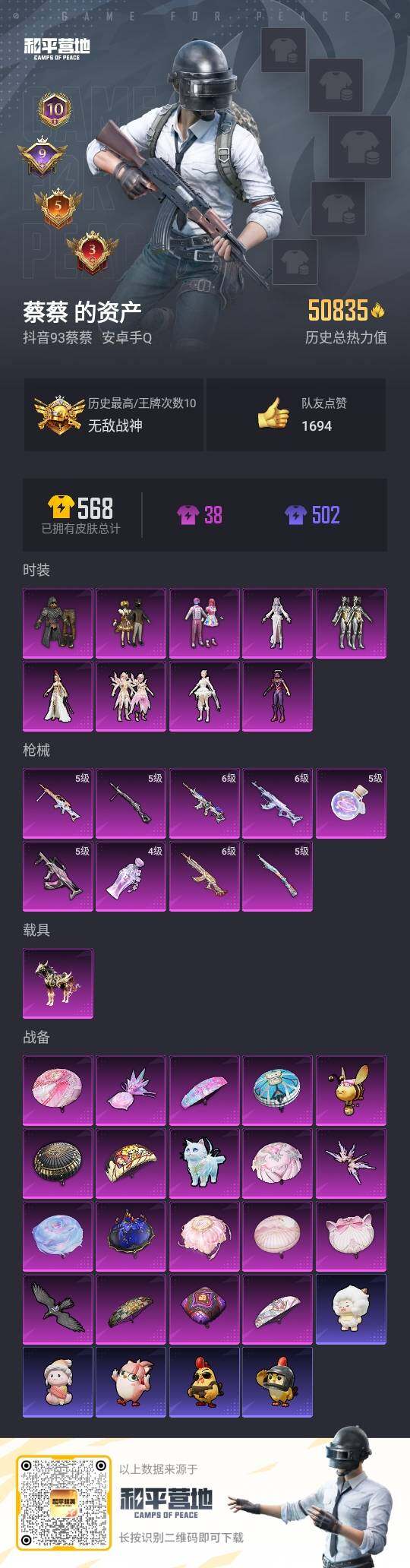- [15226331]【暑期末清货/特价急出/永久包赔】:苹果 手Q-2粉装-2特效枪-1载具-1.1w热力值-0印记-19套装-33枪皮【稀有载具】:盛世惊鸿摩托车【特效枪等级】:Kar98K-巳巳如意(三级),SVD-月影灵韵(四级)【优质套装】:粉装-闲梦青缨,角色-萨利娅【优质飞行器】:酣梦熊熊飞行器,凤舞九天飞行器