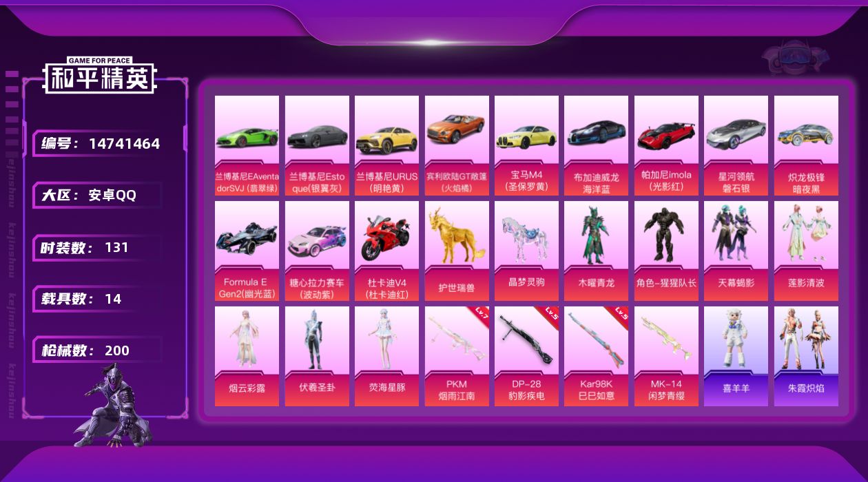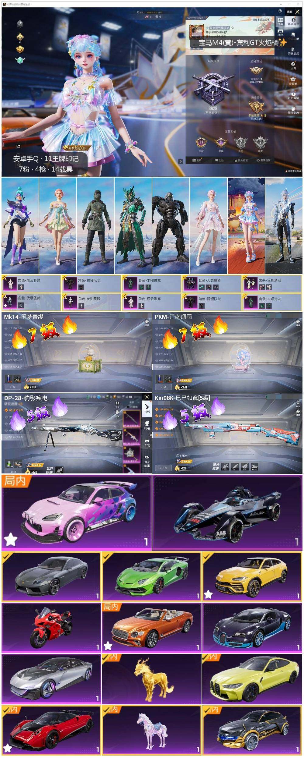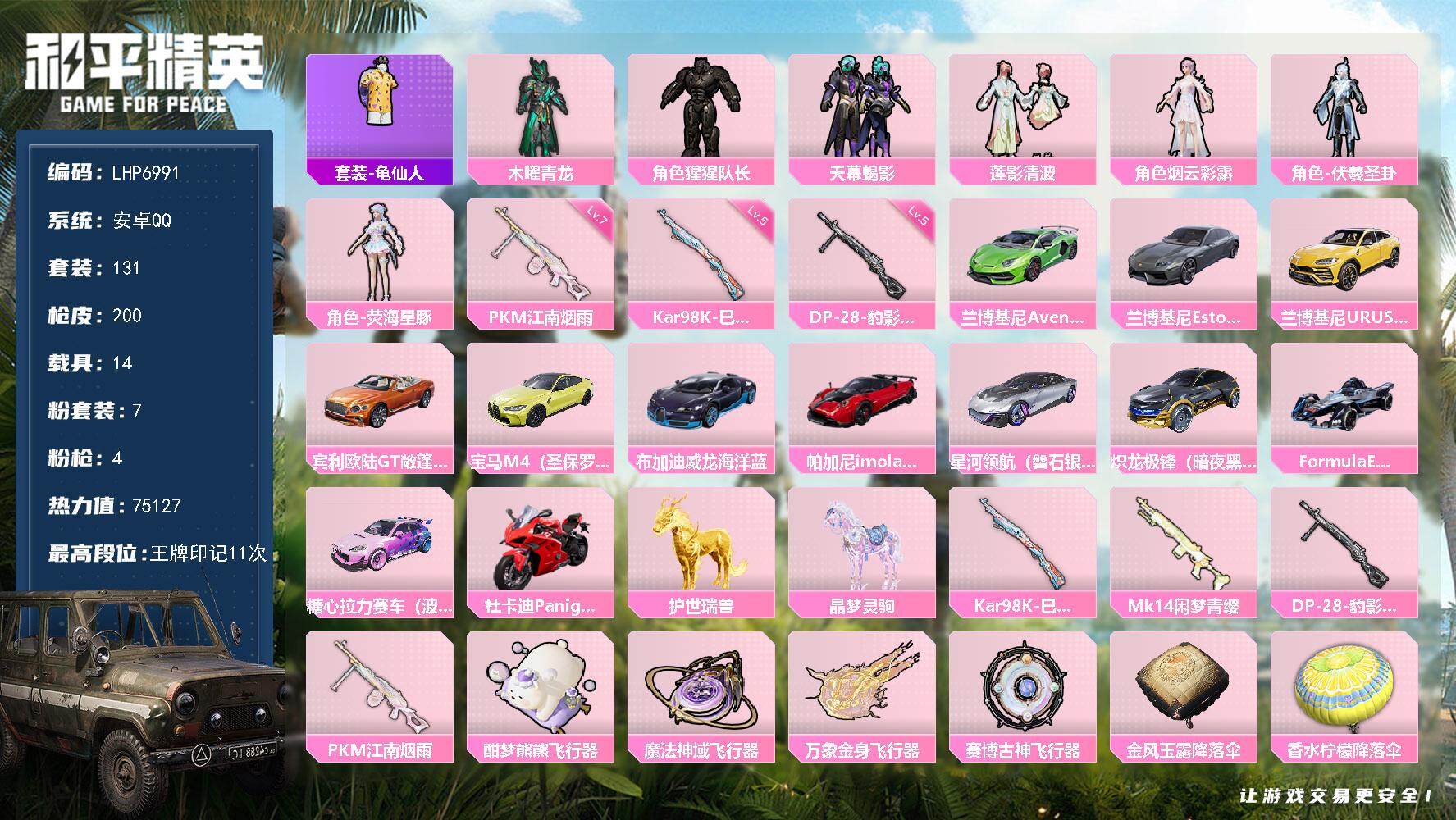 [14741464]可二次【店主推荐捡漏号!可直接换绑】/素材身法号 安卓 手Q-7粉装-4特效枪-14载具-5粉色飞行器-7.5w热力值-11王牌印记-131套装-200枪皮【热门品类】:套装-龟仙人【粉色套装】:粉装-木曜青龙,角色-猩猩队长,粉装-天幕蝎影,粉装-莲影清波,角色-烟云彩露,角色-伏羲圣卦,角色-荧海星豚【粉色枪皮等级】:Kar98K-巳巳如意(五级),DP-28-豹影疾电(五级),PKM-江南烟雨(七级)【粉色载具】:兰博基尼Aventador SVJ(翡翠绿),兰博基尼Estoque(银翼灰),兰博基尼URUS(明艳黄),宾利欧陆GT敞篷(火焰橘),宝马M4(圣保罗黄),布加迪威龙(海洋蓝),帕加尼imola(光影红),星河领航(磐石银),炽龙极锋(暗夜黑),Formula E Gen2(幽光蓝),糖心拉力赛车(波动紫),杜卡迪 Panigale V4(杜卡迪红),护世瑞兽,晶梦灵驹【粉色飞行器】:酣梦熊熊飞行器,魔法神域飞行器,万象金身飞行器,赛博古神飞行器