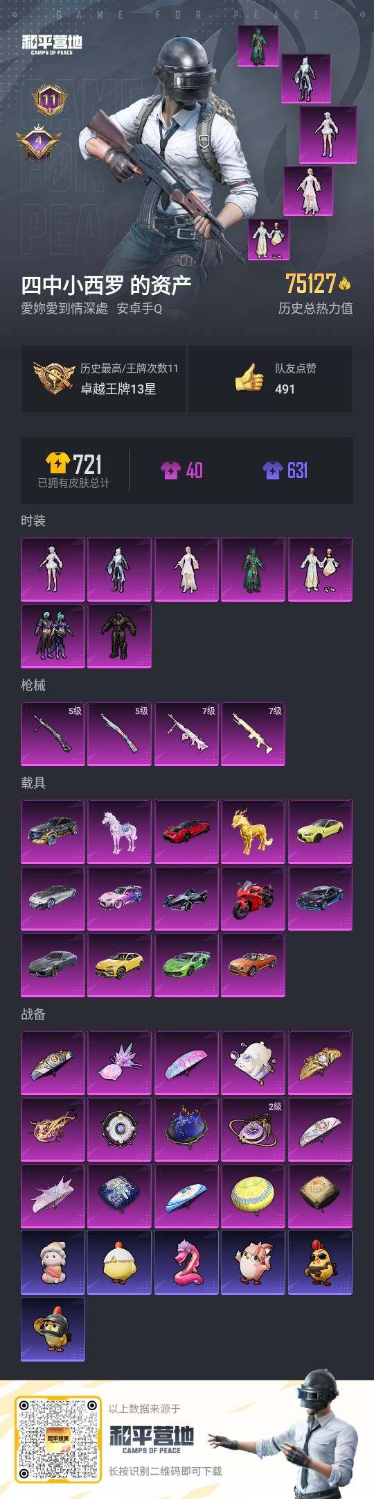 - PX_2102971- 苹果手Q-10王牌印记-10粉装-7特效枪-1载具-84921热力值-221套装-261枪皮-0卓越印记-0传奇印记 【10粉装】,梦幻火箭,千金淑猫,蓝莓炮弹,甜心娃娃,精灵娃娃,酣梦娃娃,冰霜白皇,炙焰红王,青葱仙萝,星之彼岸 【7特效枪】SCAR-L-童趣迷兔-6级 M416-暖熊萌萌-7级 M416-风花雪月-1级 M762-甜蜜誓约-7级 M762-甜心娃娃-1级