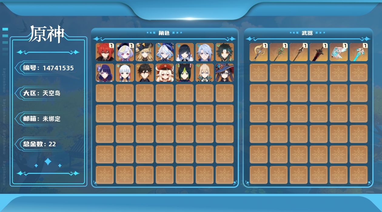 0命娜维娅,0命芙宁娜,0命提纳里,0命夜兰,0命神里绫人,0命雷电将军,0命神里绫华,0命钟离,0命魈,0命可莉,1命七七,0命琴,0命莫娜,1命迪卢克,精1裁断,精1和璞鸢,精1贯虹之槊,精1天空之刃,精1天空之卷,精1狼的末路