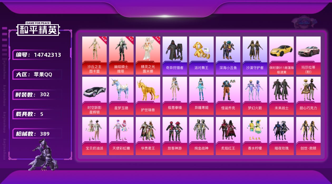 - PX_2106504- 苹果手Q-17王牌印记-6粉装-9特效枪-1载具-76655热力值-152套装-230枪皮-3卓越印记-0传奇印记 【6粉装】,海渊国主,炫光之旅,银刃赛罗,冰霜白皇,蜜桃特工,幻影战神 【9特效枪】AKM-炫紫旋律-7级 SCAR-L-纯梦嫁纱-7级 M416-五爪金龙-7级 M416-心之恋语-3级 GROZA-镜光银凌-5级 M762-甜蜜誓约-5级 Kar98K-巳