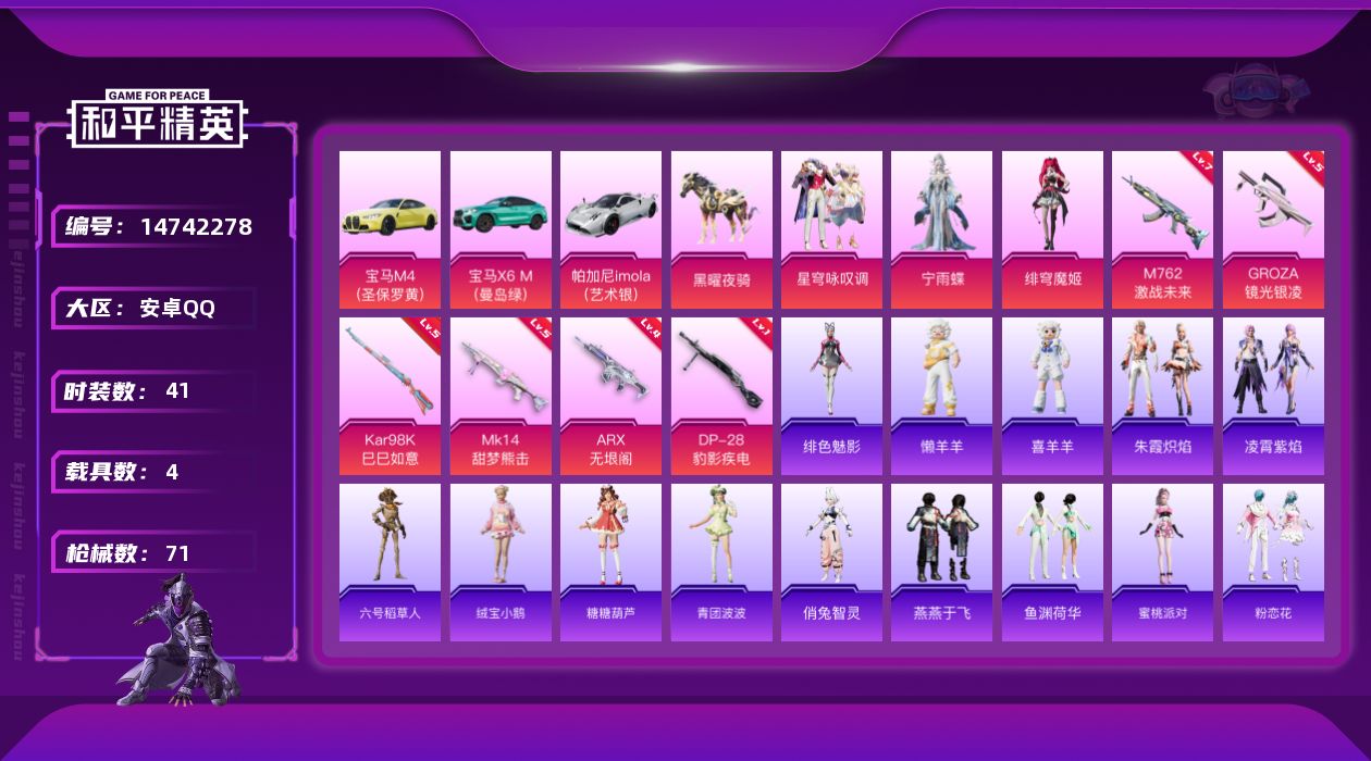 [14742278]可二次【店主推荐捡漏号!可直接换绑】/素材身法号 安卓 手Q-4粉装-6特效枪-4载具-1粉色飞行器-2.7w热力值-4王牌印记-41套装-71枪皮【热门品类】:角色-六号稻草人【粉色套装】:粉装-星穹咏叹调,角色-宁雨蝶,角色-绯穹魔姬【粉色枪皮等级】:GROZA-镜光银凌(五级),M762-激战未来(七级),ARX-无垠阁(四级),Kar98K-巳巳如意(五级),Mk14-甜梦熊击(五级),DP-28-豹影疾电(一级)【粉色载具】:宝马M4(圣保罗黄),宝马X6 M(曼岛绿),帕加尼imola(艺术银),黑曜夜骑【粉色飞行器】:灵猫魔法师飞行器