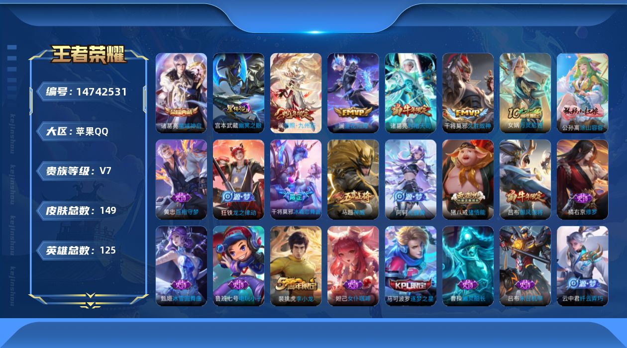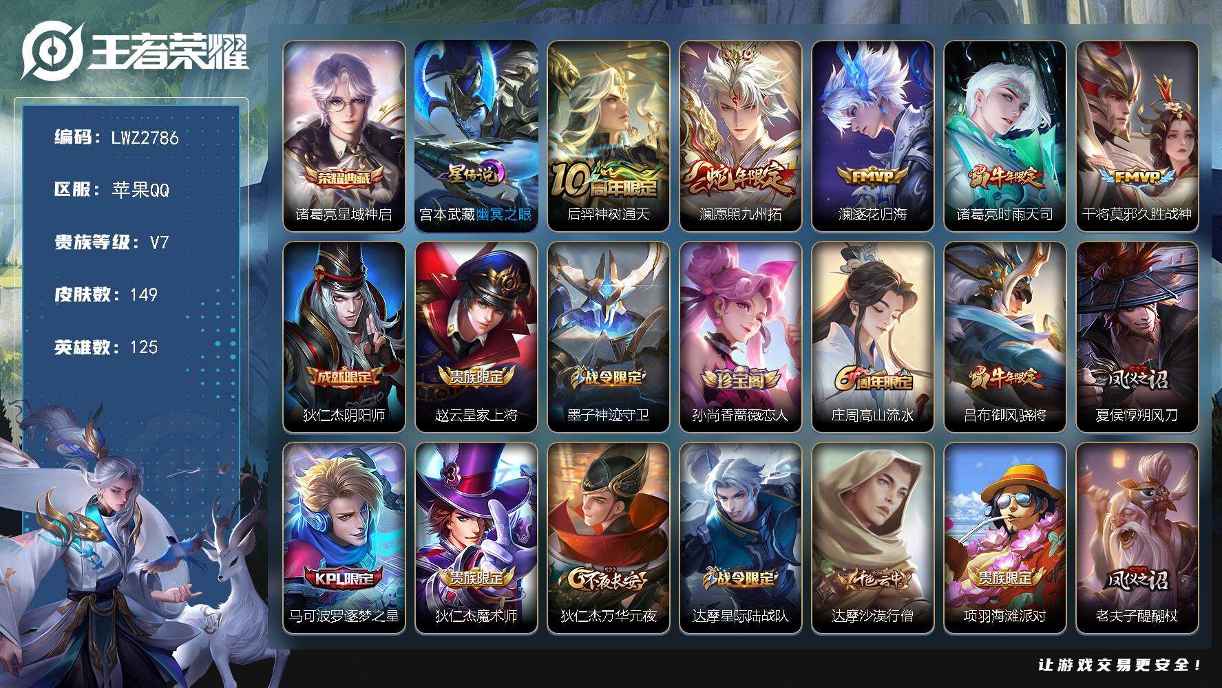 [14742531]【店主推荐捡漏号!可直接换绑】苹果Q-V7-最强王者段位-125英雄-149皮肤-1典藏皮肤-5传说-44史诗-1星元