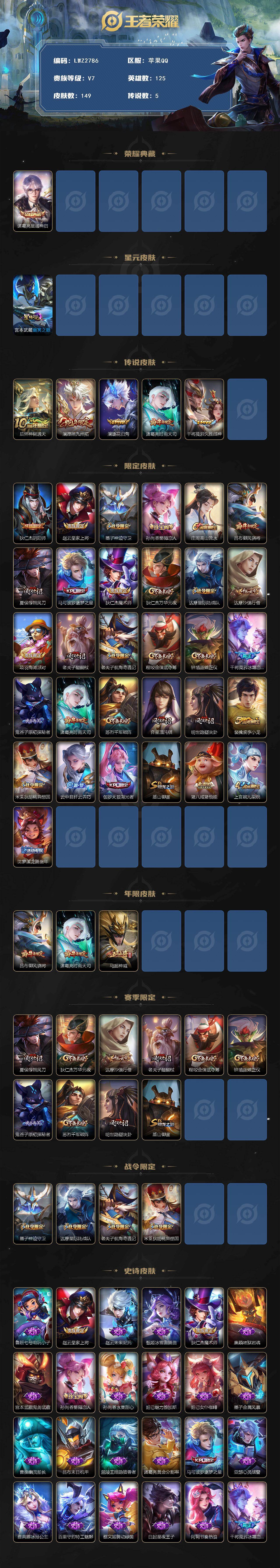 [14742531]【店主推荐捡漏号!可直接换绑】苹果Q-V7-最强王者段位-125英雄-149皮肤-1典藏皮肤-5传说-44史诗-1星元 【荣耀典藏】:诸葛亮星域神启 【传说皮肤】:后羿神树通天,澜愿照九州拓,澜逐花归海,诸葛亮时雨天司,干将莫邪久胜战神 【限定皮肤】:狄仁杰阴阳师,赵云皇家上将,墨子神迹守卫,孙尚香蔷薇恋人,庄周高山流水,吕布御风骁将,夏侯惇朔风刀,马可波罗逐梦之星,狄仁杰魔术师,狄仁杰万华元夜,达摩星际陆战队,达摩沙漠行僧,项羽海滩派对,老夫子醍醐杖,老夫子航海奇遇记,程咬金演武夺筹,钟馗驱傩正仪,干将莫邪冰霜恋舞曲,鬼谷子原初探秘者,诸葛亮时雨天司,苏烈千军破阵,弈星混沌棋,明世隐疑决卦,裴擒虎李小龙,米莱狄胡桃异想国,云中君纤云弄巧,伽罗天狼溯光者,盾山御銮,猪八戒猪悟能,上官婉儿梁祝,沈梦溪龙舞盛年 【年限皮肤】:吕布御风骁将,诸葛亮时雨天司,马超神威 【赛季限定】:夏侯惇朔风刀,狄仁杰万华元夜,达摩沙漠行僧,老夫子醍醐杖,程咬金演武夺筹,钟馗驱傩正仪,鬼谷子原初探秘者,苏烈千军破阵,弈星混沌棋,明世隐疑决卦,盾山御銮 【战令限定】:墨子神迹守卫,达摩星际陆战队,老夫子航海奇遇记,米莱狄胡桃异想国 【史诗皮肤】:鲁班七号电玩小子,赵云皇家上将,赵云未来纪元,甄姬冰雪圆舞曲,狄仁杰魔术师,廉颇地狱岩魂,宫本武藏鬼剑武藏,孙尚香蔷薇恋人,孙尚香水果甜心,妲己魅力维加斯,妲己女仆咖啡,墨子金属风暴,曹操幽灵船长,吕布末日机甲,兰陵王暗隐猎兽者,诸葛亮黄金分割率,马可波罗逐梦之星,亚瑟心灵战警,雅典娜冰冠公主,百里守约特工魅影,蔡文姬舞动绿茵,白起星夜王子,阿轲节奏热浪,干将莫邪冰霜恋舞曲,狄仁杰鹰眼统帅,上官婉儿梁祝,橘右京修罗,马超神威,裴擒虎李小龙,云中君纤云弄巧,吕布御风骁将,米莱狄胡桃异想国,老夫子航海奇遇记,伽罗天狼溯光者,杨戬天秀启明,猪八戒猪悟能,庄周高山流水,牛魔星界战将,弈星万物之道,阿轲化蝶舞,狂铁龙之律动,黄忠百相守梦,公孙离涂山容容,女娲万灵启世 【其他皮肤】:项羽海滩派对,韩信教廷特使,韩信街头霸王,露娜哥特玫瑰,达摩大发明家,赵云白执事,白起白色死神,牛魔西部大镖客,扁鹊化身博士,宫本武藏未来纪元,安琪拉玩偶对对碰,孙膑天使之翼,典韦黄金武士,亚瑟死亡骑士,达摩拳王,花木兰兔女郎,刘备万事如意,宫本武藏万象初新,后羿阿尔法小队,狄仁杰