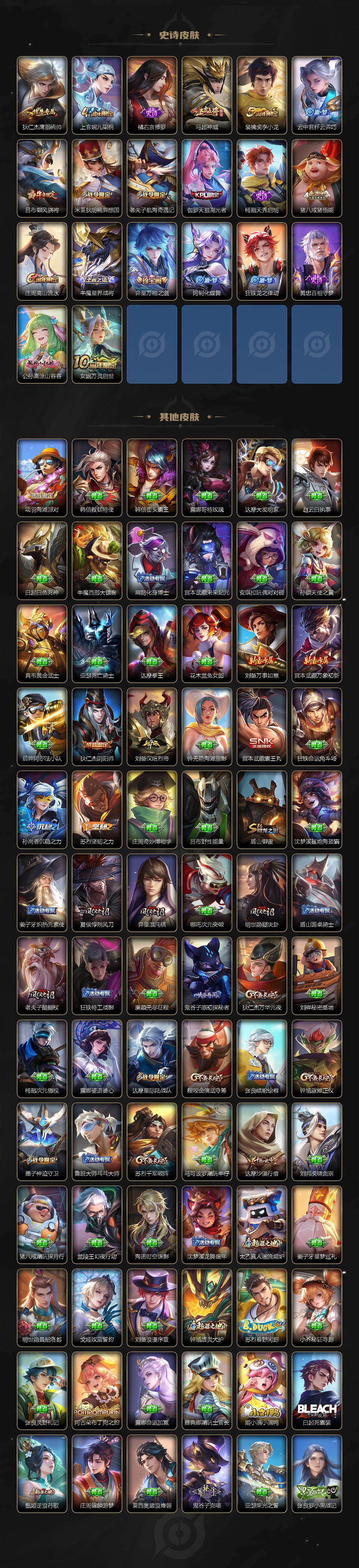 【史诗皮肤】:鲁班七号电玩小子,赵云皇家上将,赵云未来纪元,甄姬冰雪圆舞曲,狄仁杰魔术师,廉颇地狱岩魂,宫本武藏鬼剑武藏,孙尚香蔷薇恋人,孙尚香水果甜心,妲己魅力维加斯,妲己女仆咖啡,墨子金属风暴,曹操幽灵船长,吕布末日机甲,兰陵王暗隐猎兽者,诸葛亮黄金分割率,马可波罗逐梦之星,亚瑟心灵战警,雅典娜冰冠公主,百里守约特工魅影,蔡文姬舞动绿茵,白起星夜王子,阿轲节奏热浪,干将莫邪冰霜恋舞曲,狄仁杰鹰眼统帅,上官婉儿梁祝,橘右京修罗,马超神威,裴擒虎李小龙,云中君纤云弄巧,吕布御风骁将,米莱狄胡桃异想国,老夫子航海奇遇记,伽罗天狼溯光者,杨戬天秀启明,猪八戒猪悟能,庄周高山流水,牛魔星界战将,弈星万物之道,阿轲化蝶舞,狂铁龙之律动,黄忠百相守梦,公孙离涂山容容,女娲万灵启世