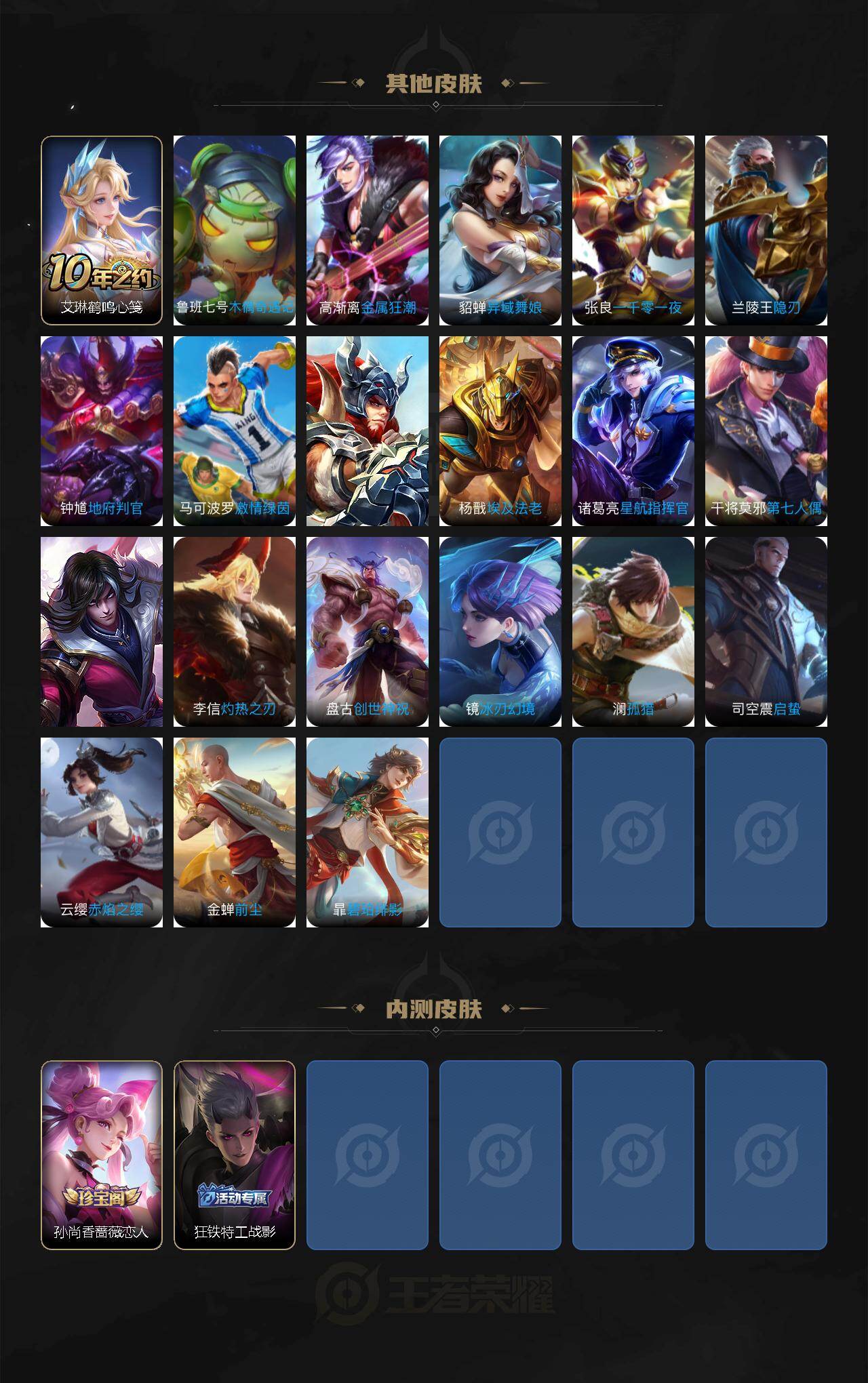 【其他皮肤】:项羽海滩派对,韩信教廷特使,韩信街头霸王,露娜哥特玫瑰,达摩大发明家,赵云白执事,白起白色死神,牛魔西部大镖客,扁鹊化身博士,宫本武藏未来纪元,安琪拉玩偶对对碰,孙膑天使之翼,典韦黄金武士,亚瑟死亡骑士,达摩拳王,花木兰兔女郎,刘备万事如意,宫本武藏万象初新,后羿阿尔法小队,狄仁杰