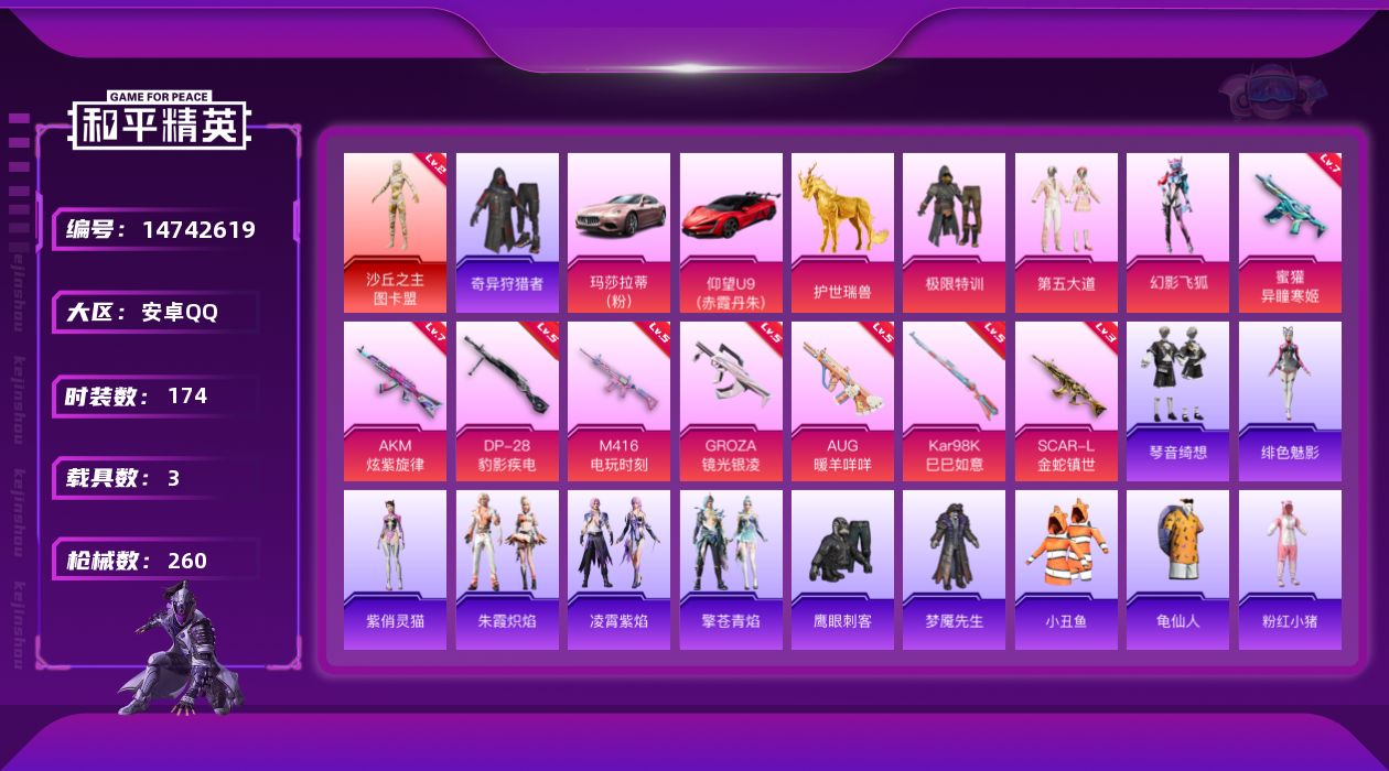 - PX_2100061- 苹果手Q-16王牌印记-5粉装-6特效枪-0载具-88849热力值-211套装-300枪皮-0卓越印记-0传奇印记 【5粉装】,洛天依,绯月迷踪,绯穹魔姬,银刃赛罗,星夜魔法师 【6特效枪】M416-五爪金龙-7级 Kar98K-巳巳如意-5级 汤姆逊-热量炸弹-5级 野牛-绯月迷踪-4级 镰刀-幽影之判-2级 平底锅-桃粉嫣然-3级 【6稀有紫装】,8号机,沙漠守护者,